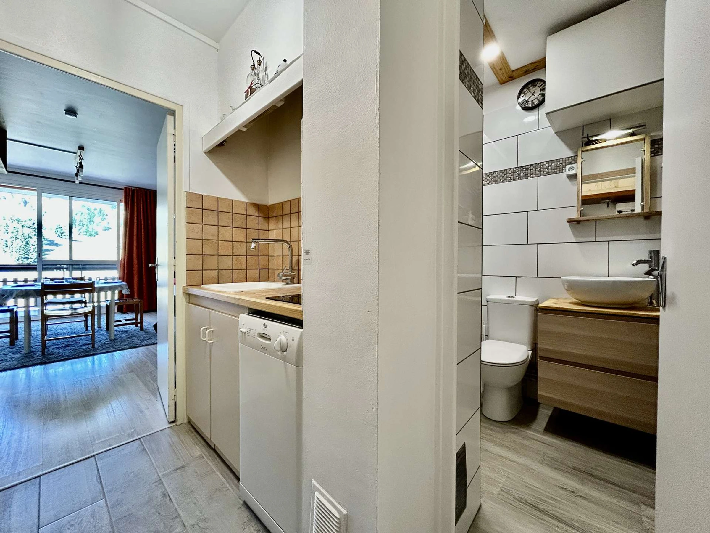 Il comprend une entrée desservant la salle d'eau / WC, une cuisine séparée avec un micro-ondes, deux plaques induction, cafetière électrique, lave-vaisselle......