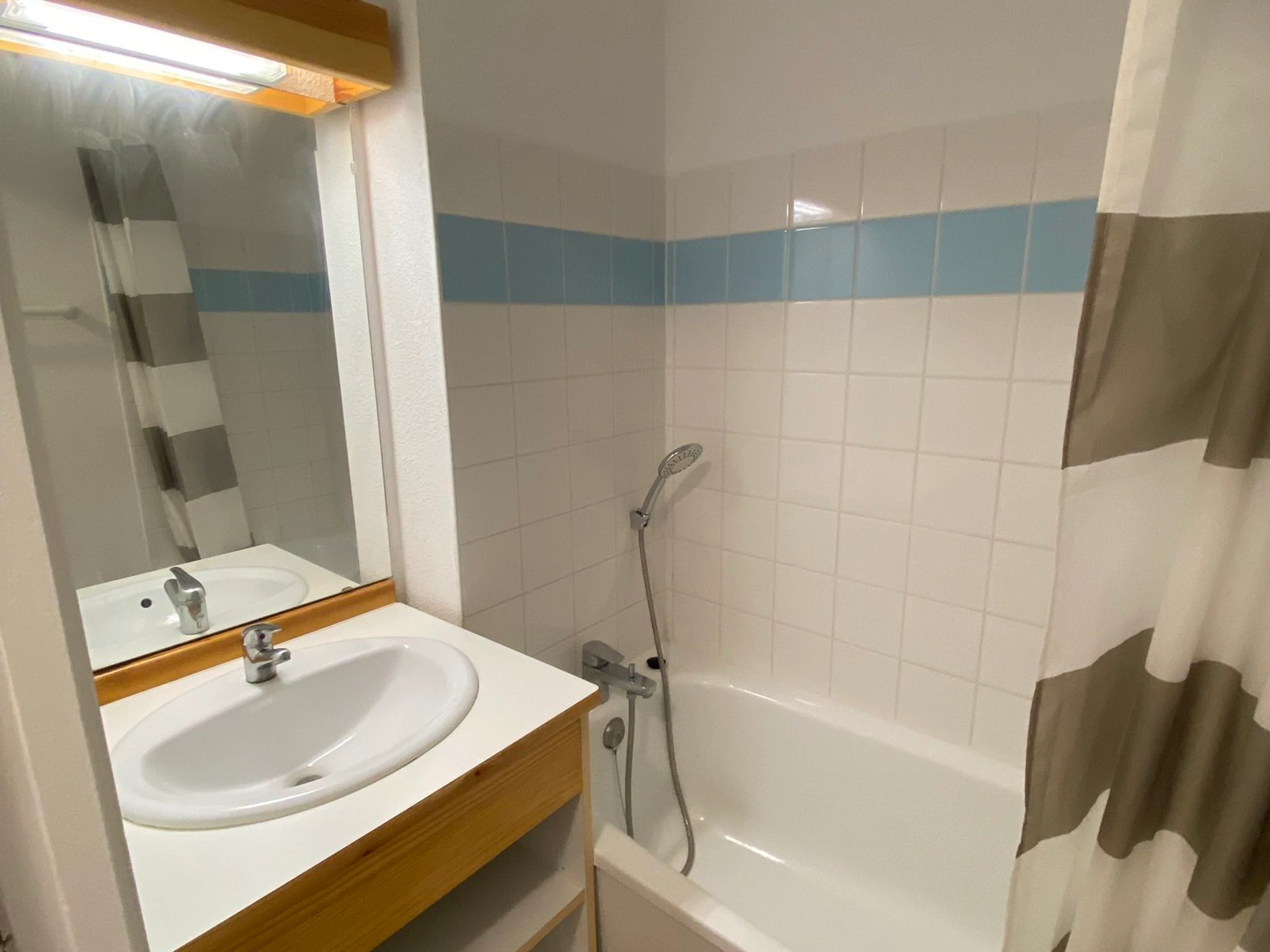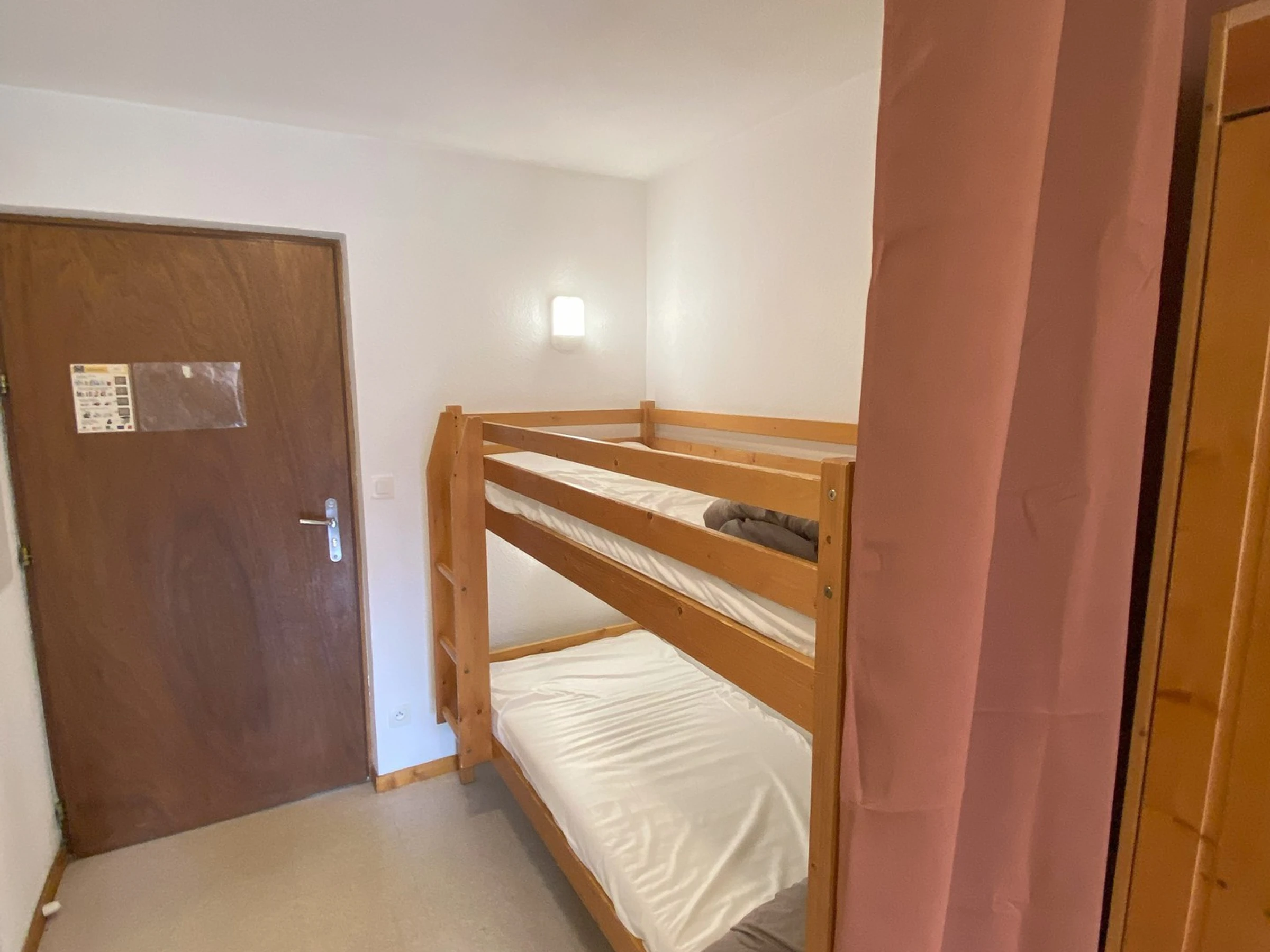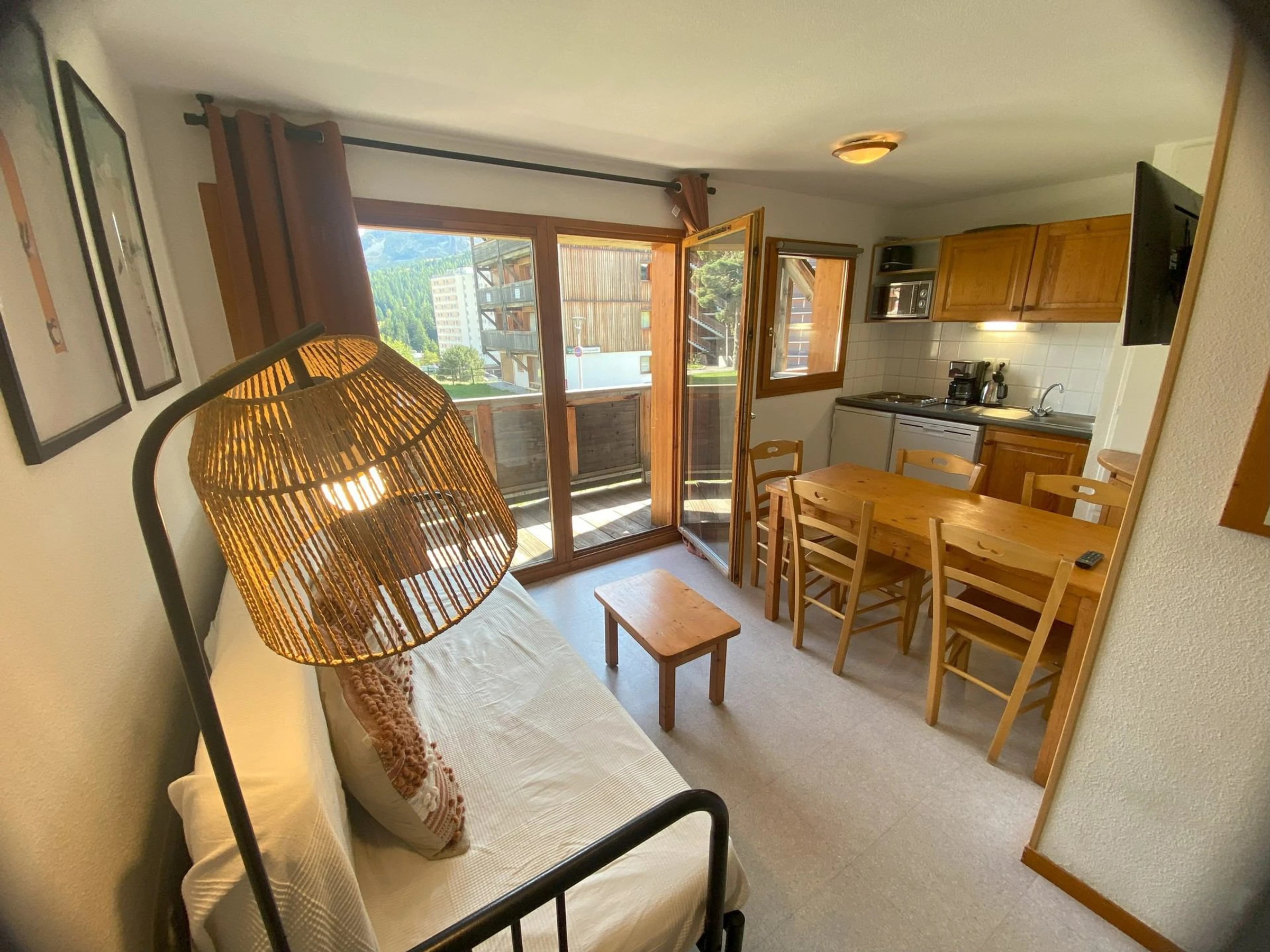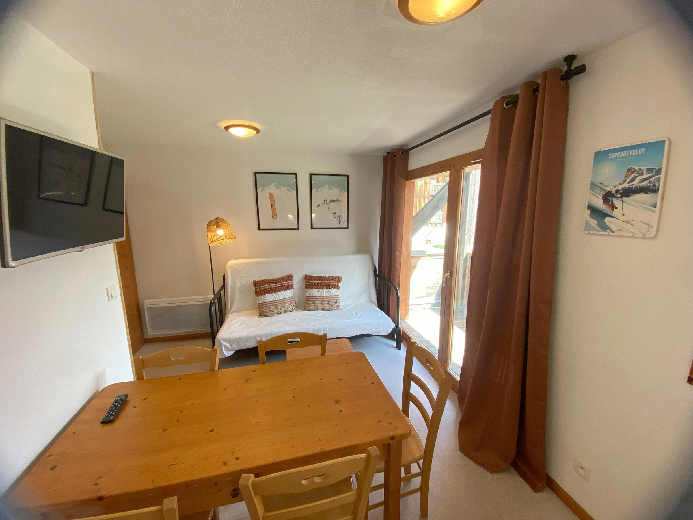 Séjour avec canapé lit. Coin montagne avec 2 lits superposés. Chambre avec 1 double. Appartement équipé de couettes (possibilité de location de housse de couette).