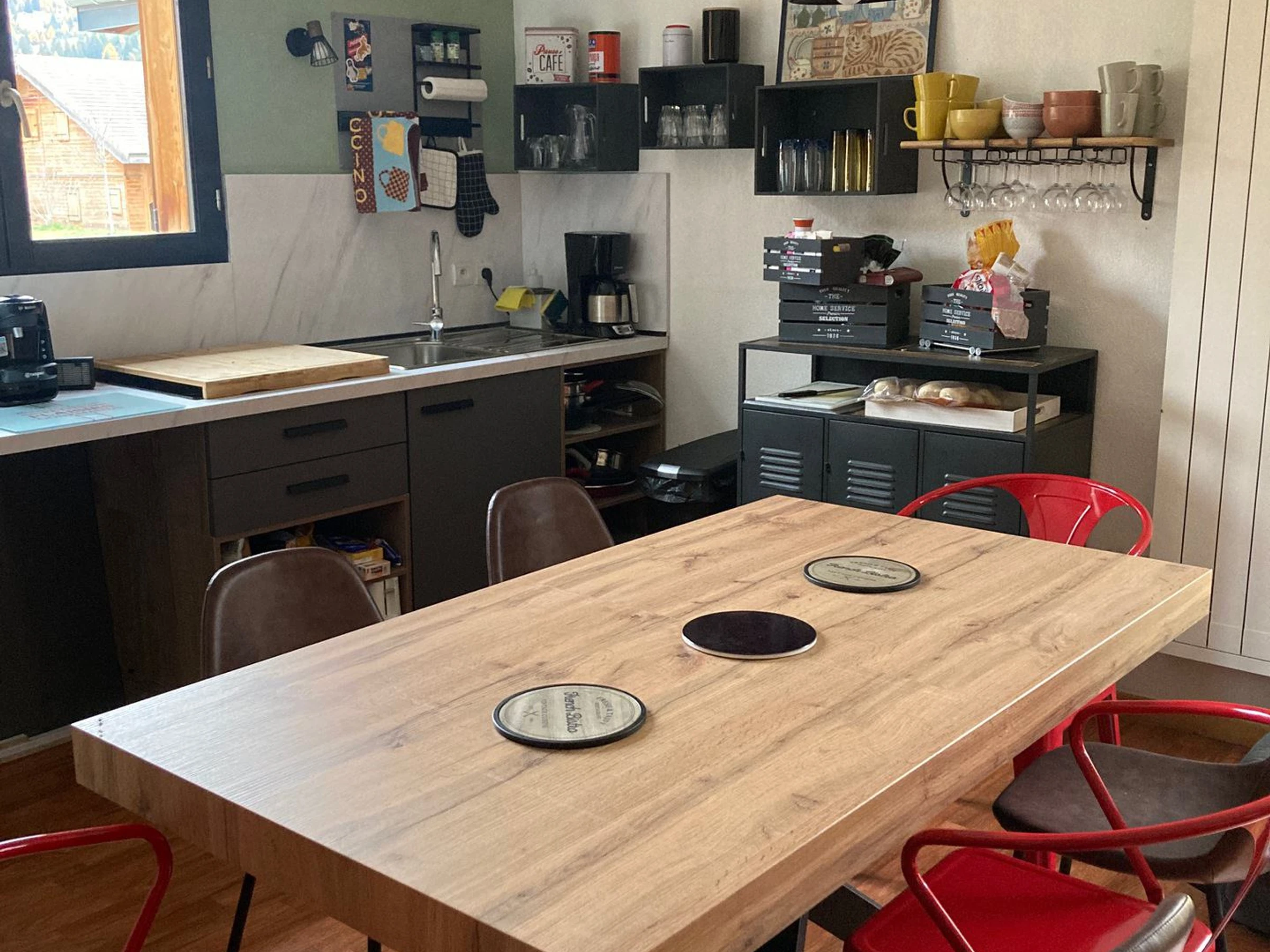 Coin cuisine équipée avec plaques vitro-céramiques, réfrigérateur, lave-vaisselle, micro-ondes, cafetière, cafetière TASSIMO, bouilloire, grille-pain, nécessaire de vaisselle.