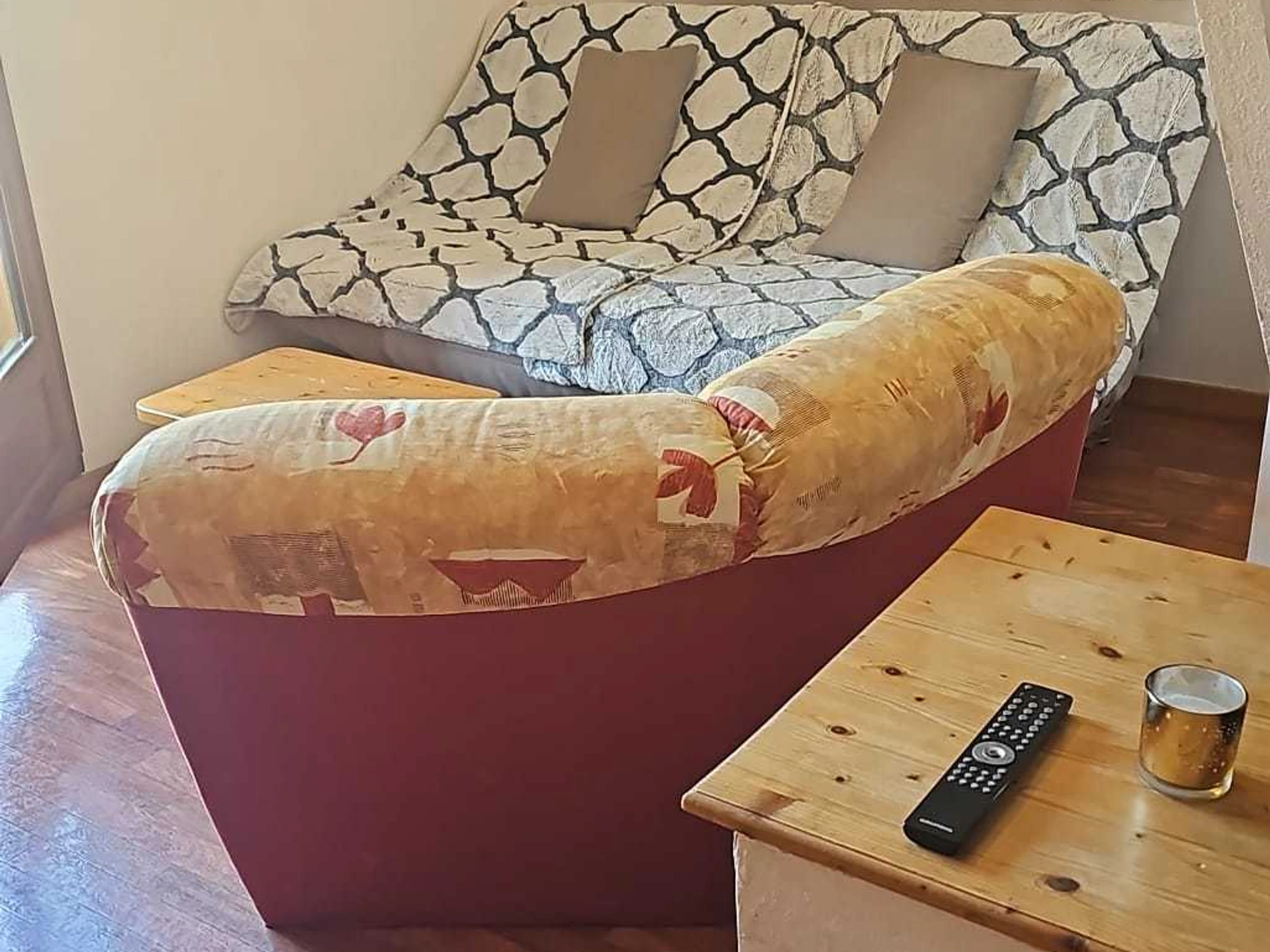 Pièce à vivre avec télévision, canapé-lit ,coin repas.