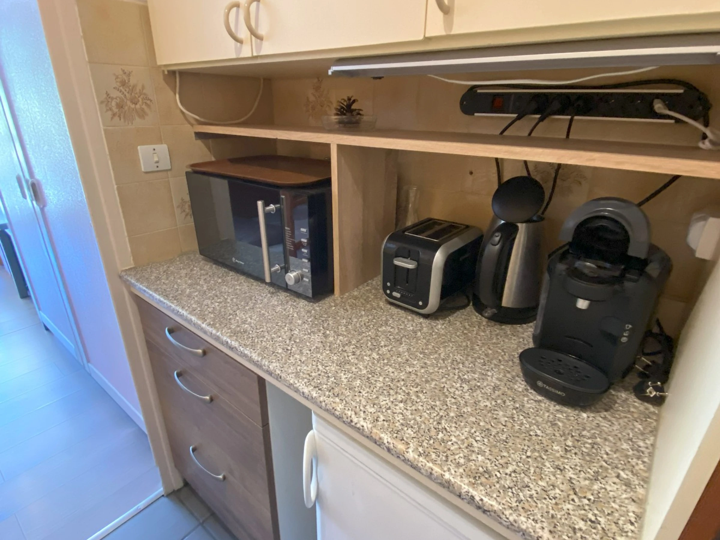 Kitchenette avec 2 plaques électriques, micro-ondes, bouilloire, toaster, cafetière Bosch Tassimo, réfrigérateur et lave-vaisselle.