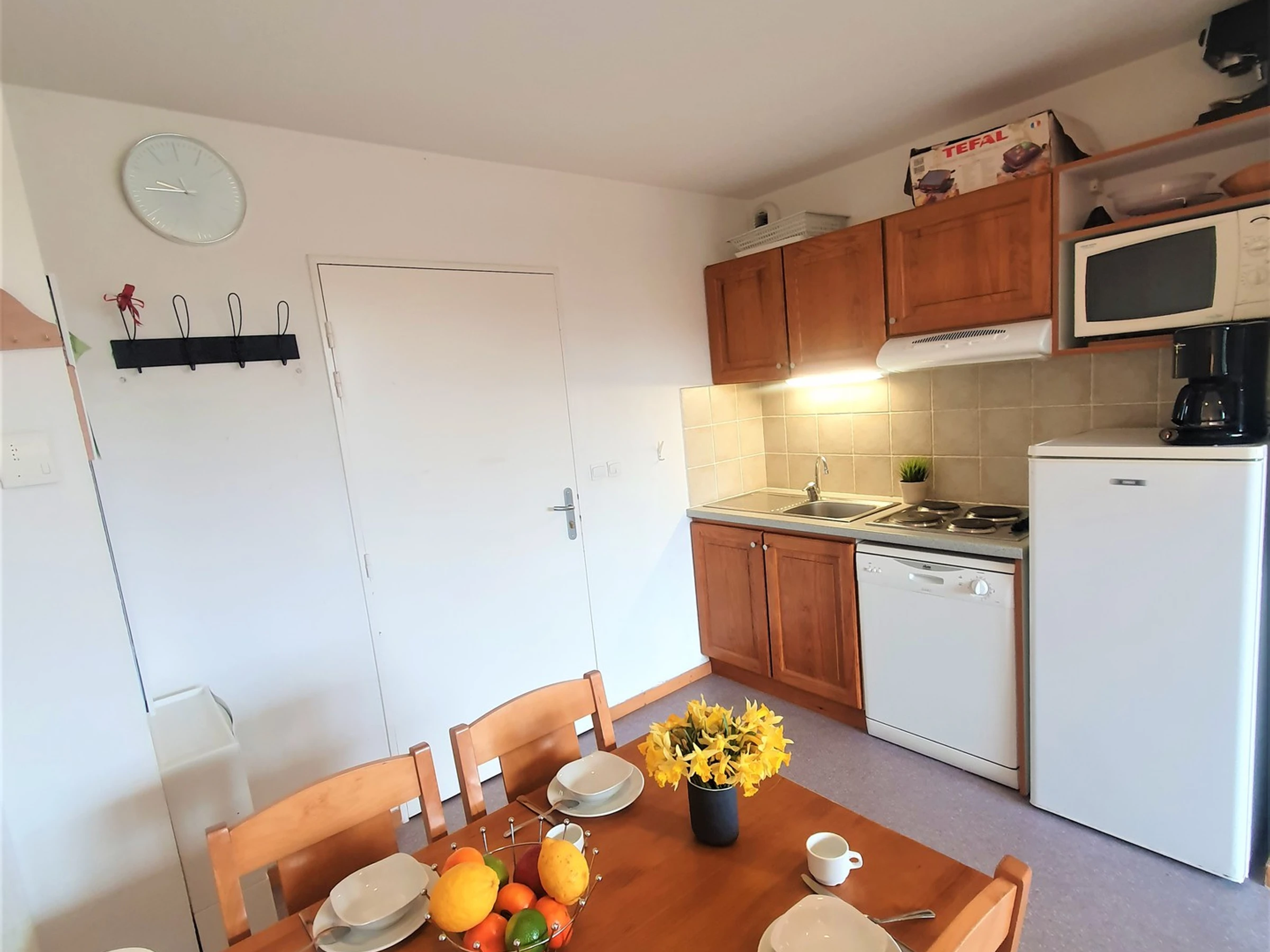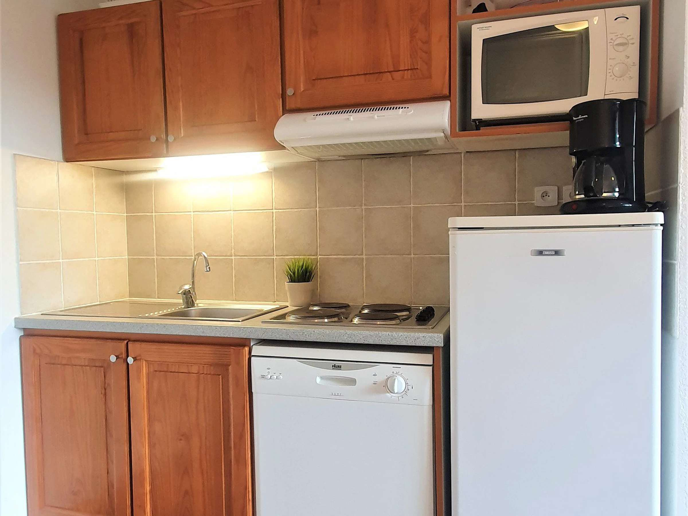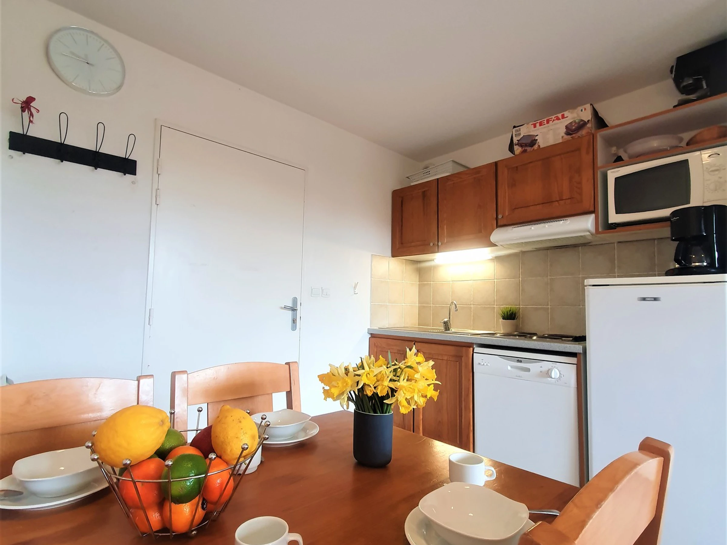 Kitchenette équipée, grand réfrigérateur, micro-ondes, cafetière filtre, grille-pain, bouilloire électrique, appareil Raclette.