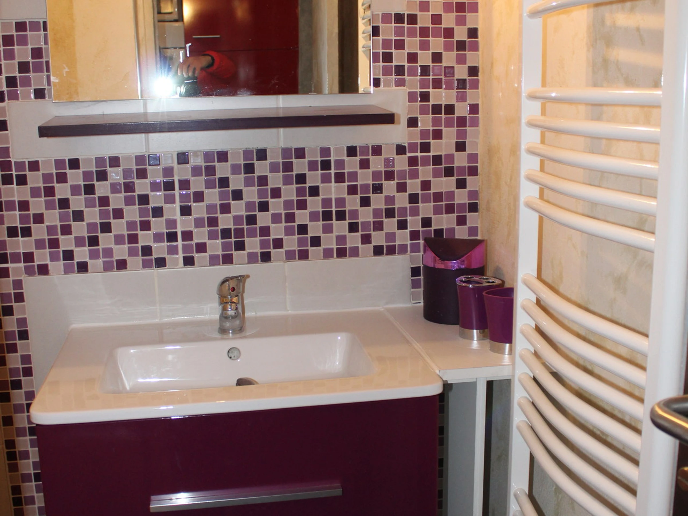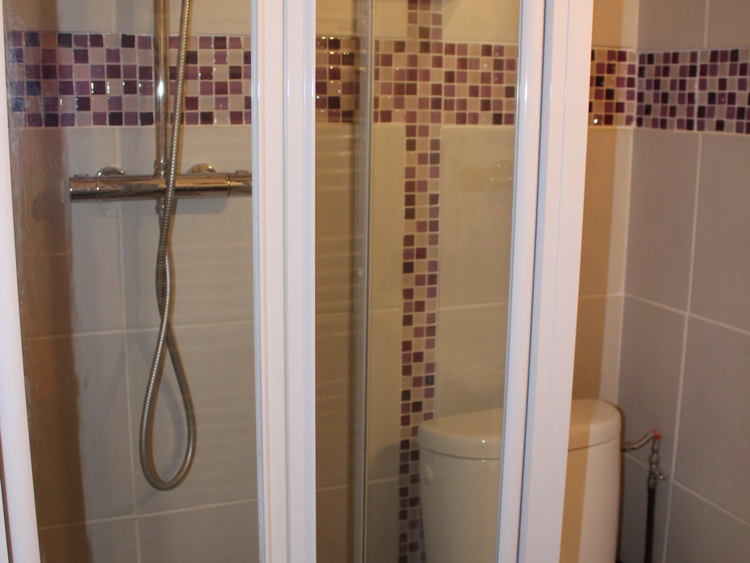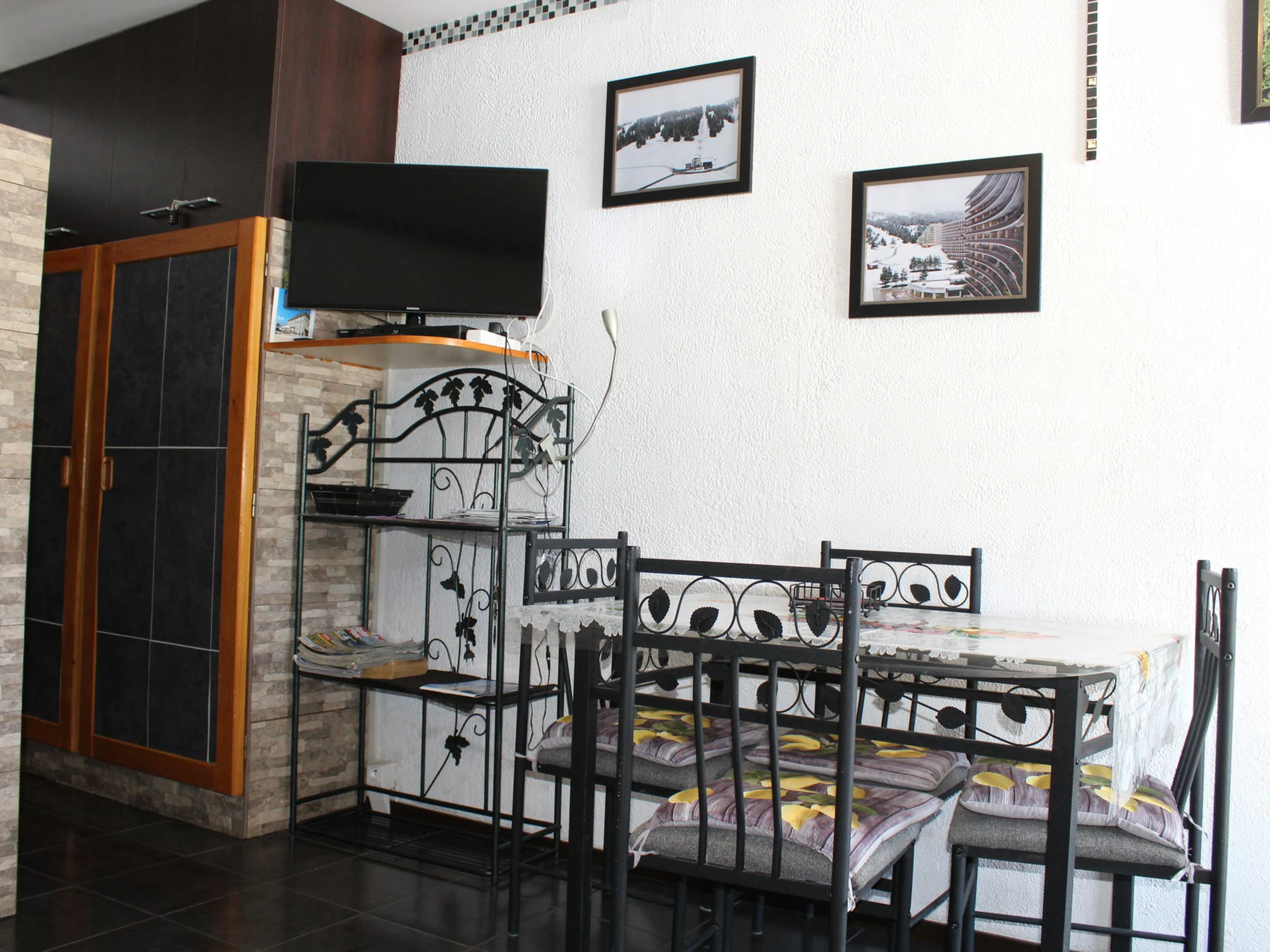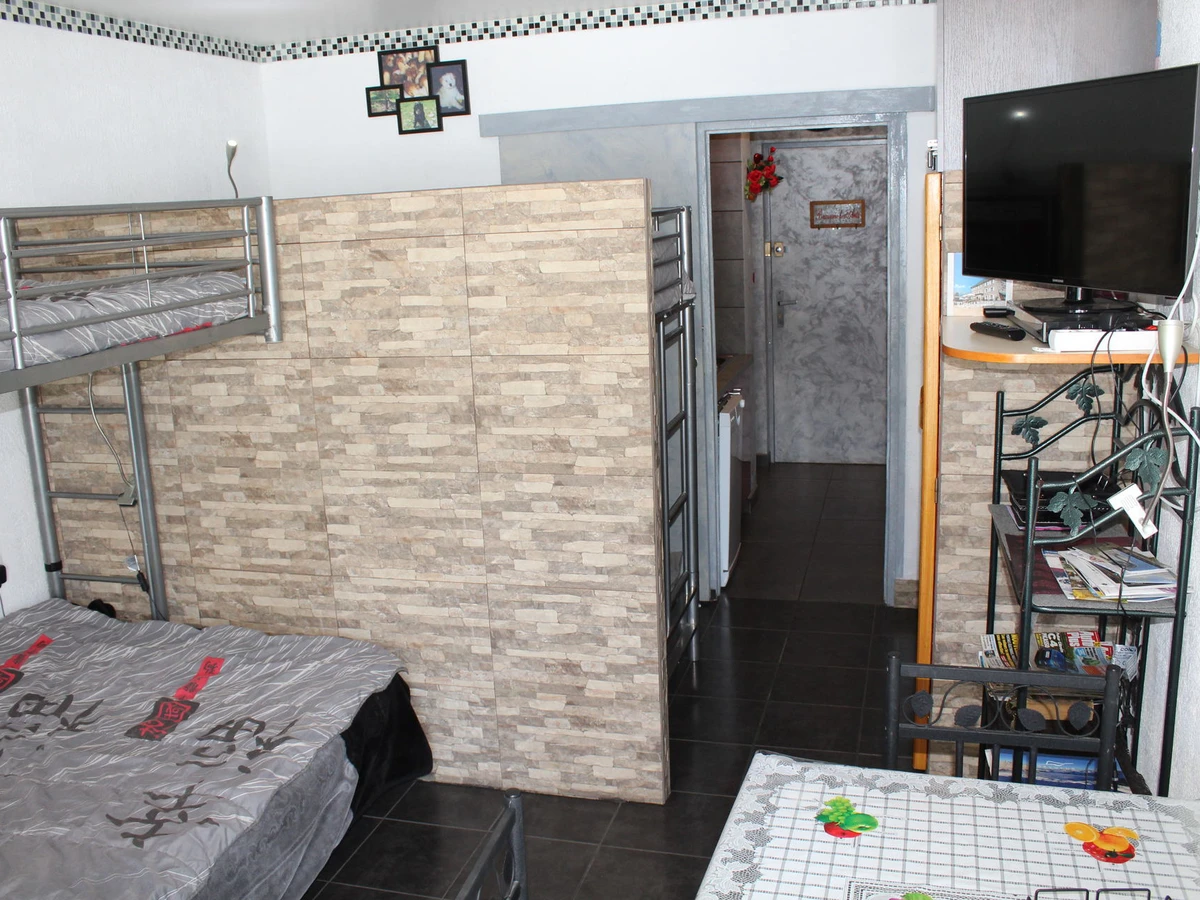 Studio entièrement rénové. Séjour avec canapé-lit, cloison avec 2 lits superposés. Salle d'eau avec douche et W.-C.