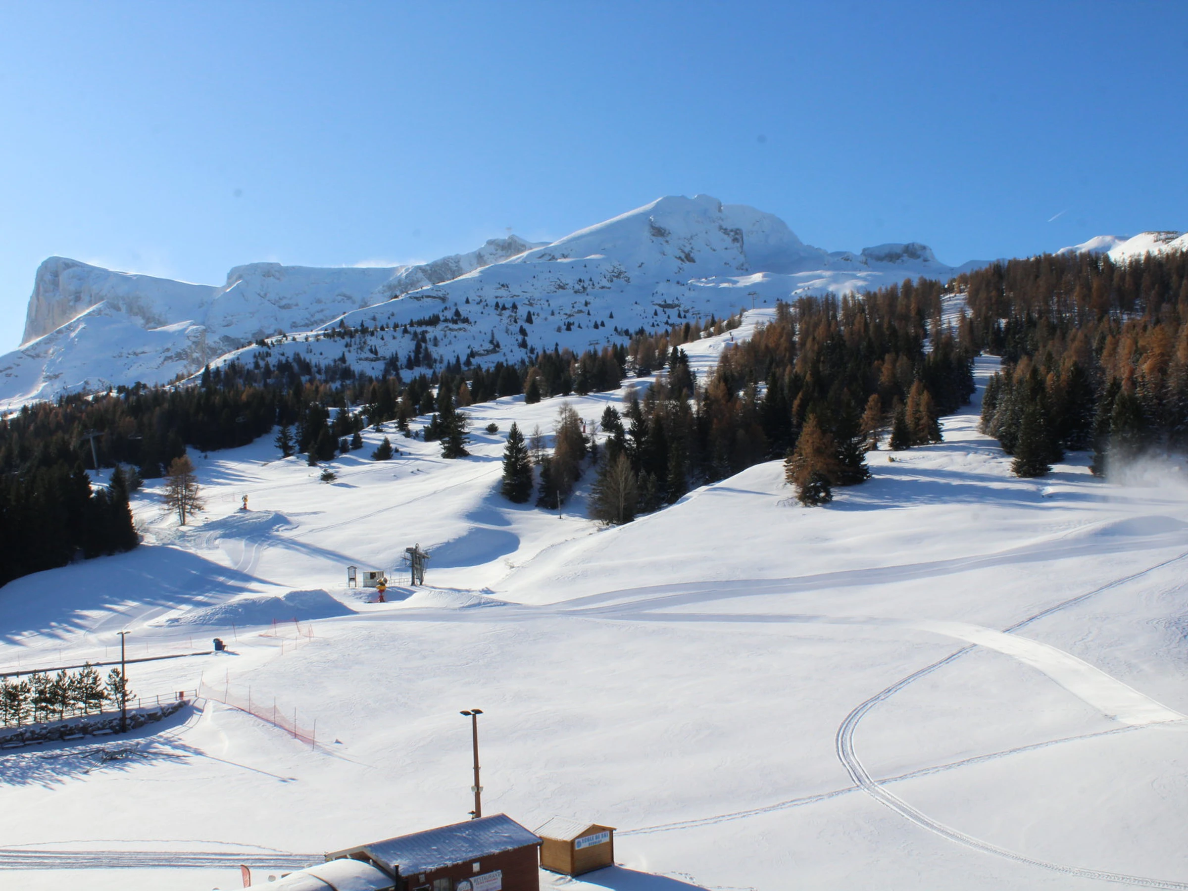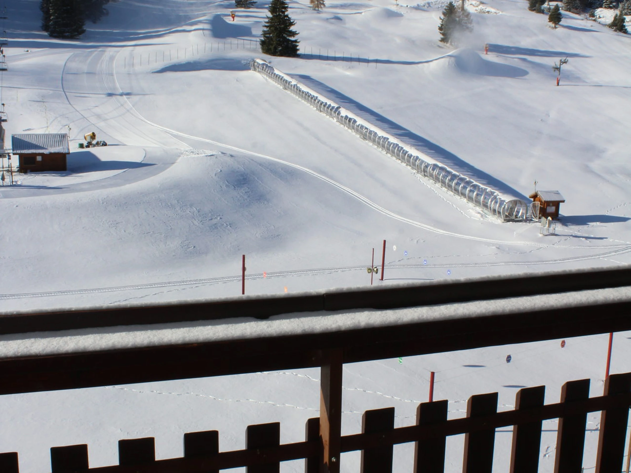 Balcon avec vue magnifique sur domaine skiable et pic de Bure. Exposition Sud. Studio au pied des pistes. Commerces et services au RDC de la résidences.