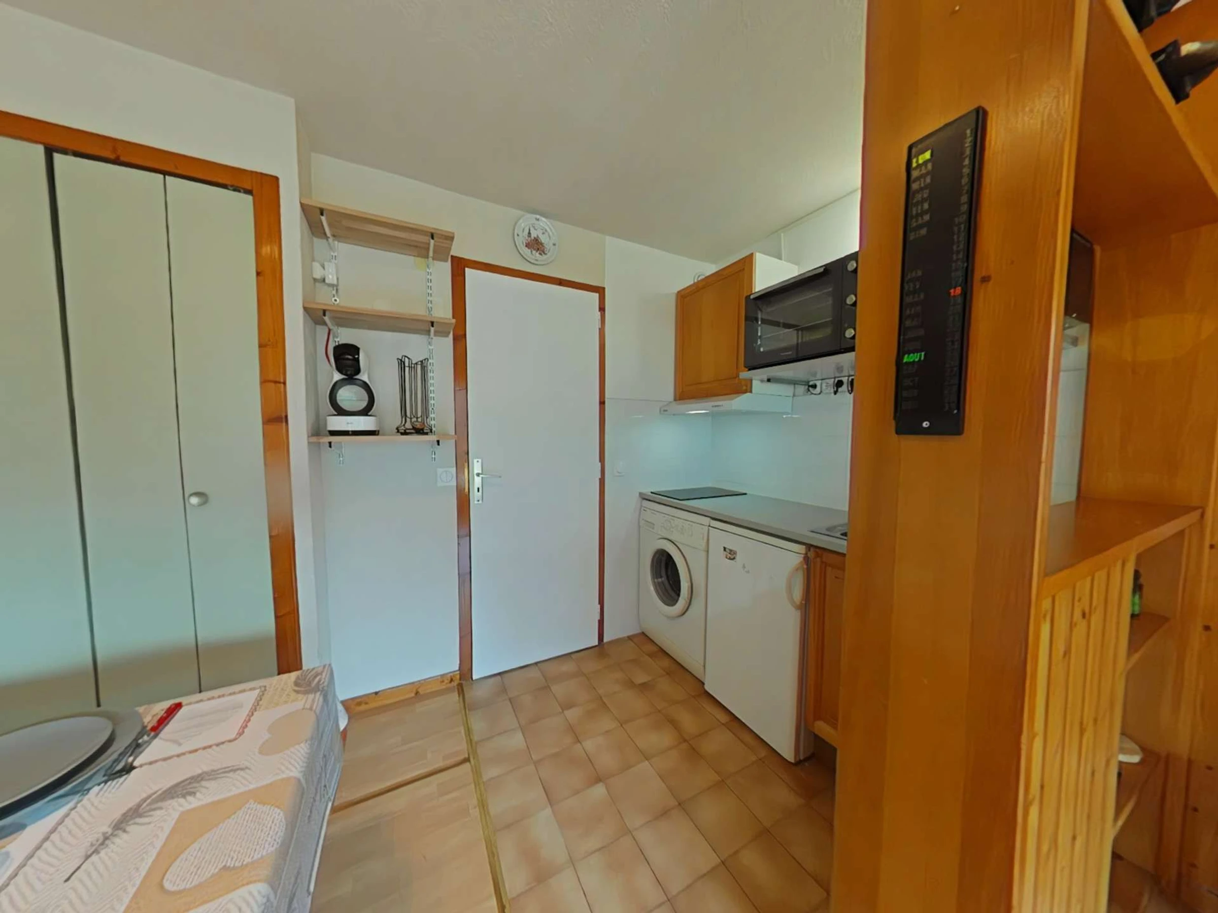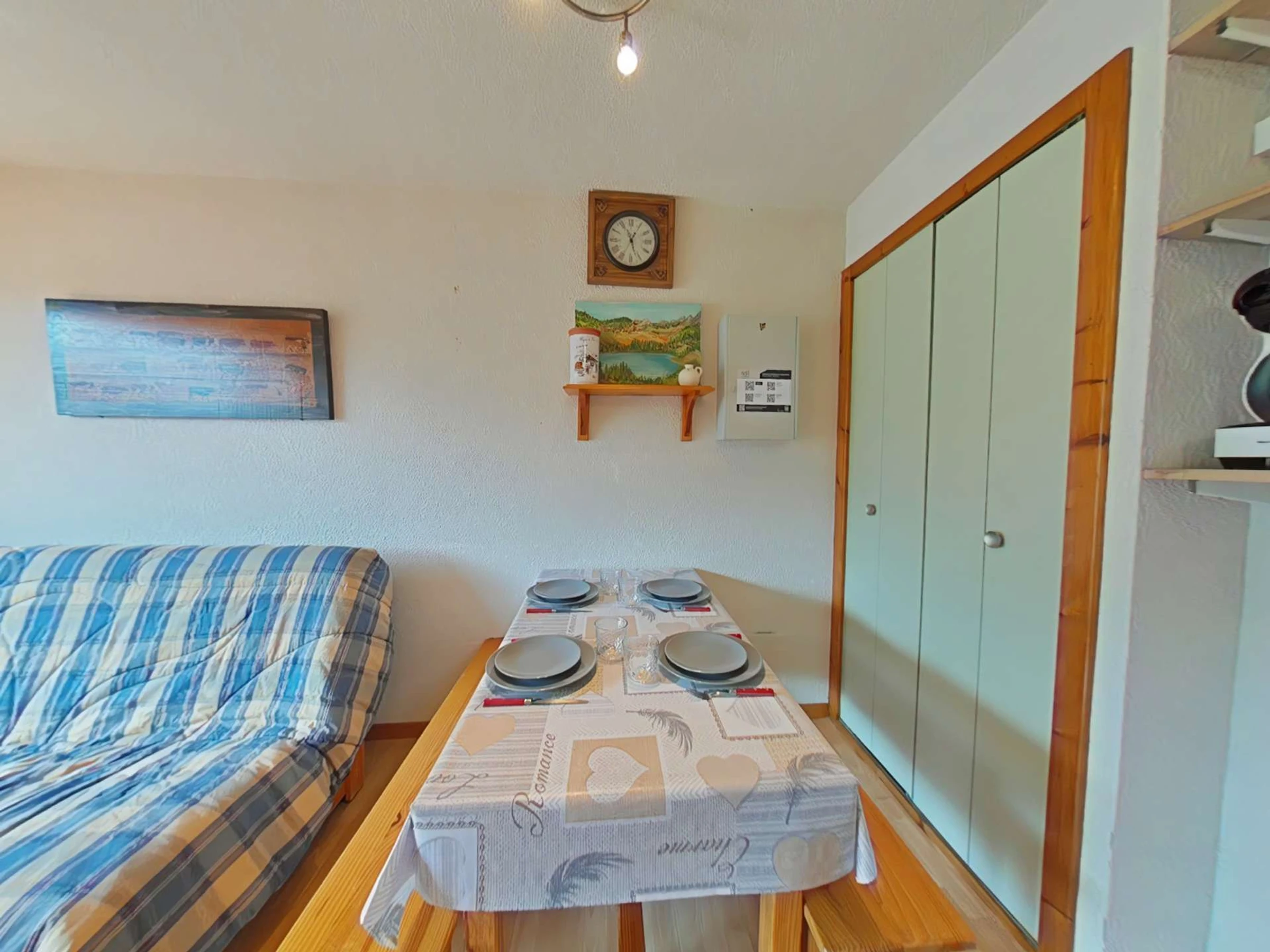 Cet appartement de vacances, au RDC, comprend un séjour avec canapé convertible et télévision écran plat, un coin cuisine équipé, un coin nuit dans l'entrée avec un lit superposé , une salle de bains et WC.