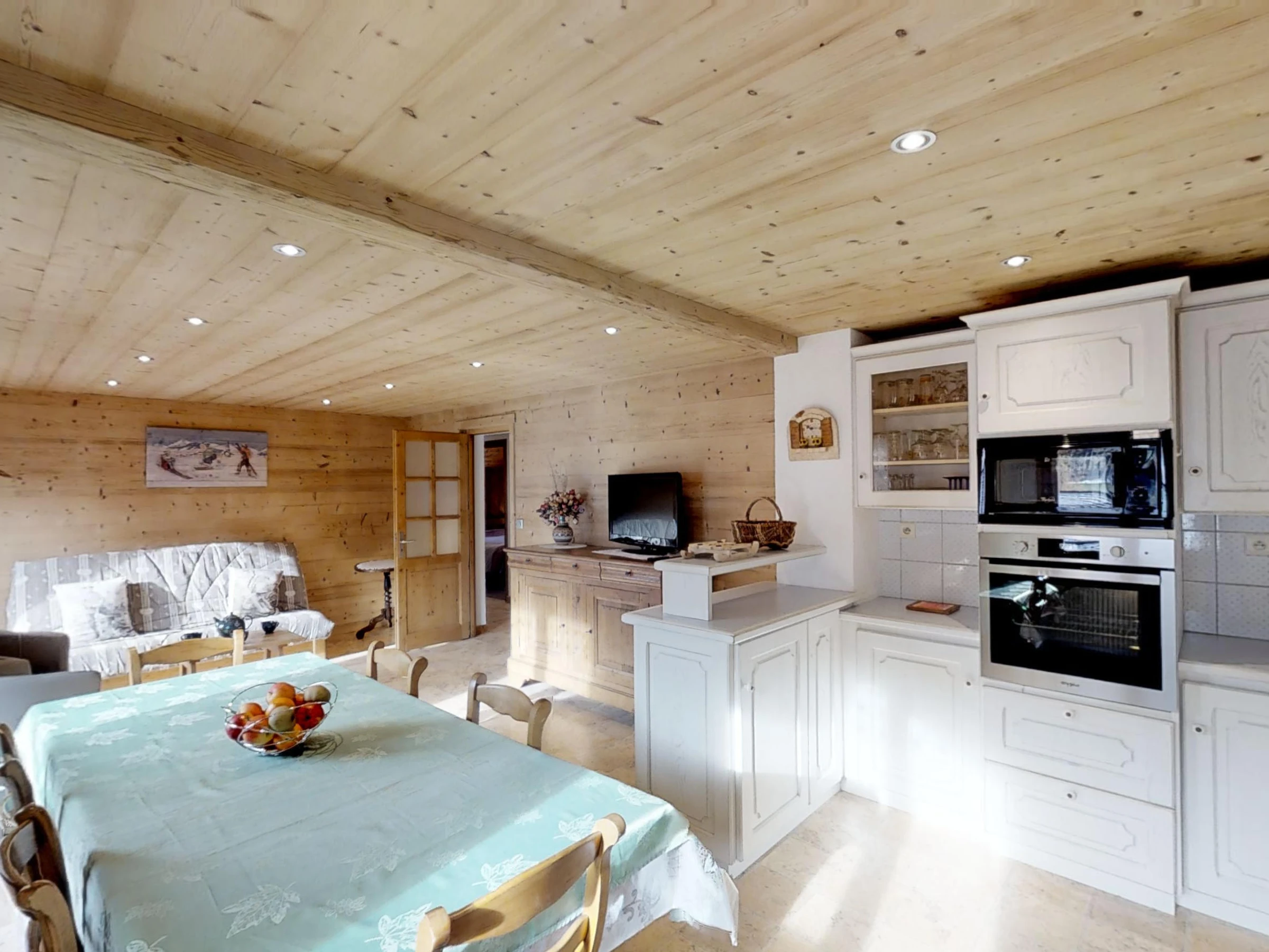 Equipement cuisine: 4 plaques de cuisson, four, micro-ondes, lave-vaisselle, 140 litres réfrigérateur :, appareil à fondue, appareil à raclette, cafetière, bouilloire