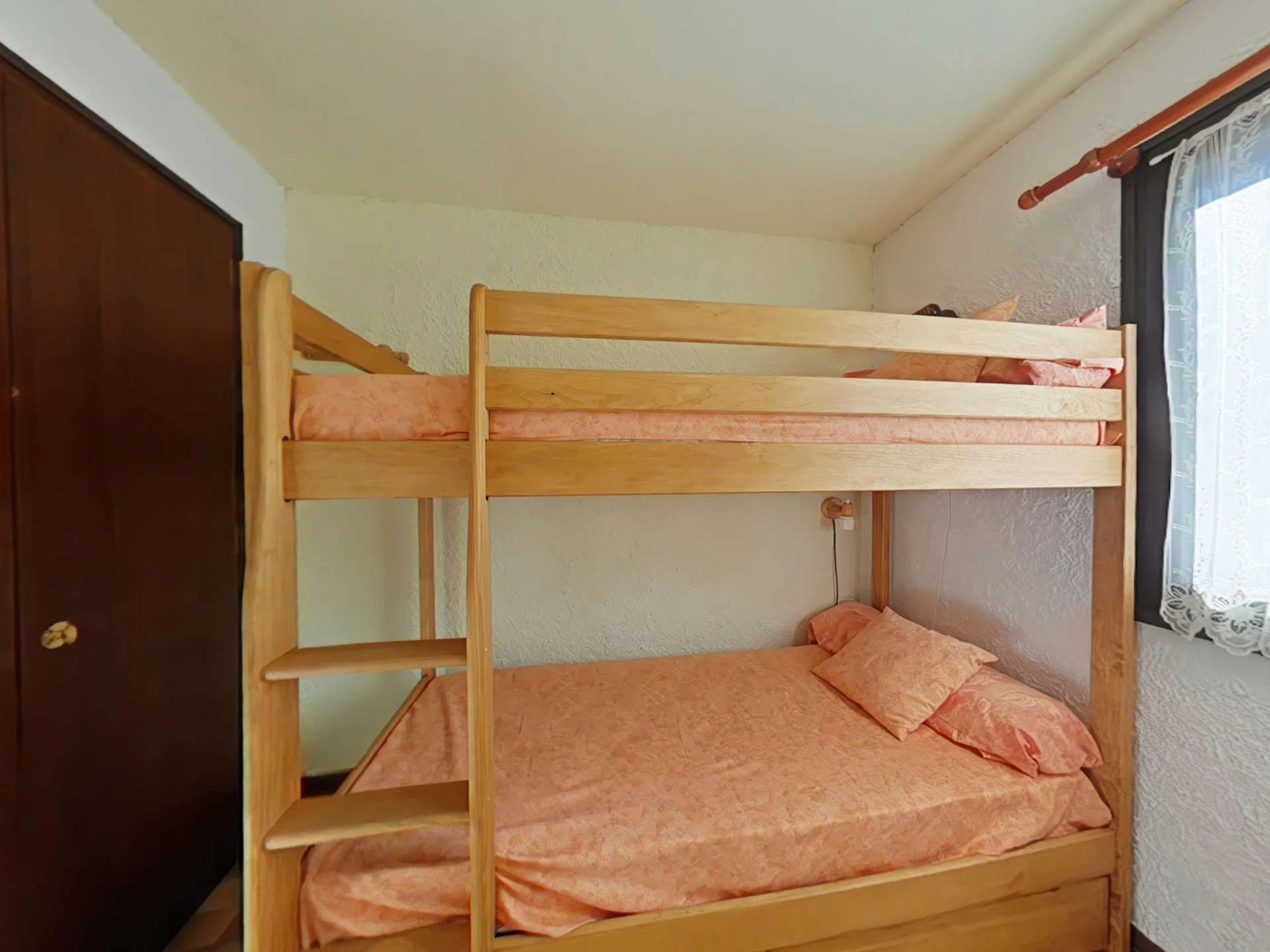 Cet appartement de vacances au 1er étage, comprend un séjour avec un canapé convertible 2 places, une cheminée décorative, télévision, un coin cuisine équipé, une chambre avec 2 lits superposés, une salle de bains, un WC.