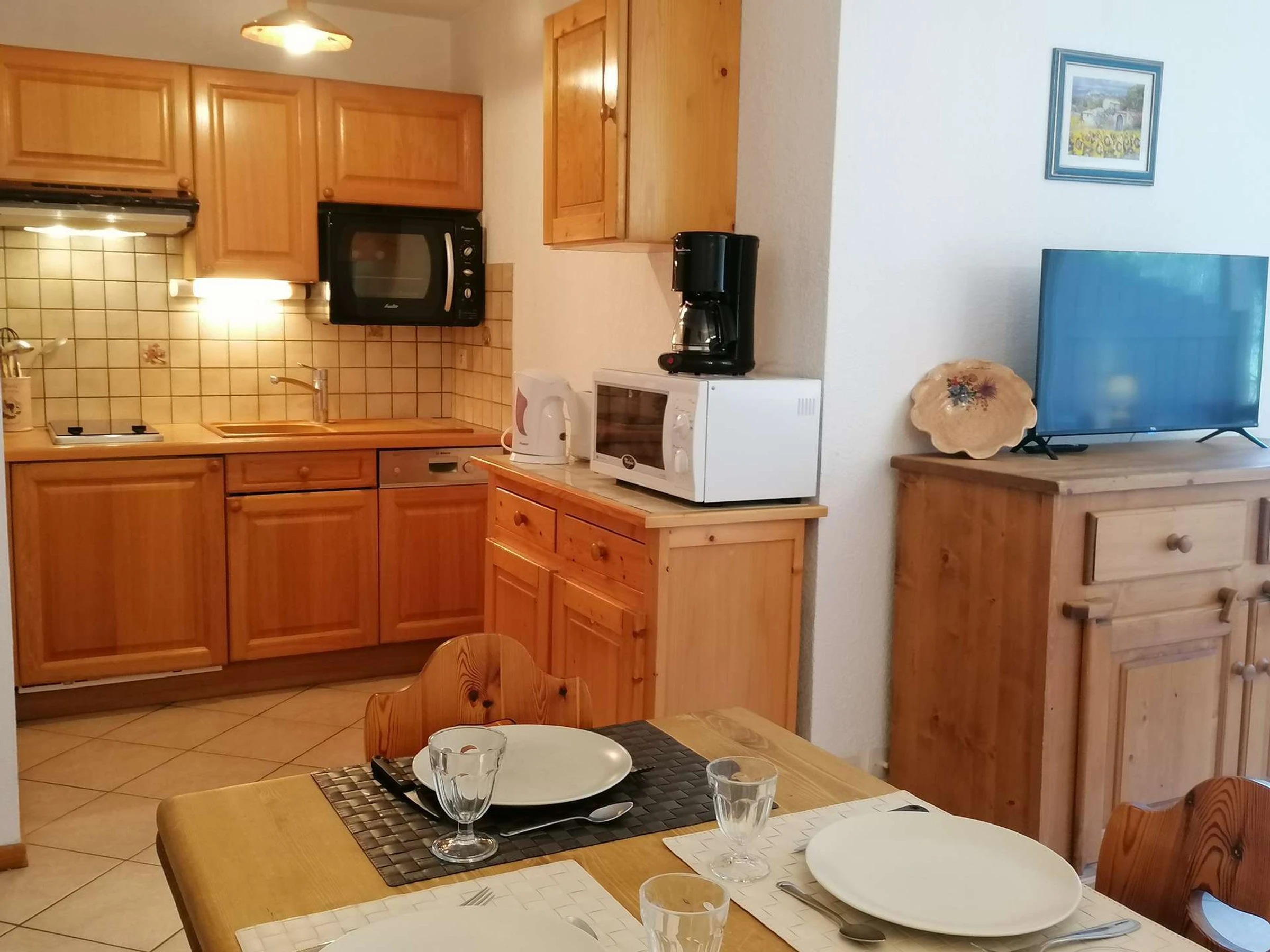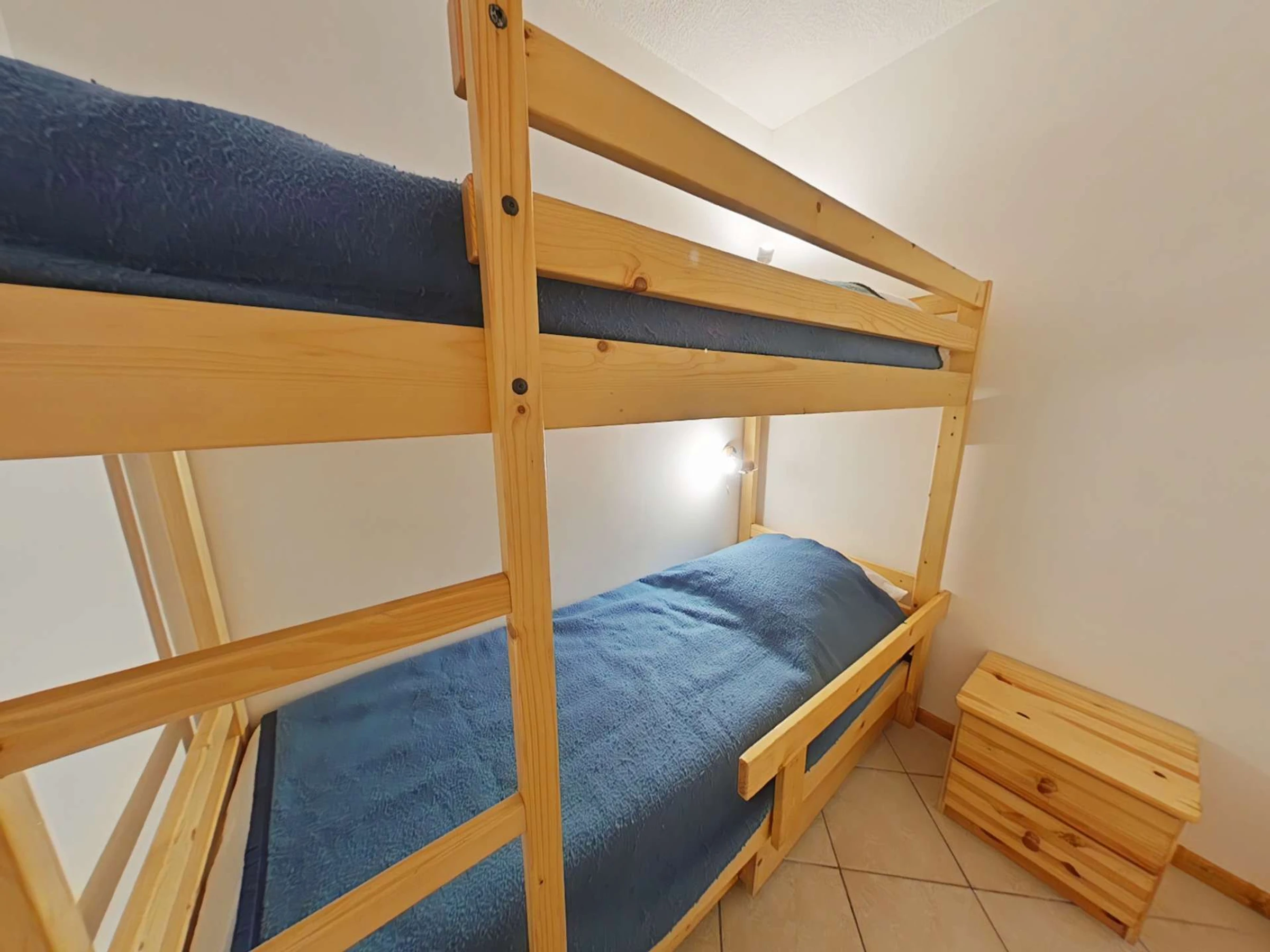 Cet appartement de vacances, au 2ème étage, comprend un séjour avec coin repas, un canapé convertible 2 places et télévision, un coin cuisine équipé d'un lave-vaisselle, 1 chambre avec un lit 2 personnes, un coin montagne avec deux lits superposés, une salle de bains et un WC indépendant.