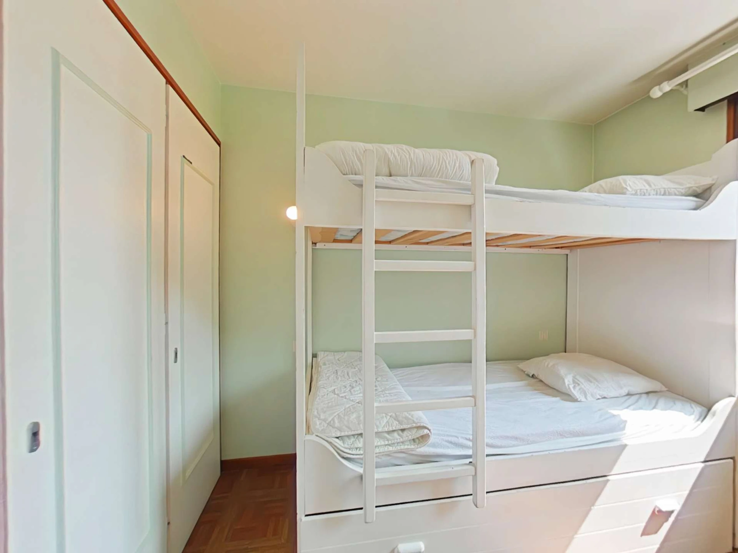 Cet appartement de vacances situé au 3ème étage avec ascenseur, comprend un séjour avec canapés d'agrément,une télévision, un coin cuisine équipé avec lave-vaisselle, une chambre avec 2 lits 1 personne superposés + coin lavabo, à l'étage une chambre avec 2 lits simples côte à côte + coin lavabo, une mezzanine avec un lit simple,une salle de bains avec lave-linge et WC.