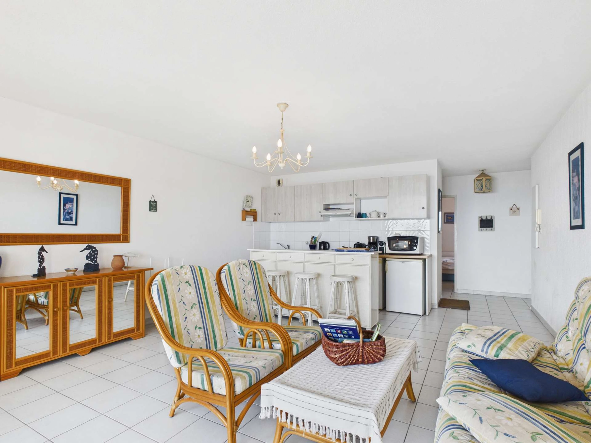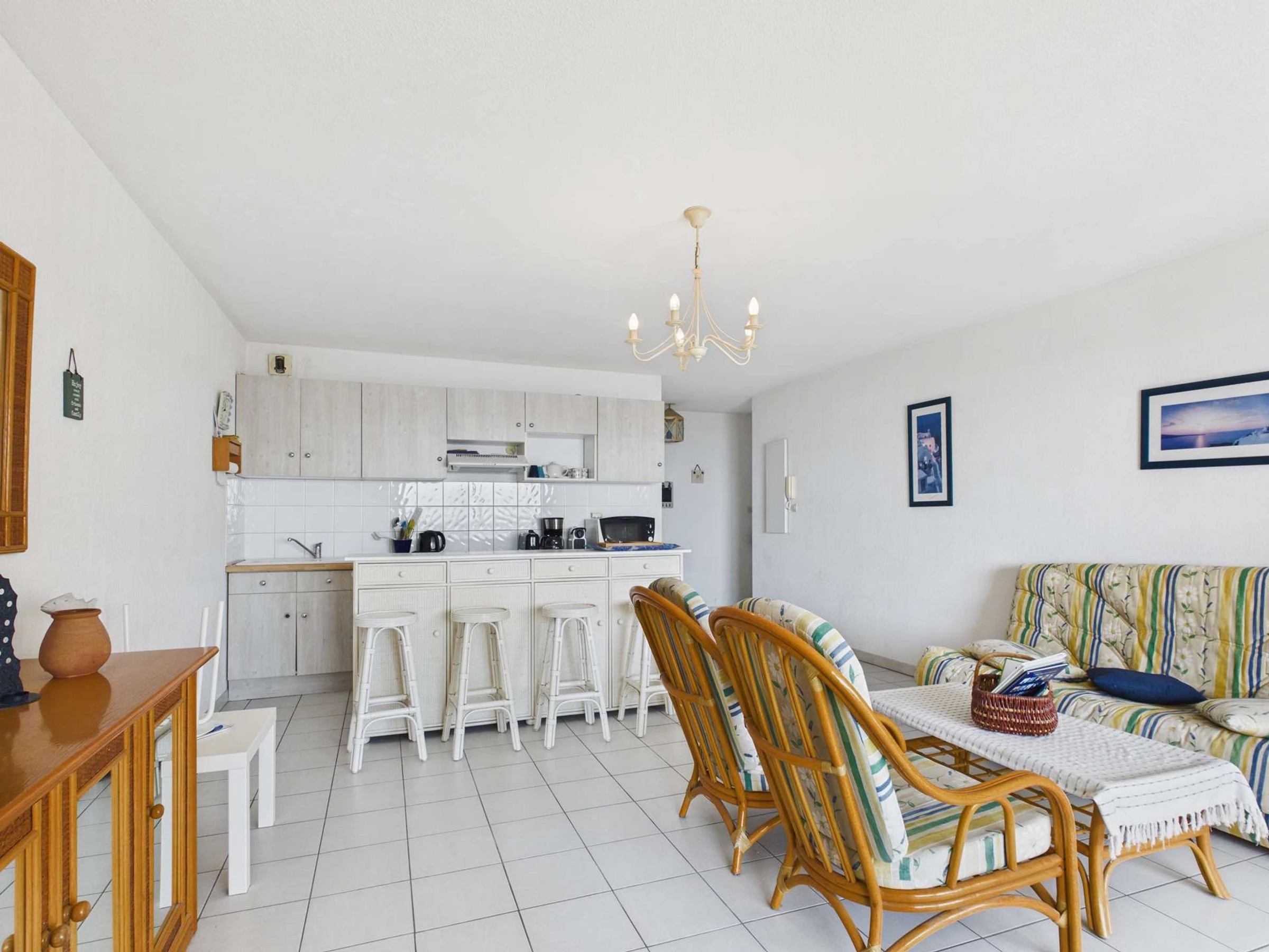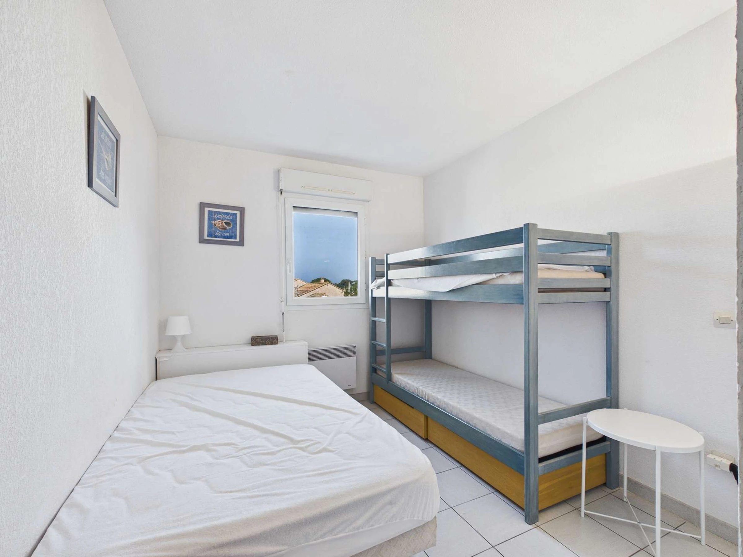 Cuisine équipée ouverte sur lumineuse pièce à vivre avec canapé et TV. 1 chambre avec lit double, 1 chambre avec lit double et 2 lits en 90 superposés. Salle d'eau, wc séparés. Très belle terrasse avec store banne.