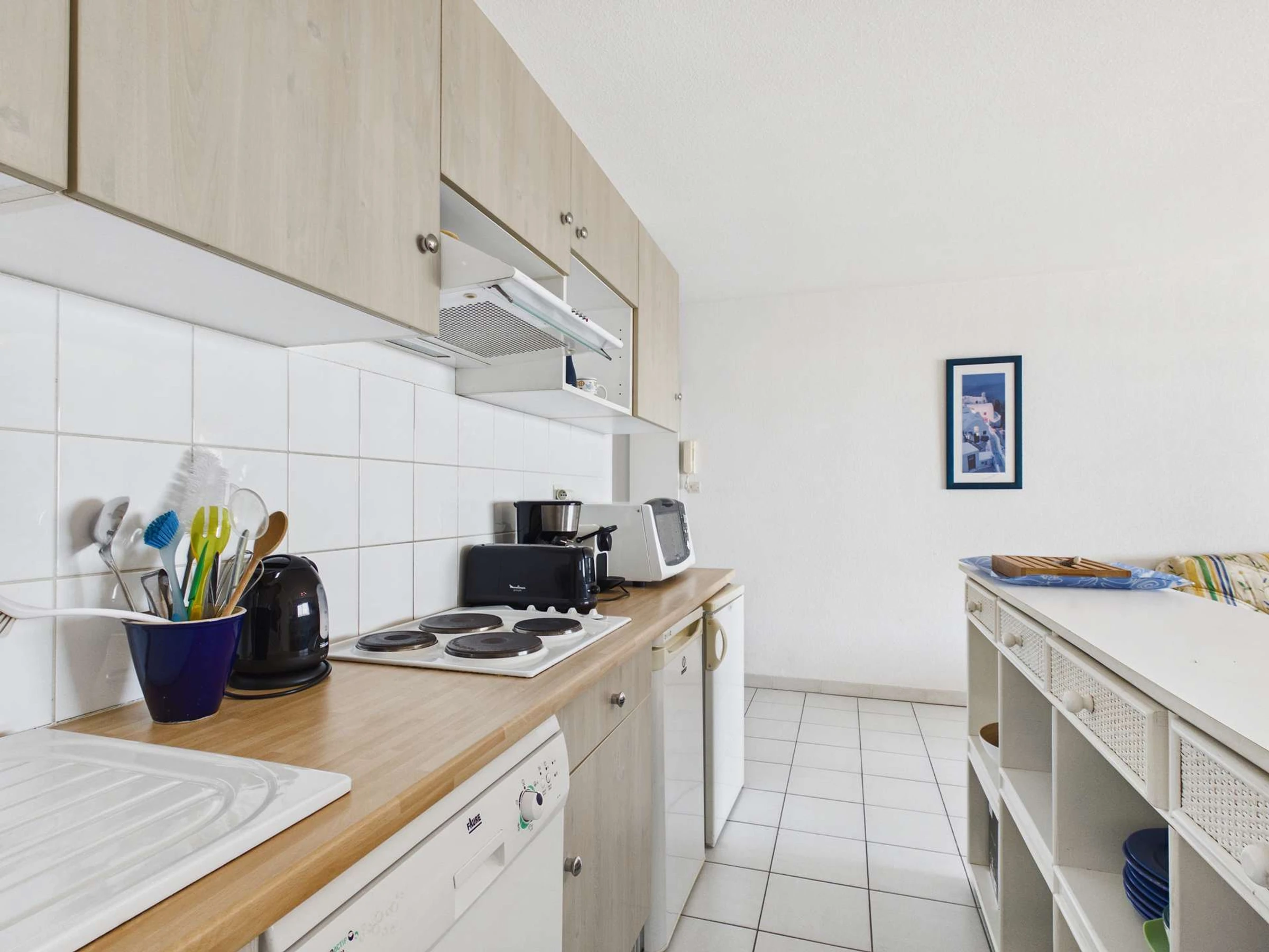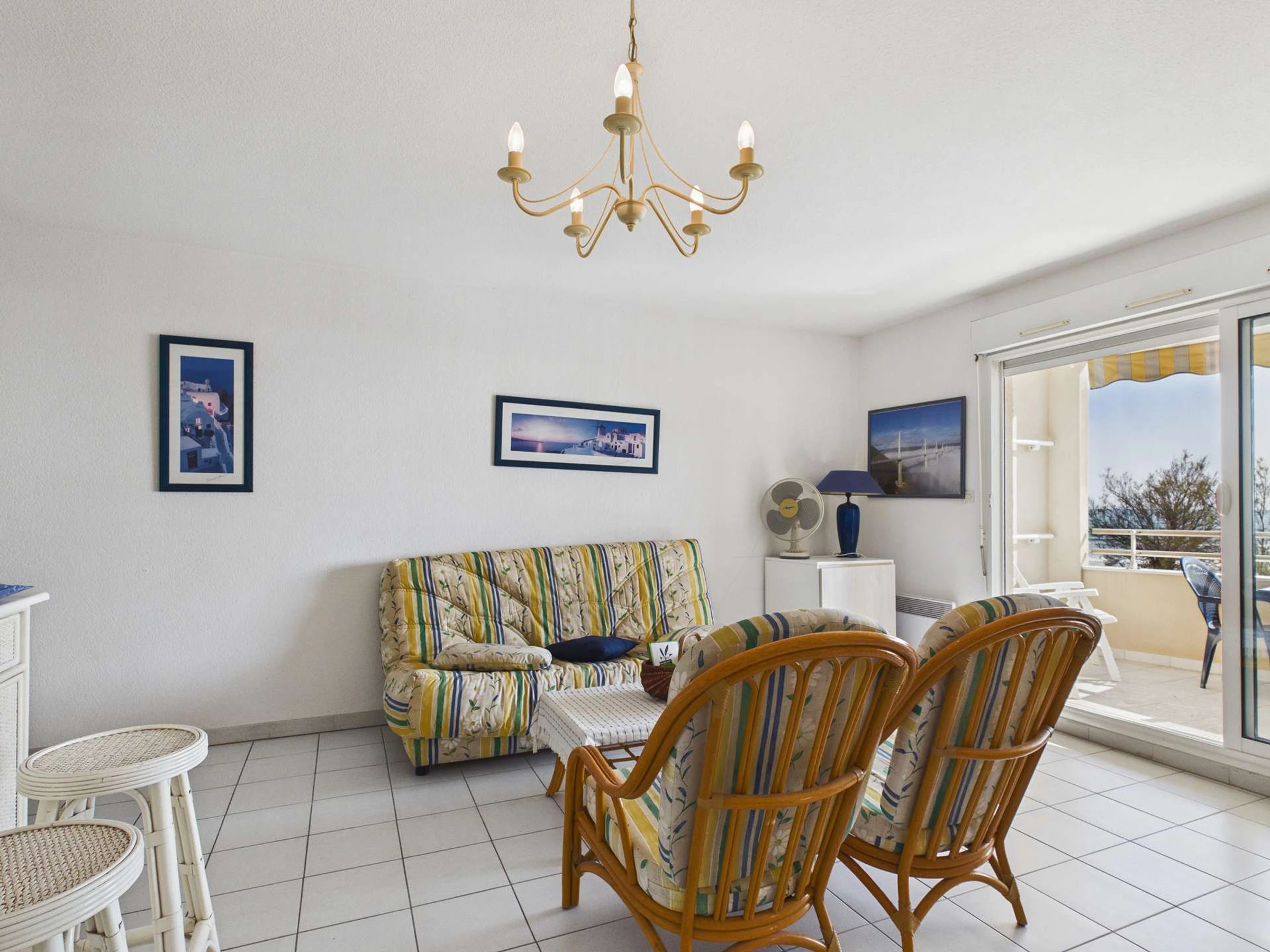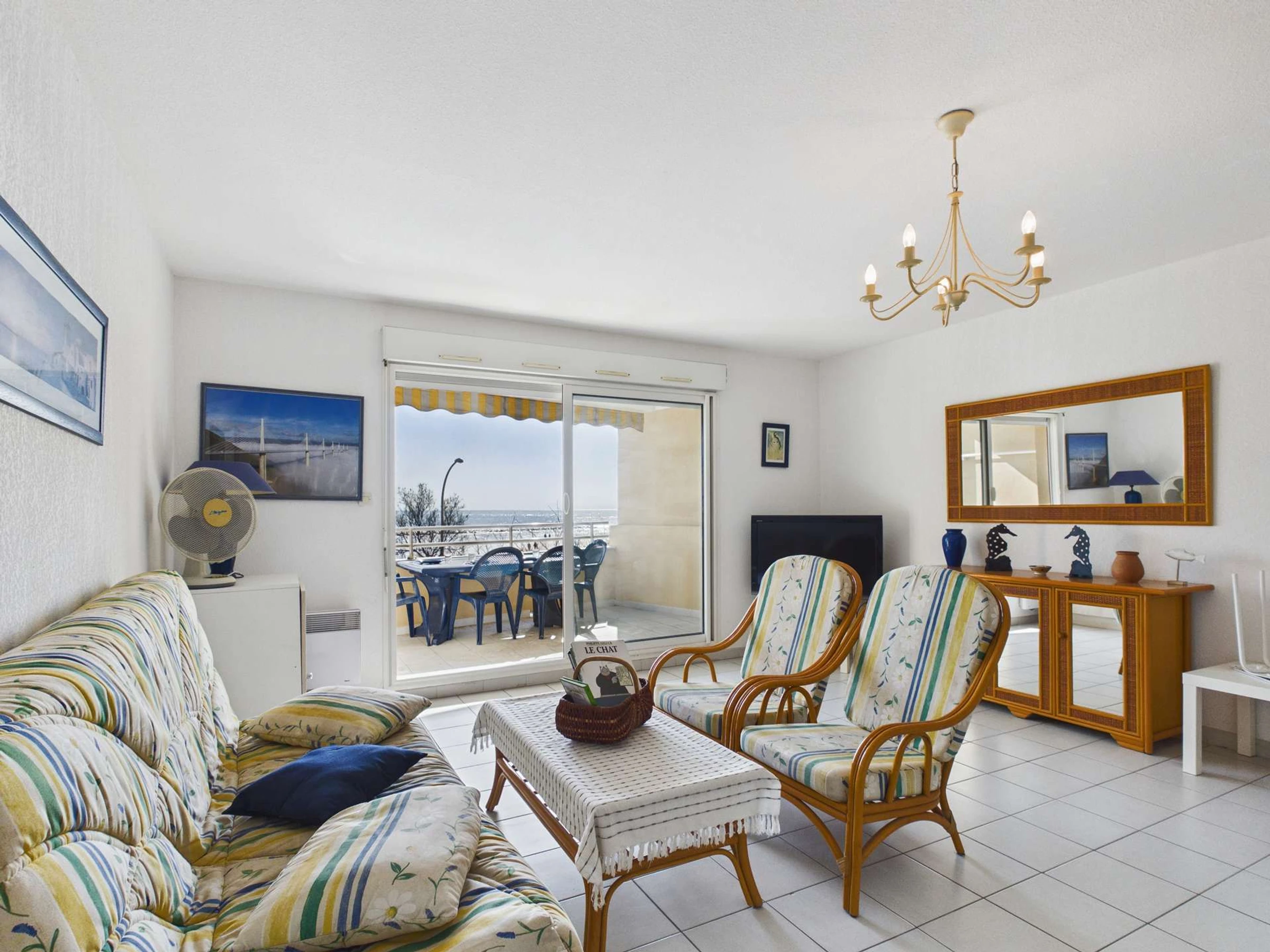 Cuisine équipée ouverte sur lumineuse pièce à vivre avec canapé et TV. 1 chambre avec lit double, 1 chambre avec lit double et 2 lits en 90 superposés. Salle d'eau, wc séparés. Très belle terrasse avec store banne.