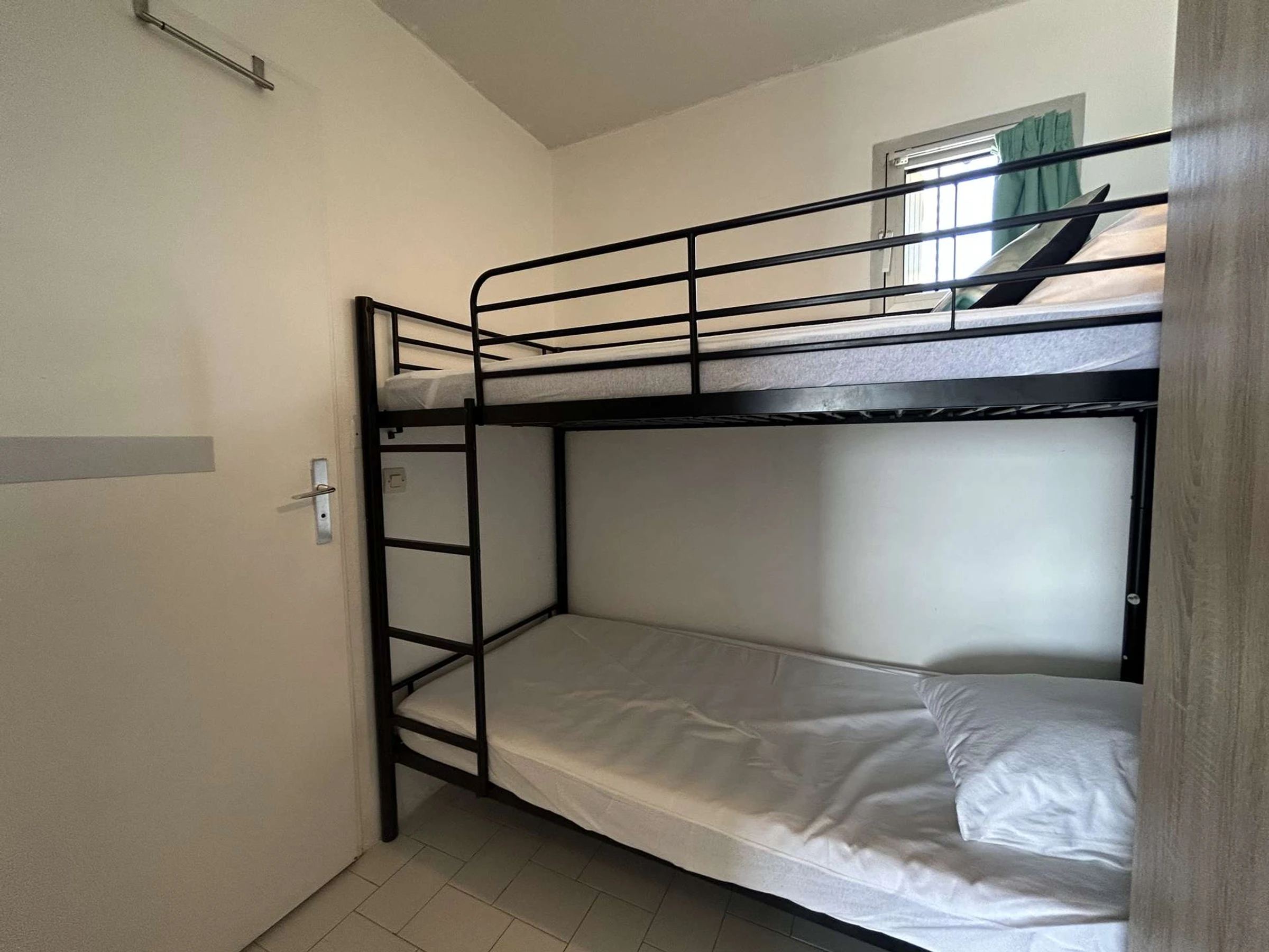 Cet appartement de vacances situé au 2ème étage comprend un séjour avec un grand lit 2 places, télévision écran plat et un coin cuisine équipé. Il dispose d'un coin cabine avec des lits superposés et une salle d'eau avec WC.