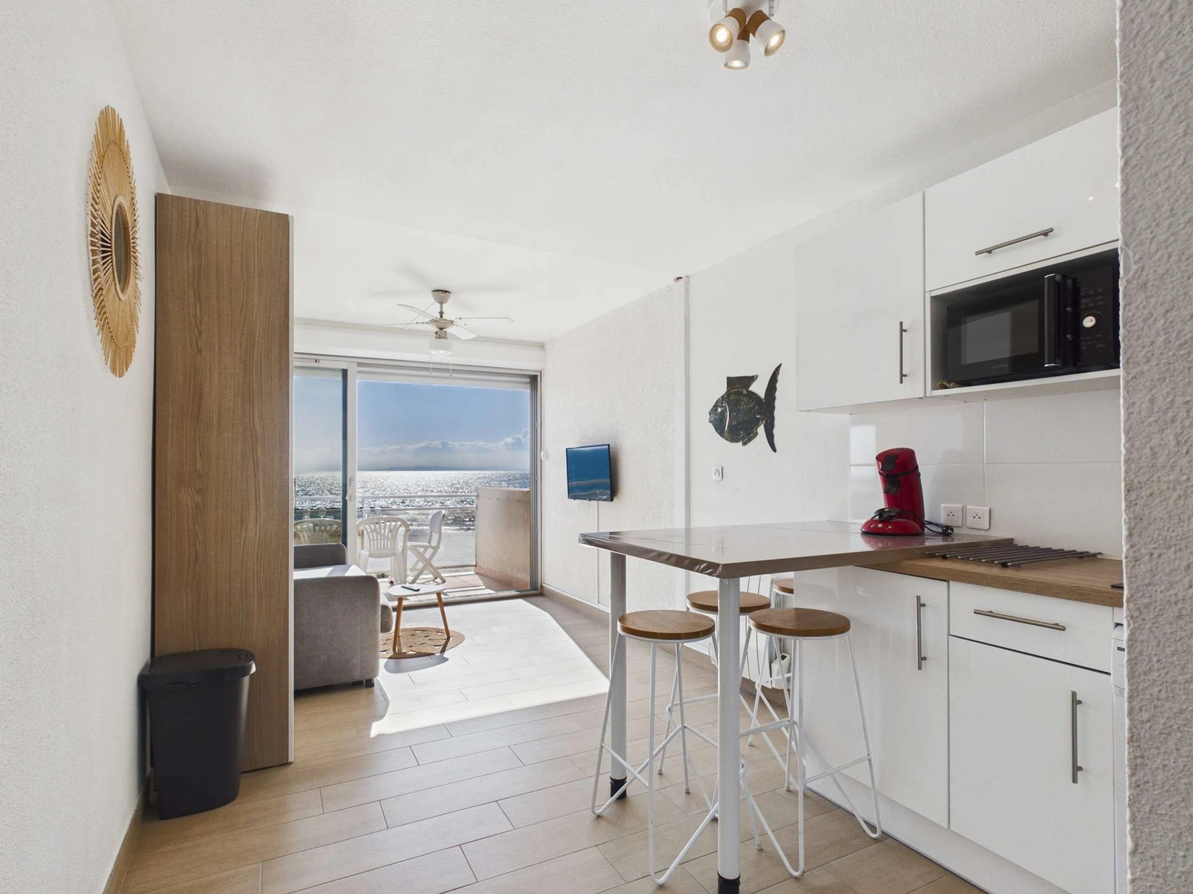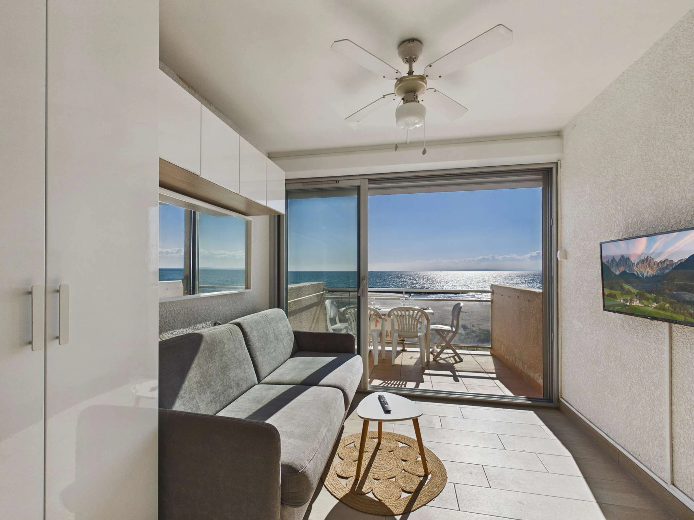 GRAU D'AGDE : Vue panoramique sur la mer depuis ce lumineux studio cabine "pieds dans l'eau": entrée, cabine fermée avec 2 lits superposés, salle d'eau avec wc, cuisine équipée ouverte sur pièce à vivre avec canapé convertible (2 pers.) et TV écran plat. Belle terrasse avec vue féérique sur les plages de la méditerranée.Equipé pour 4 couchages, parking privé n°8.