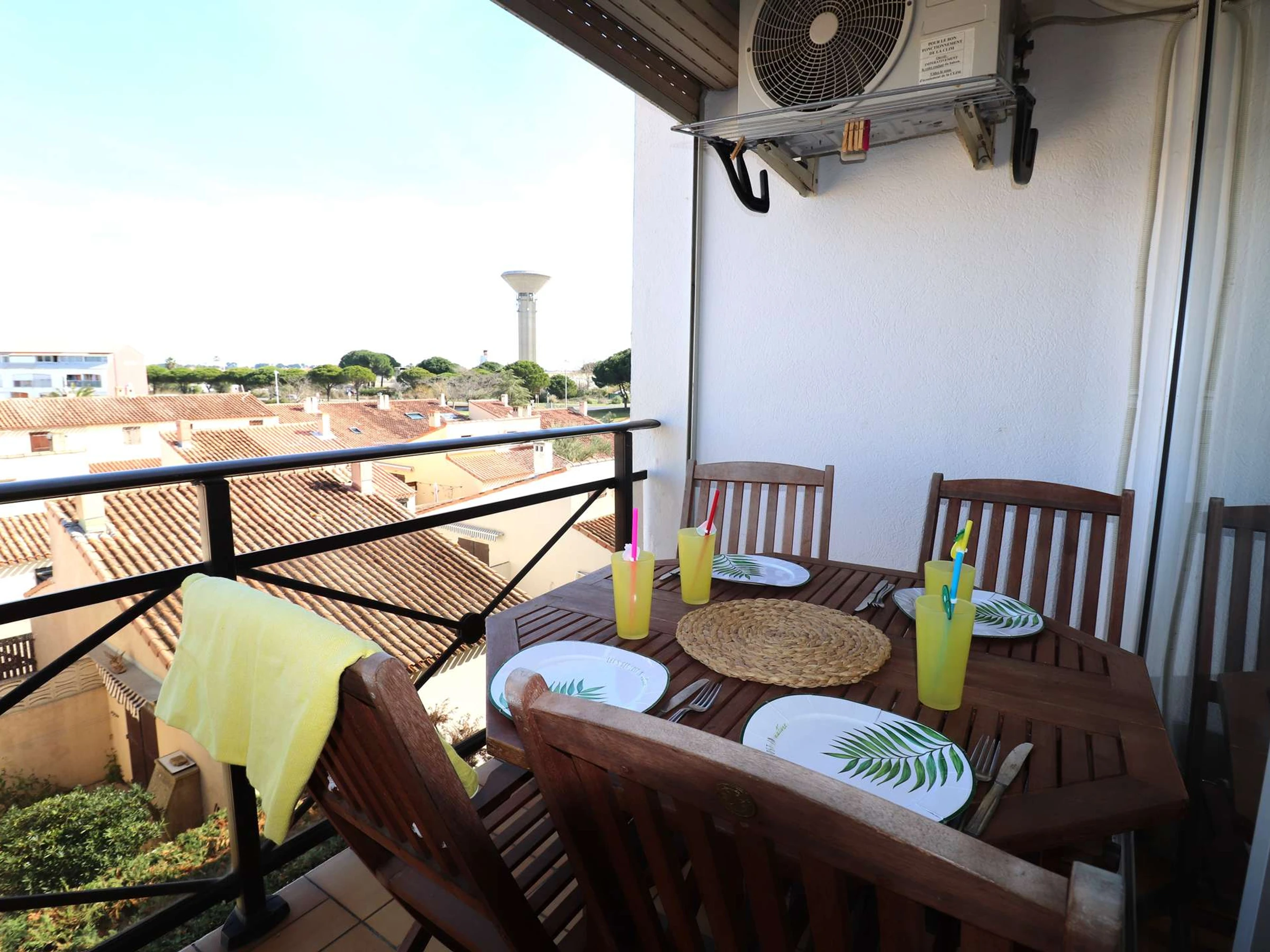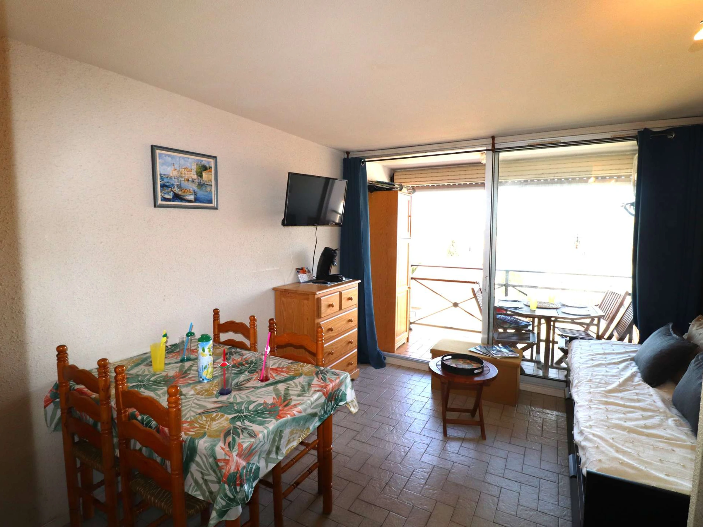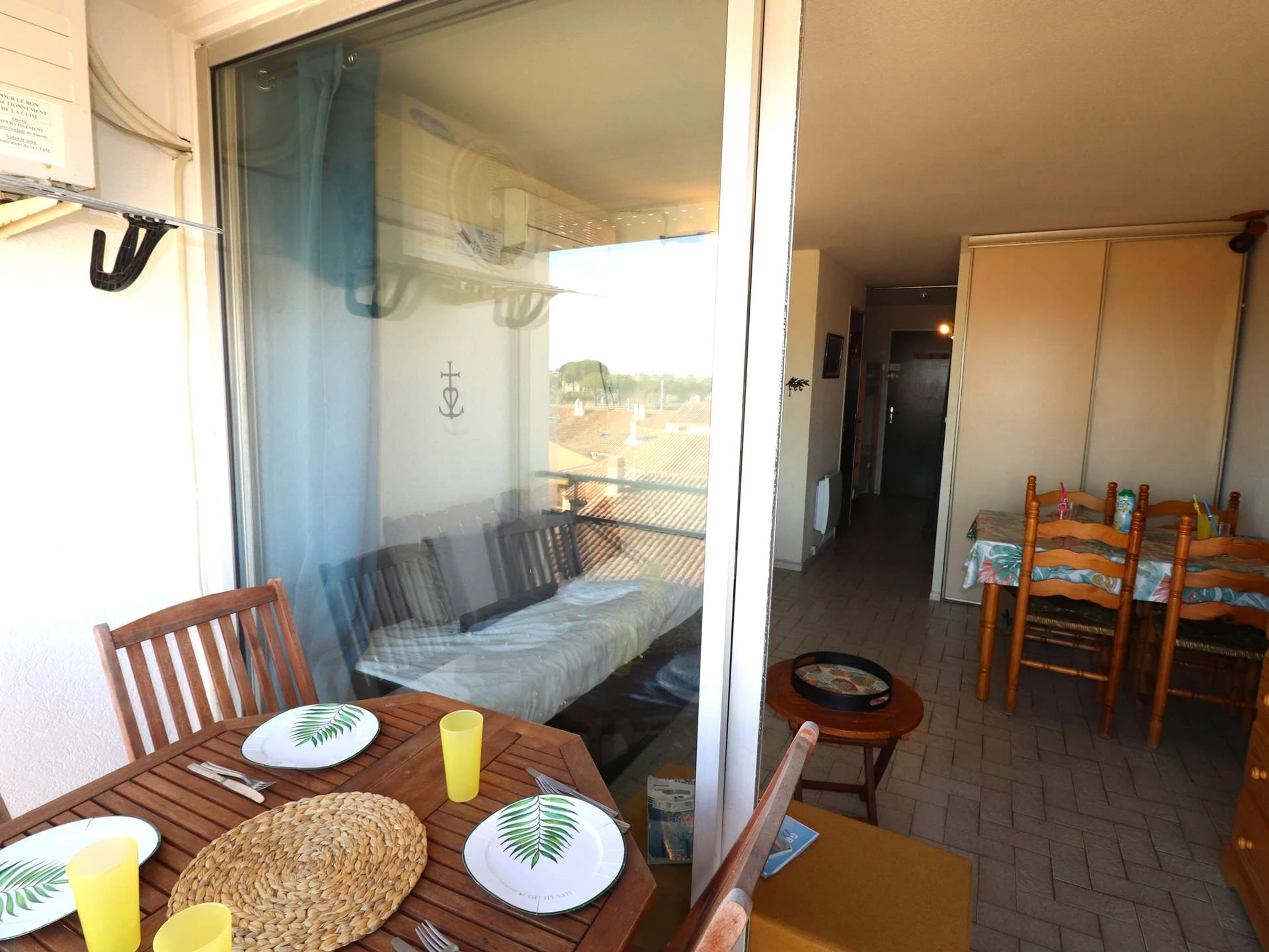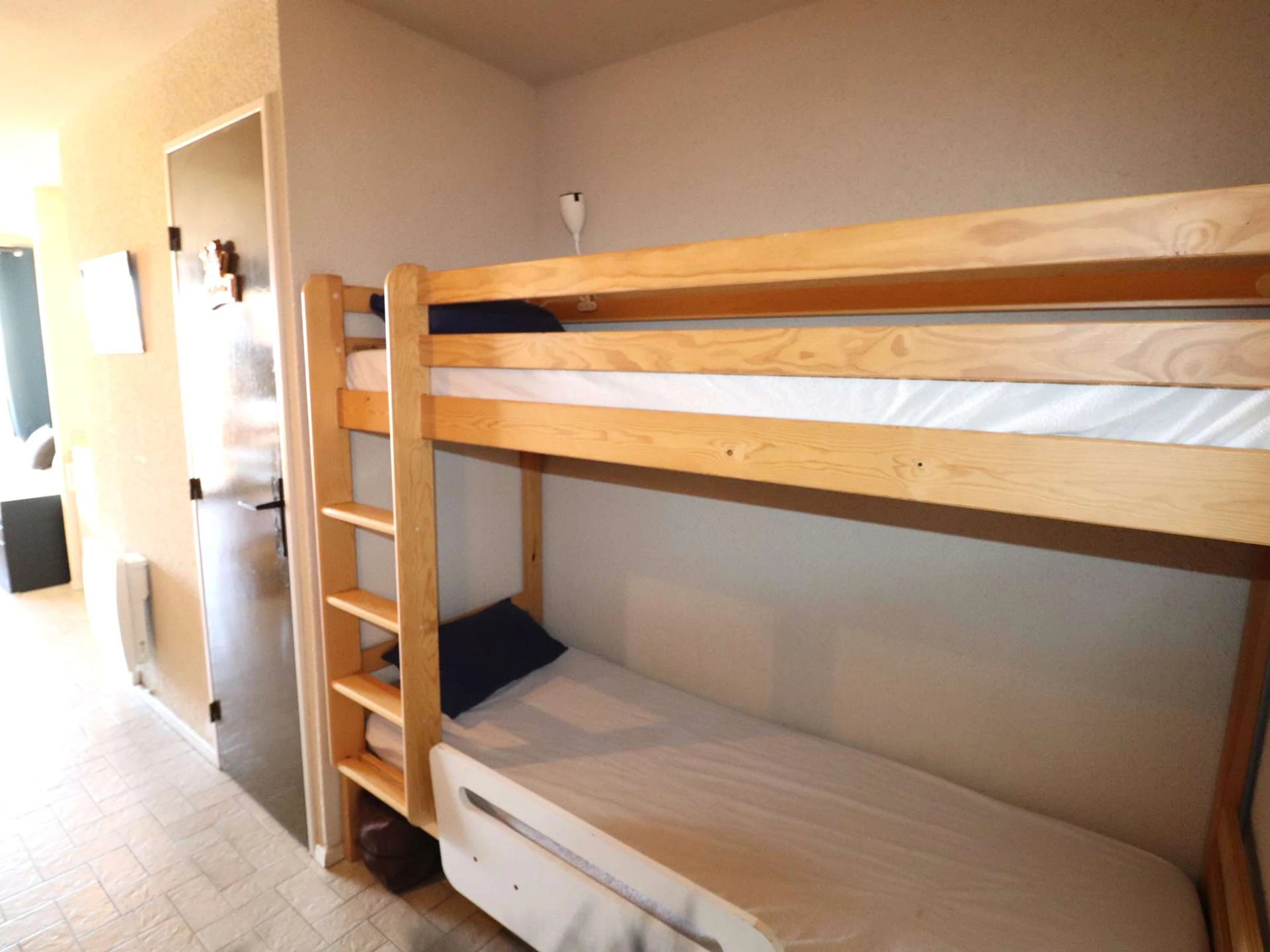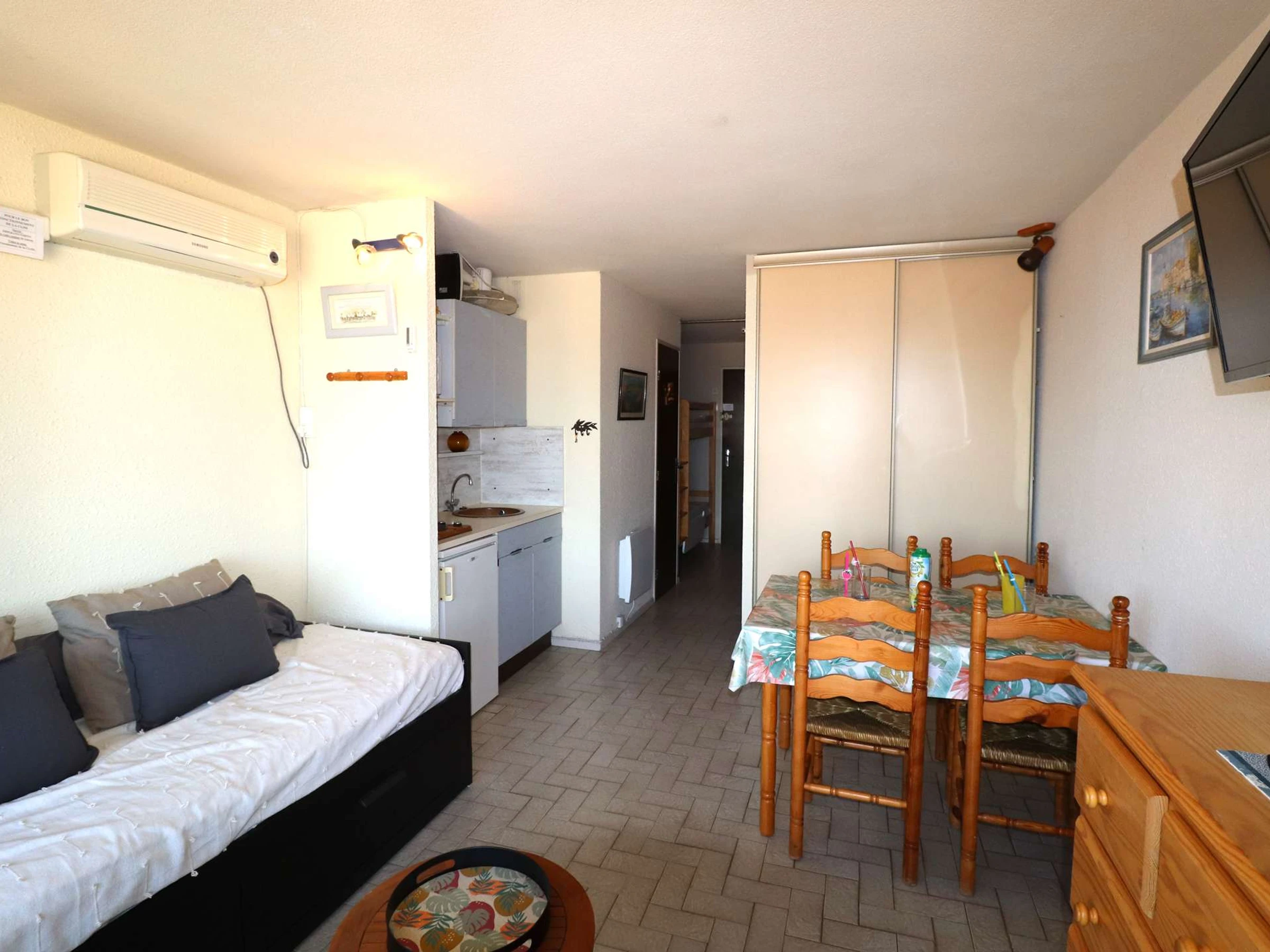 L’appartement dispose d’un espace double cabine avec lits superposés et un lit double. Vous trouverez également une salle d’eau équipée d’une douche, d’un lavabo et de WC séparés. Le séjour lumineux est aménagé avec une kitchenette fonctionnelle, comprenant un micro-ondes, un réfrigérateur, ainsi qu’un système de climatisation pour garantir votre confort. Profitez de la terrasse pour dégustez vos meilleurs petits déjeuners en extérieur !