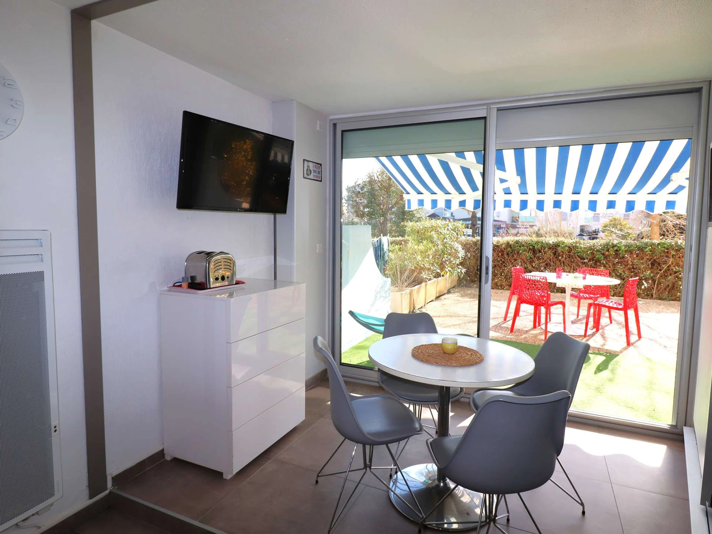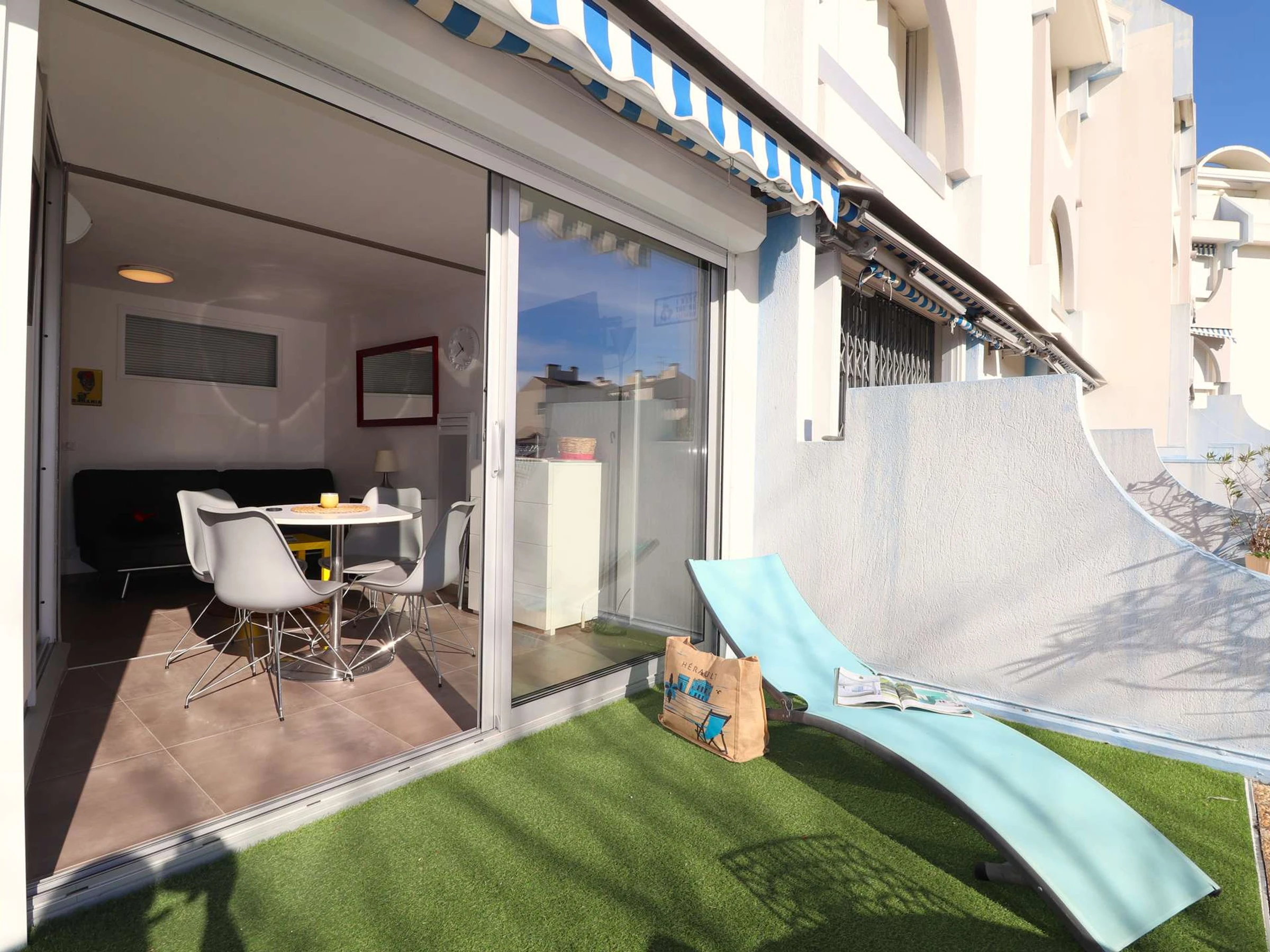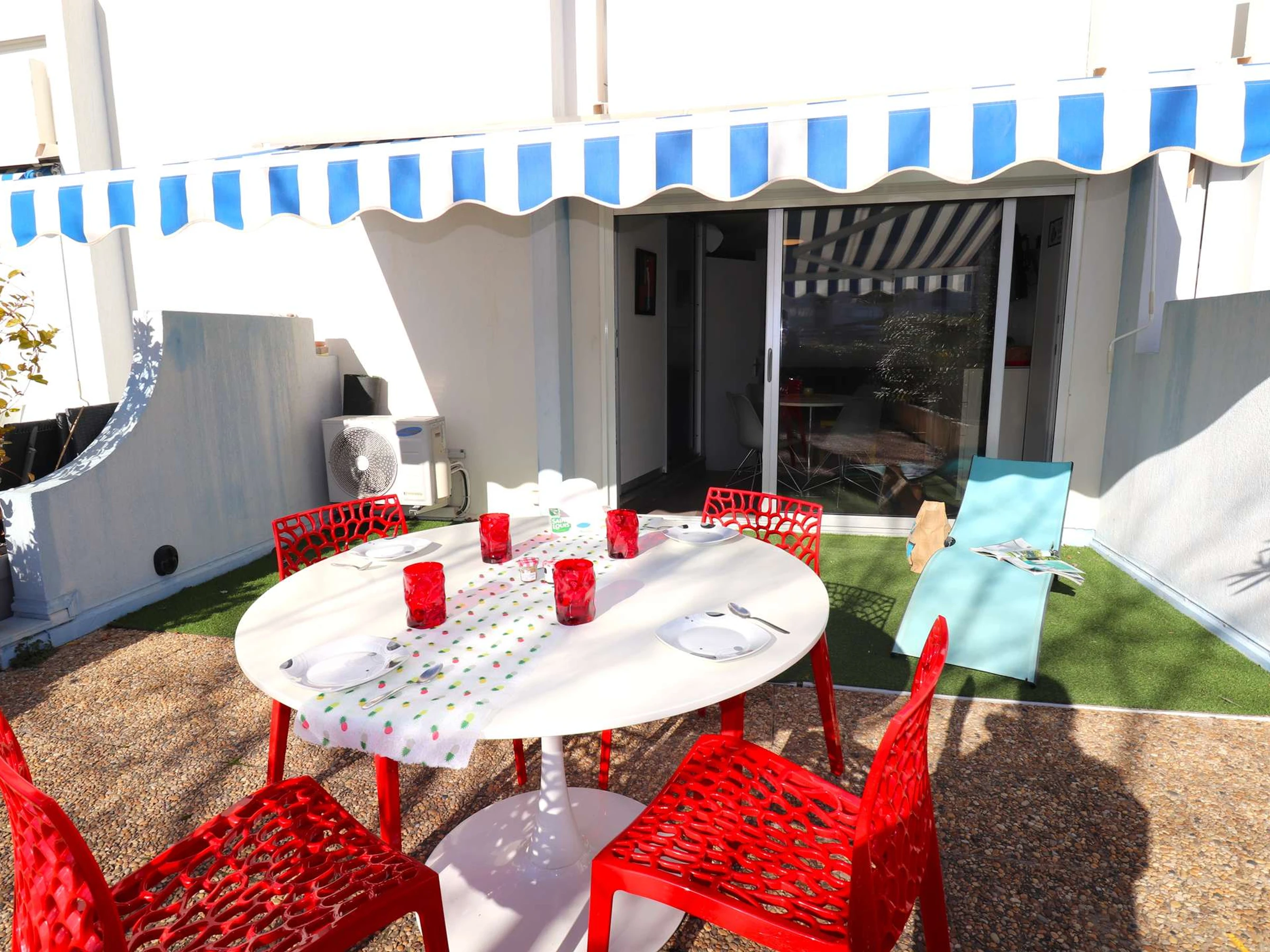 Résidence FLORALIES 2 - Dans résidence bon standing avec piscines, espaces verts, jeux de boules, jardin d'enfants, plage et commerces à proximité, magnifique 2 pièces Cabine très bien équipé avec climatisation en rez-de-chaussée surélevé. Chambre lit double + Cabine indépendante avec deux lits séparés. Salon et salle à manger, lave-linge et lave-vaisselle. Salle d'eau avec douche, lavabo, WC séparés.