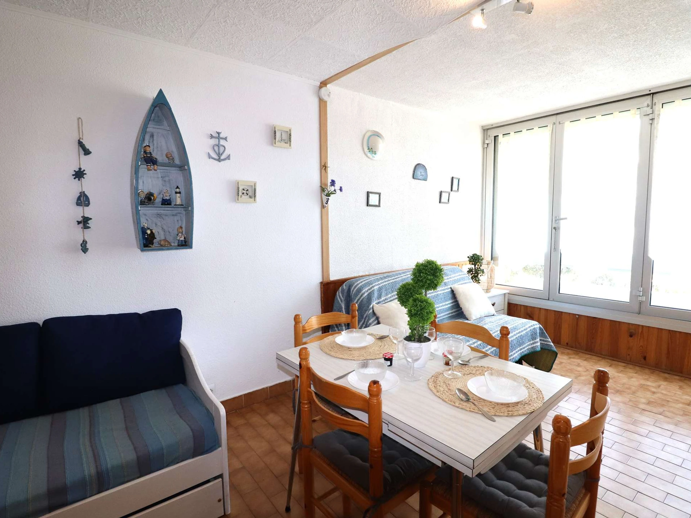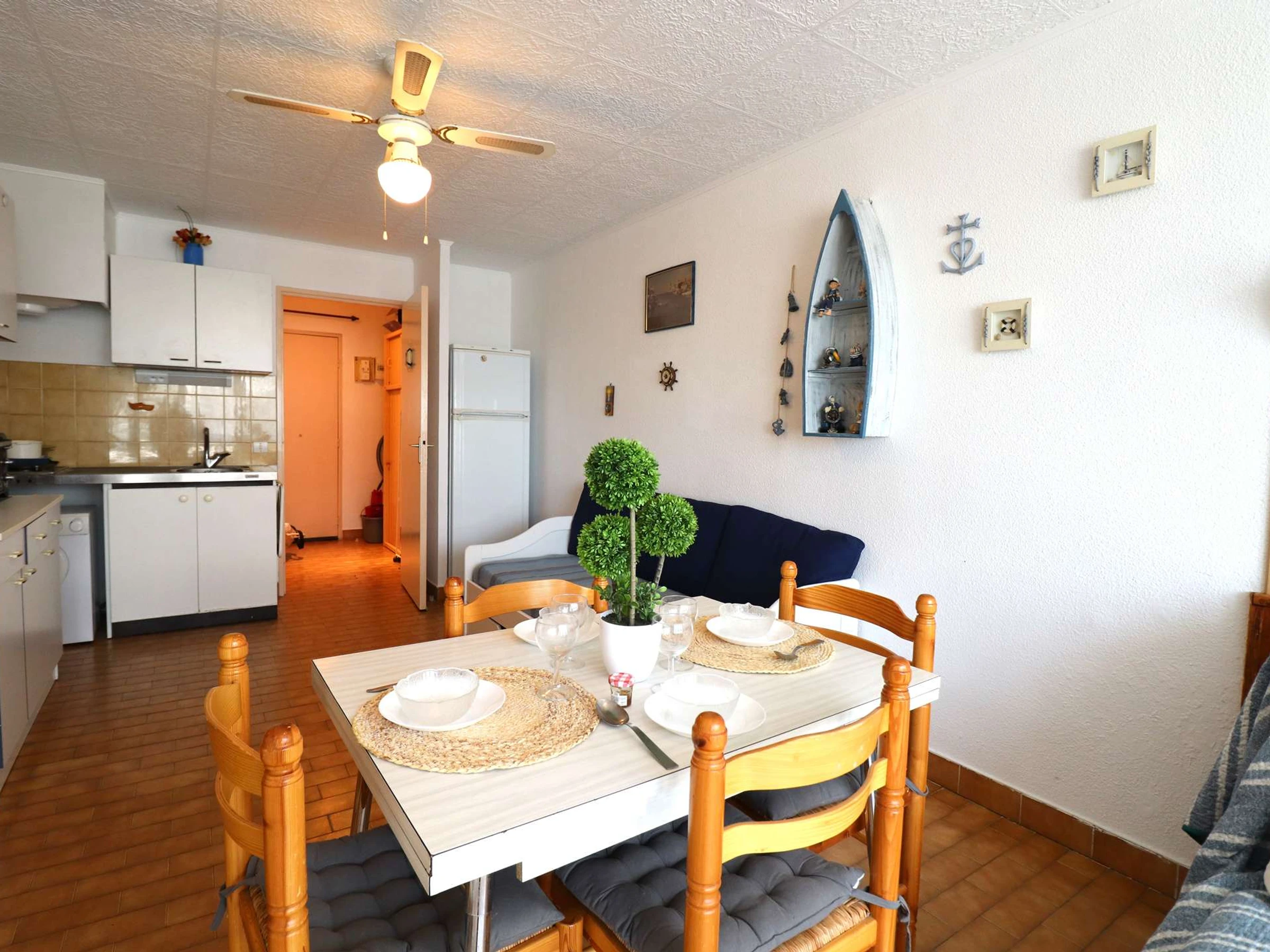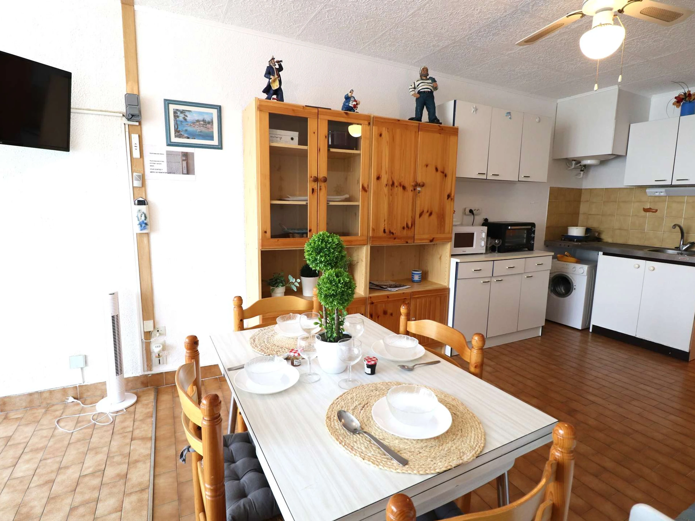 Il comprend un placard à l'entrée, salle d'eau avec [hidden], séjour spacieux, kitchenette équipée, banquette lit 2 personnes, + lit tiroir pour 2 couchages 1 place, une grande baie vitrée s'ouvre sur les jardins. Emplacement idéal pour de belles vacances en famille.