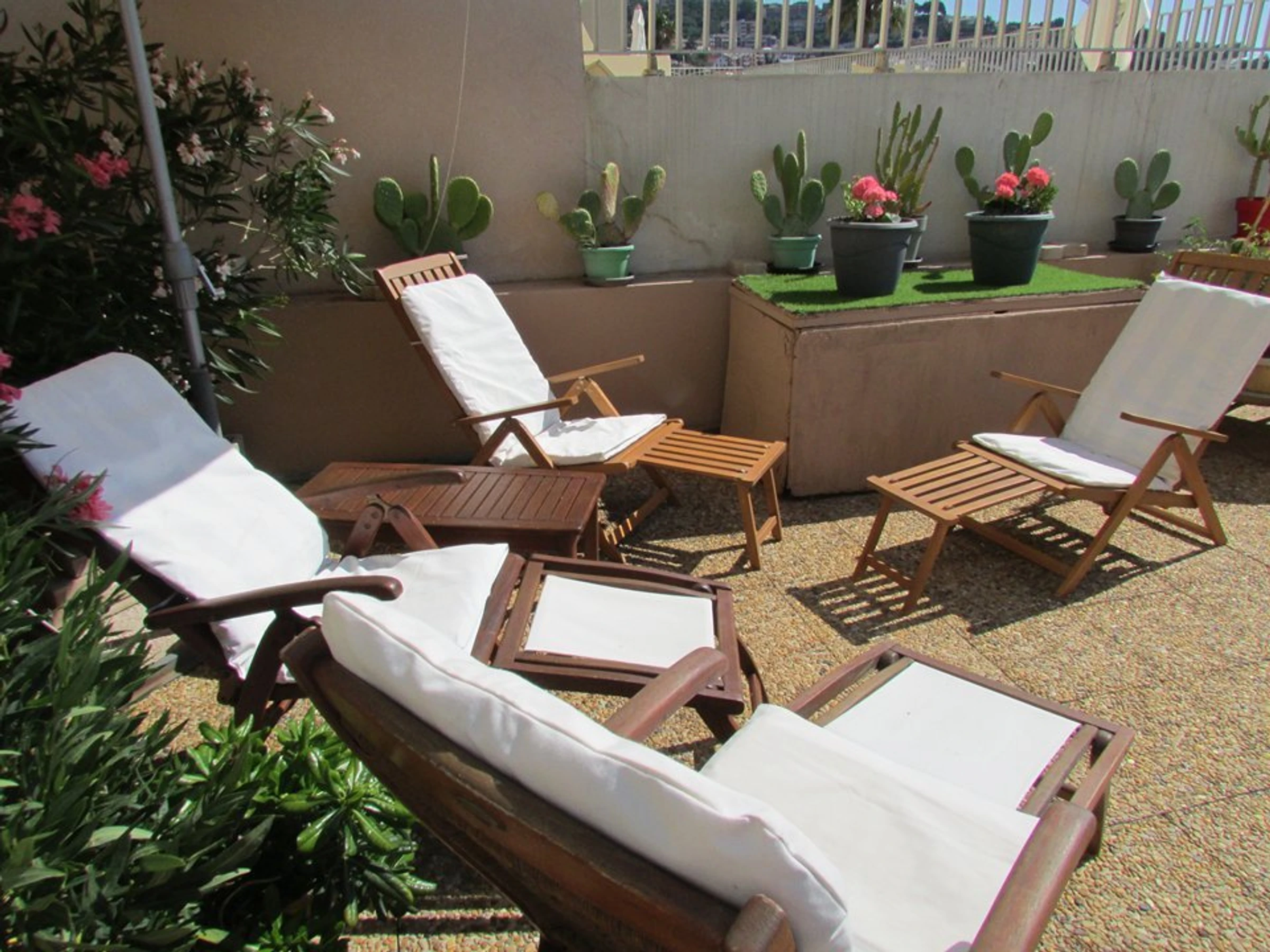 Séjour climatisé donnant sur grande terrasse face mer, avec tables+chaises, canapé, fauteuils, table basse, TV TNT+Box SFR. CH 1 climatisée : 1 lit de 160 (2 x 80) + 1 lit de 90, donnant sur terrasse face mer. Salle d'eau - Coin nuit avec 2 lits superposés. CH 2 climatisée vue collines avec 1 lit de 160 + rangement. Salle d'eau ( grande douche), sèche-serviettes - WC séparés -Box fermé - WiFi - classé 4*. En option, à réserver avant l' arrivée : kit 2 serviettes : 16 € - kit draps : 16 €. Ménage fin de séjour : 95 €