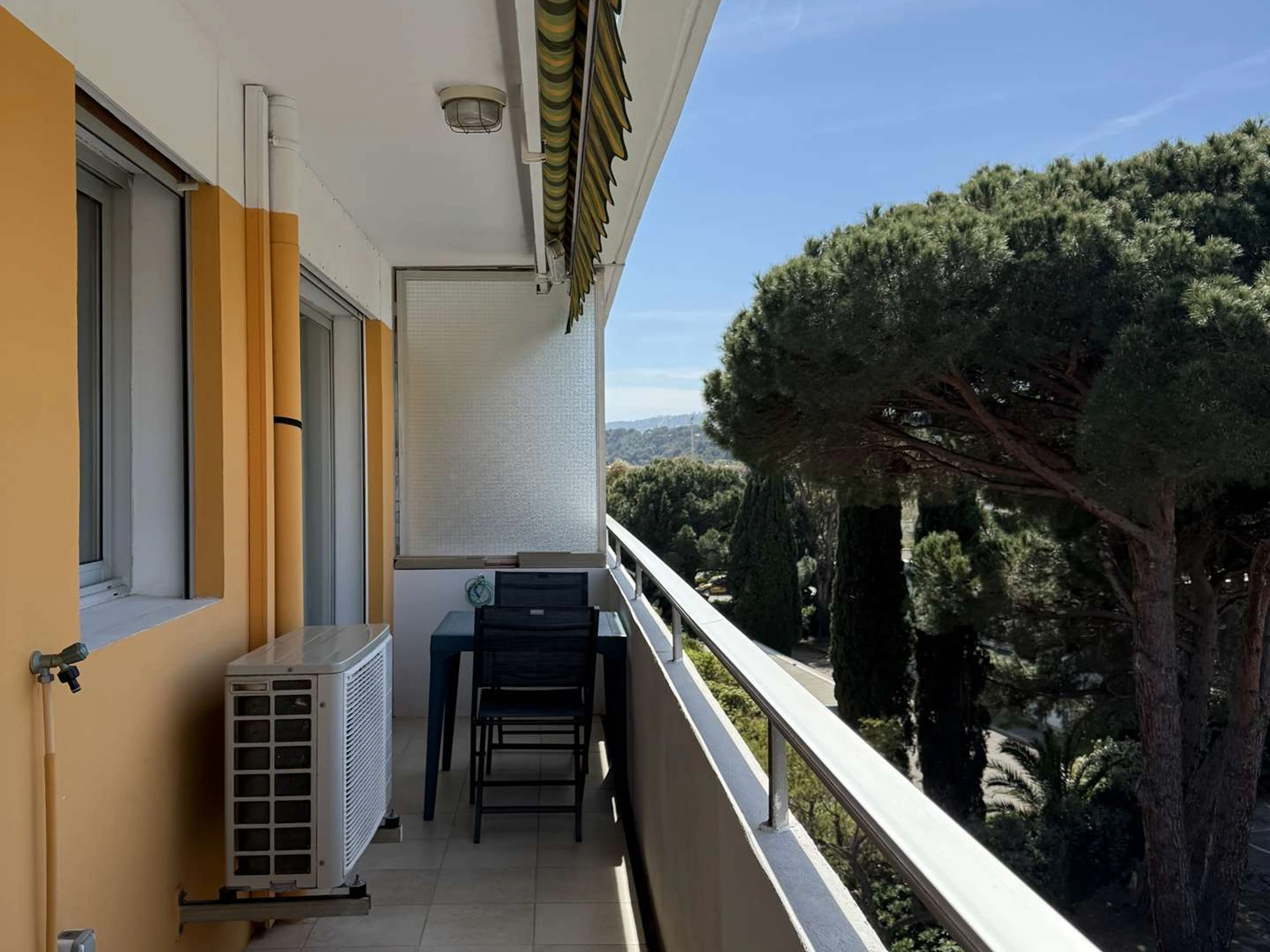 Le séjour climatisé, également doté de baies vitrées coulissantes, donne accès à une terrasse exposée sud-est, parfait pour profiter des beaux jours avec deux petites vues sur la mer. Il est meublé avec un canapé-lit (140 cm) pouvant accueillir deux personnes, ainsi qu'une table de séjour avec quatre chaises et une TV.