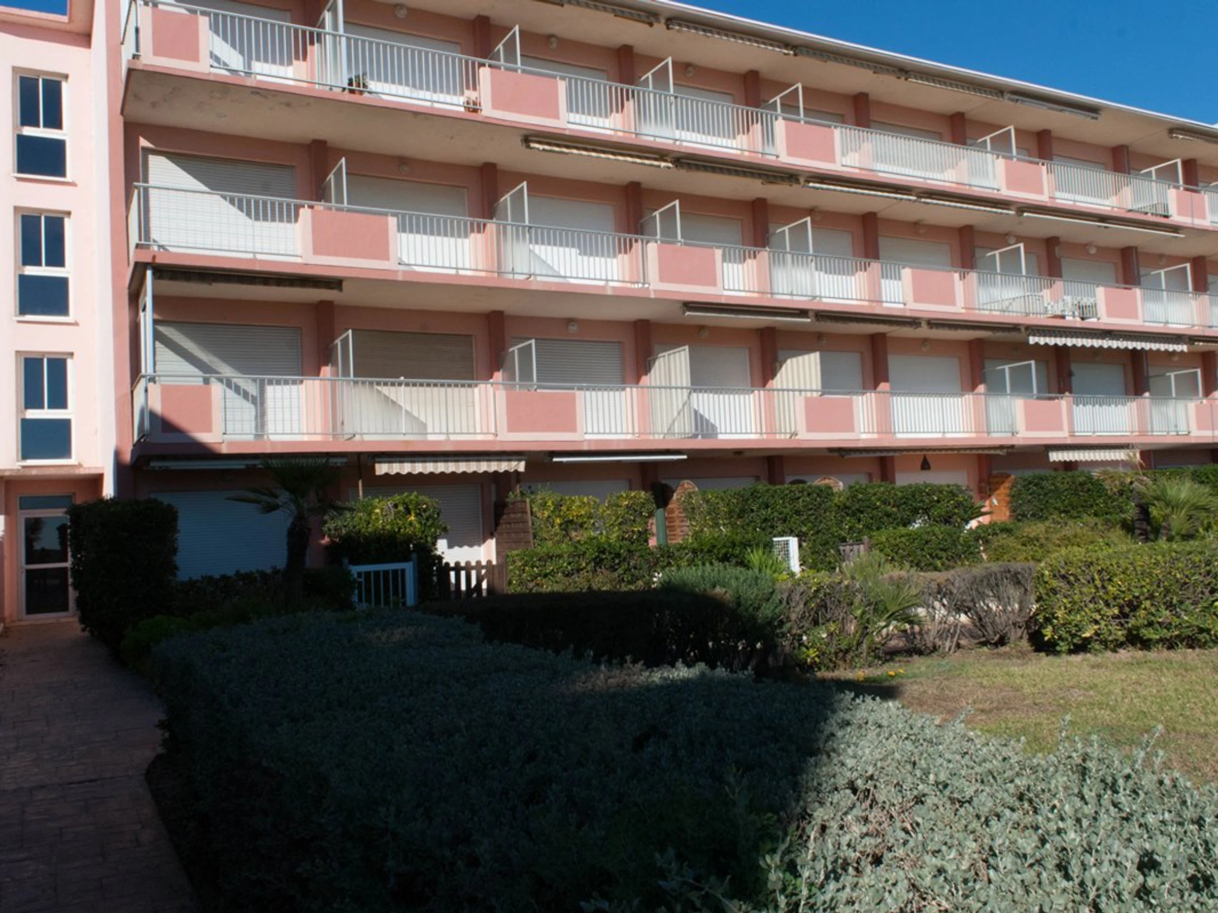 Ref: HUM01, Le Lavandou, Résidence les pieds dans l'eau, Beau studio + cabine de 25 m² avec jardin privé de 15 m². donnant directement sur la plage de sable fin de l 'Anglade. Entrée, coin nuit avec 2 lits superposés (80 cm) - salle d'eau + WC. Séjour avec un canapé lit BZ de 140 cm. Coin Cuisine équipé (frigo, congel,four,MO,plaques à induction).
