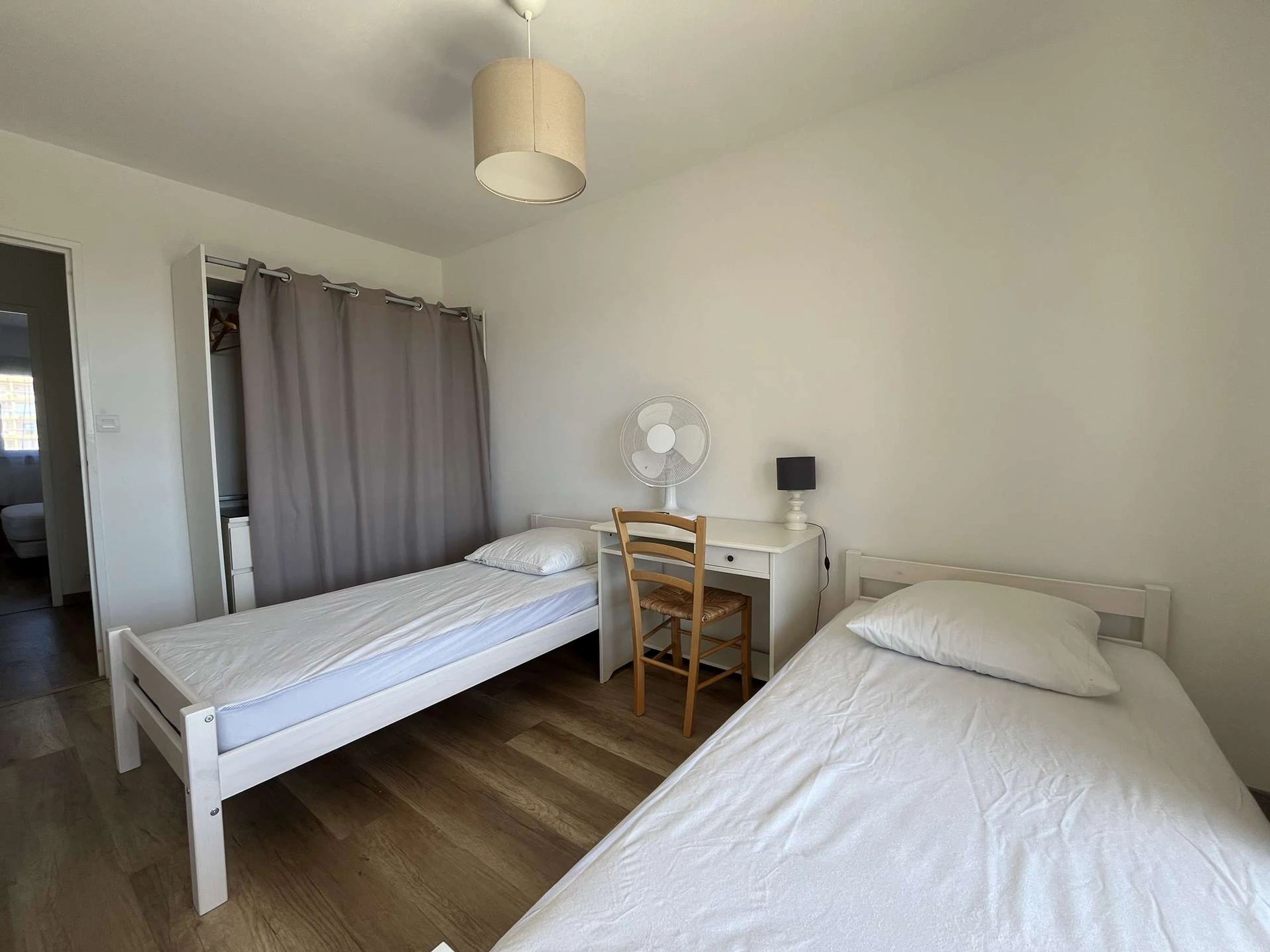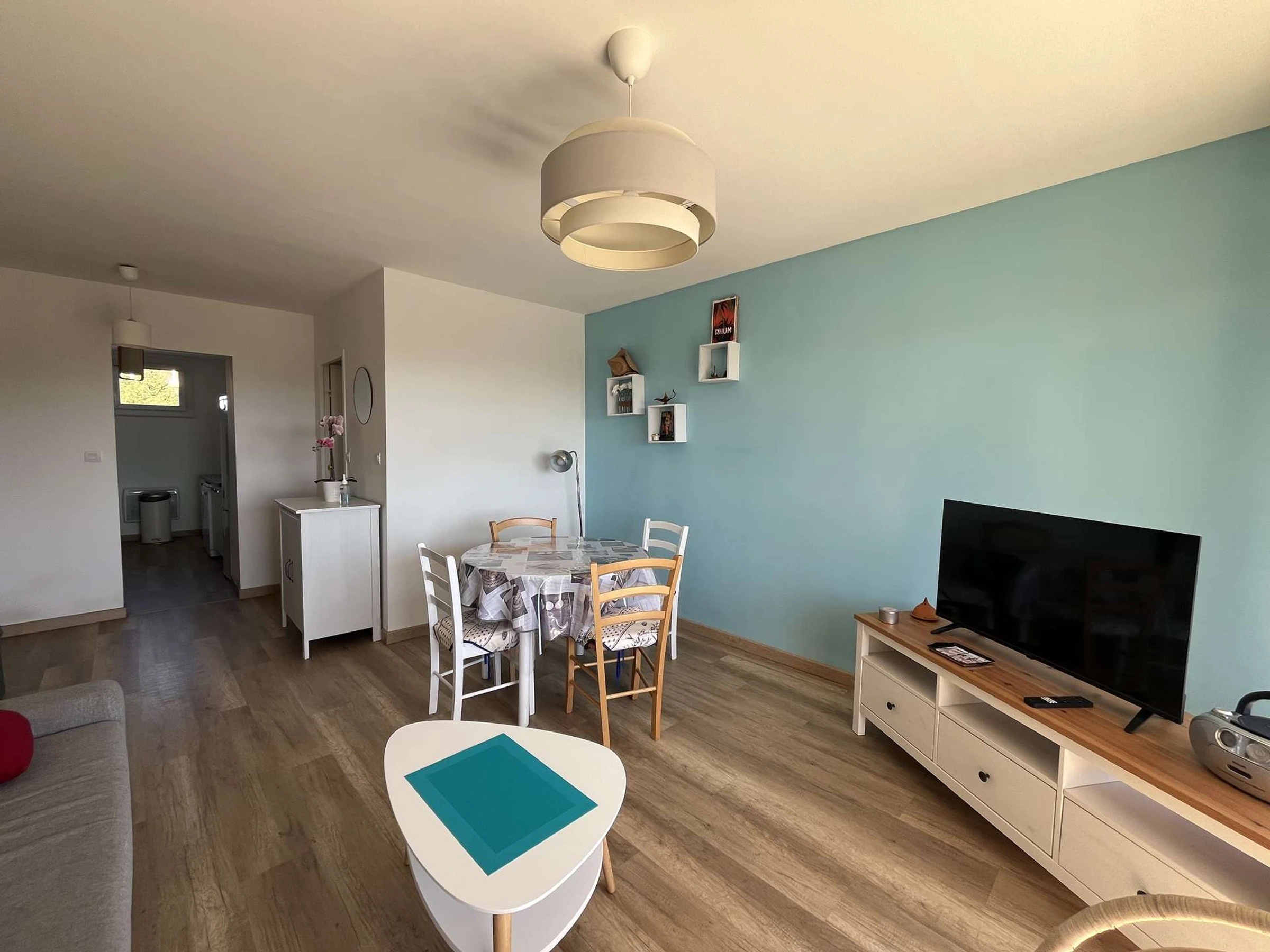 L’appartement dispose de deux chambres calmes et agréables. Le salon, lumineux et cosy, est équipé d’un écran plat et d’un espace repas avec une table et quatre chaises.