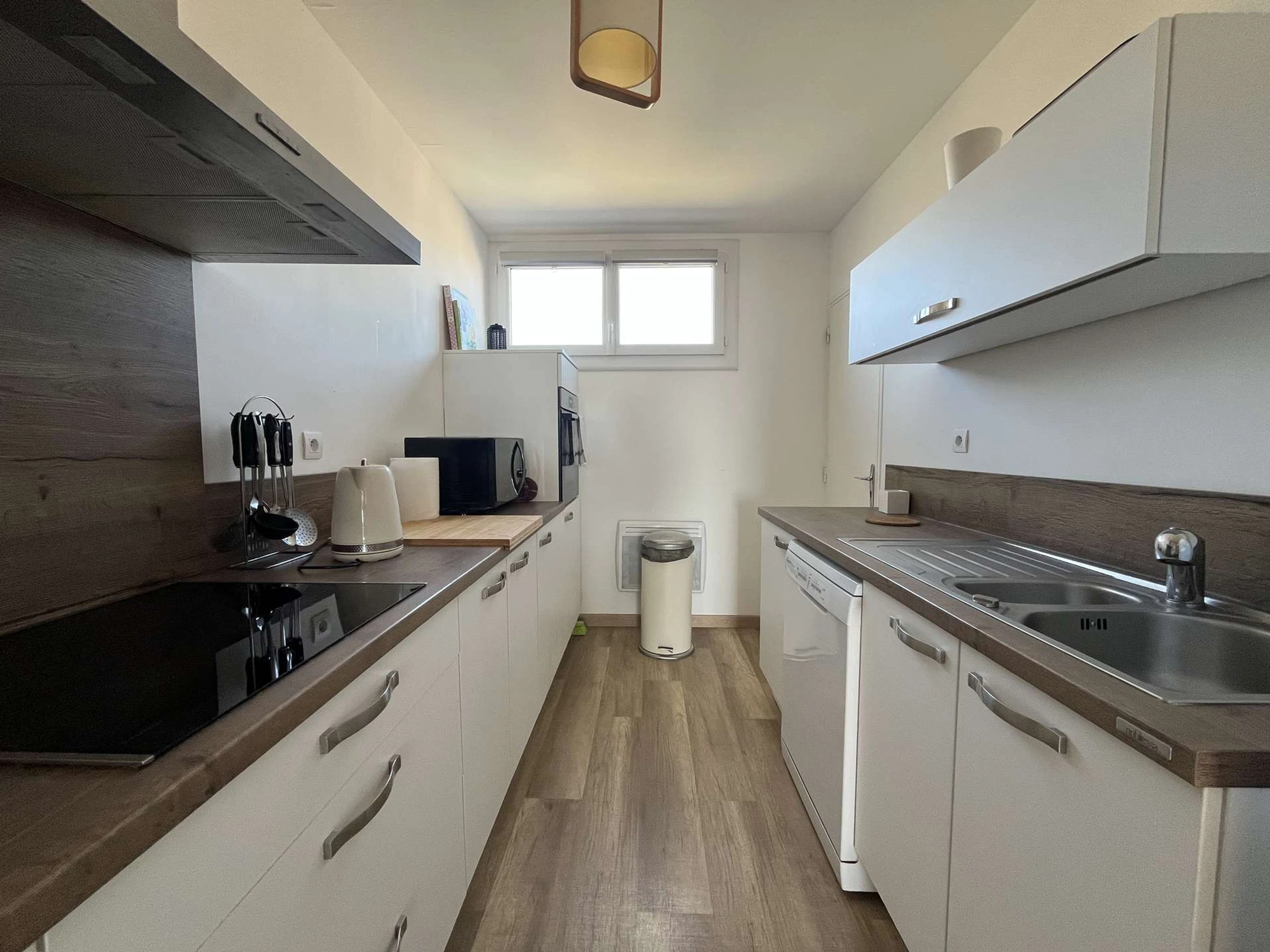 La cuisine est entièrement équipée : four, micro-ondes, lave-vaisselle, réfrigérateur/congélateur, plaques de cuisson, cafetière.