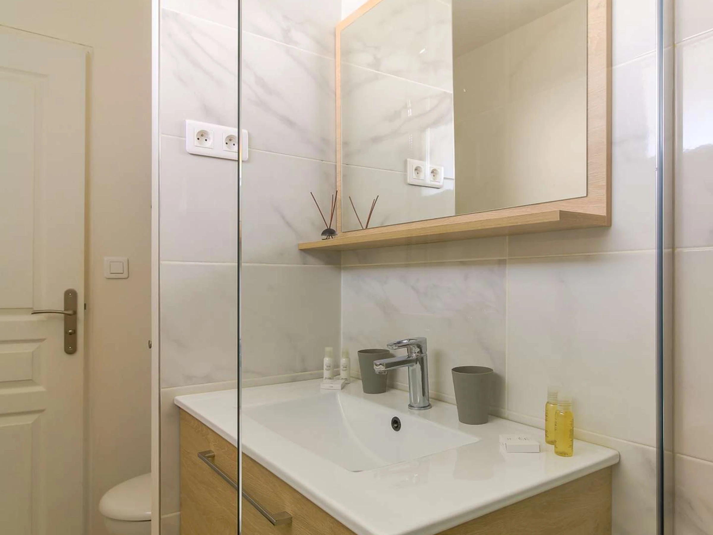Côté nuit, une chambre douillette avec lit double et rangements garde les valises hors de vue. La salle d’eau, esprit spa urbain, propose une belle douche, vasque moderne et WC, le tout dans une ambiance claire et apaisante.
