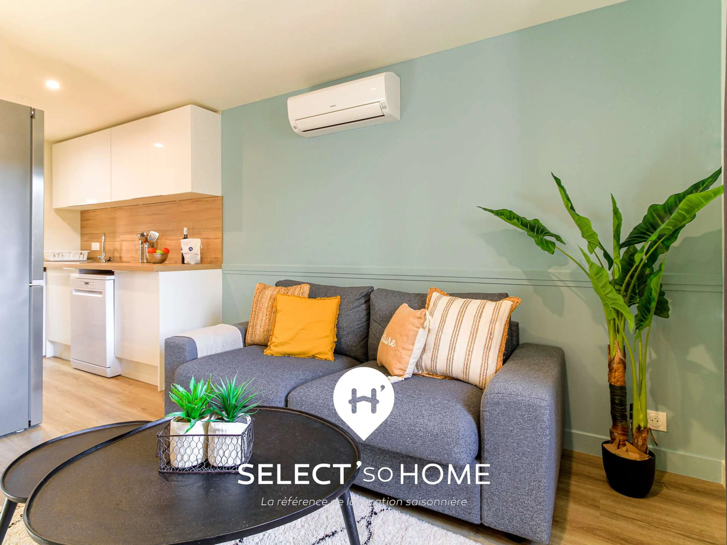 La grande pièce de vie s’ouvre comme une scène conviviale : la cuisine en fond, tout équipée, se prête volontiers aux petits déjeuners paresseux ou aux apéros qui s’improvisent autour de la table en bois clair. Le salon, lui, invite à la détente absolue — canapé convertible moelleux, coussins ocre et touches végétales qui rappellent l’été même en hiver. On y sent la bonne humeur flotter.