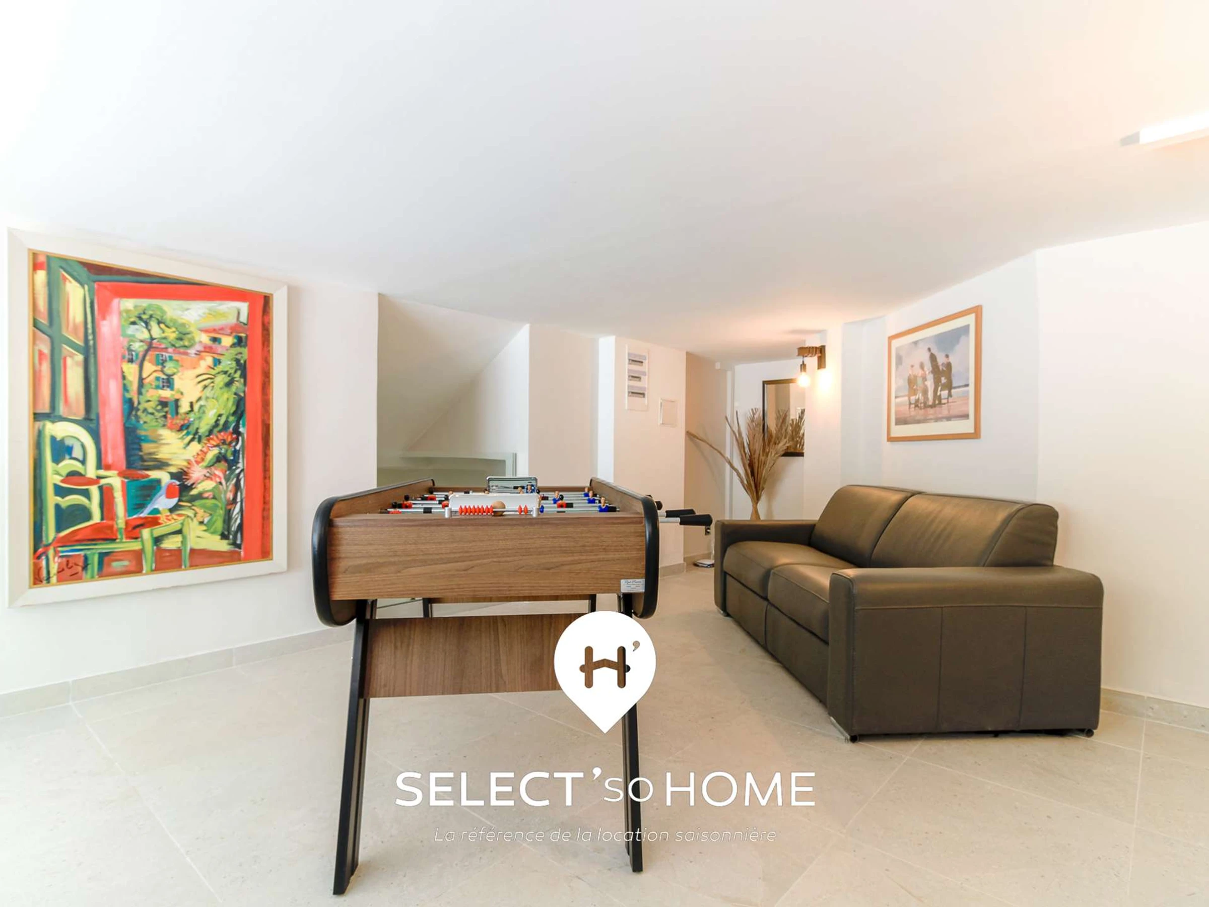 Au niveau suivant, vous aurez le plaisir de profiter d’une grande salle de détente avec un coin TV et un baby-foot, idéal pour des moments conviviaux.