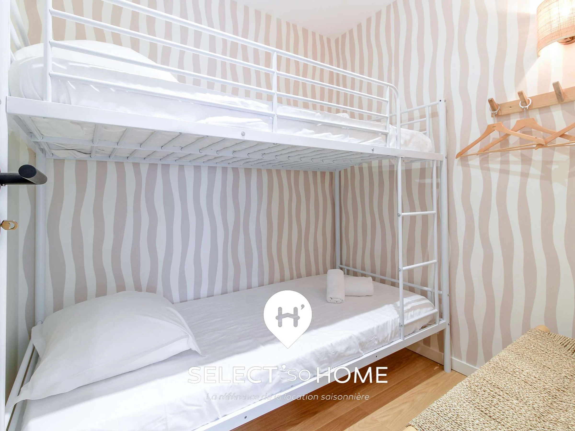 Deux chambres composent l’espace nuit : une première, calme et lumineuse, avec un lit double pour se poser vraiment. Et une seconde, avec des lits superposés, pensée pour les enfants, les duos, ou les confidences d’ados. Une salle d’eau avec douche à l’italienne, des WC séparés, et un agencement global fluide, agréable à vivre, où rien ne manque.