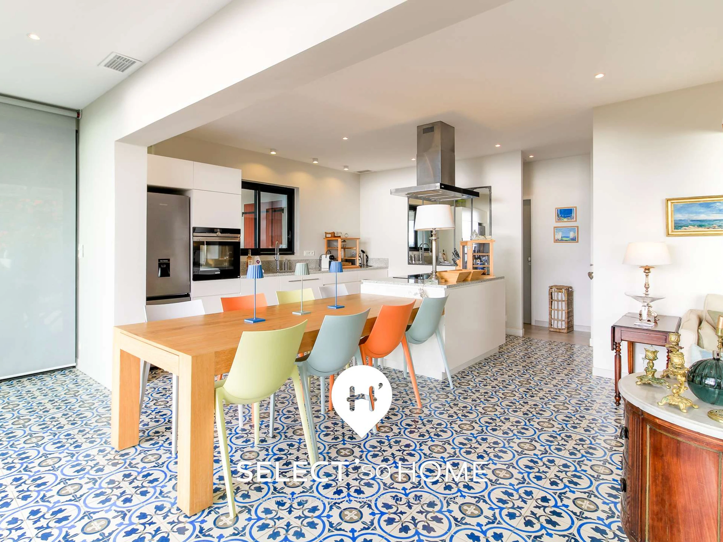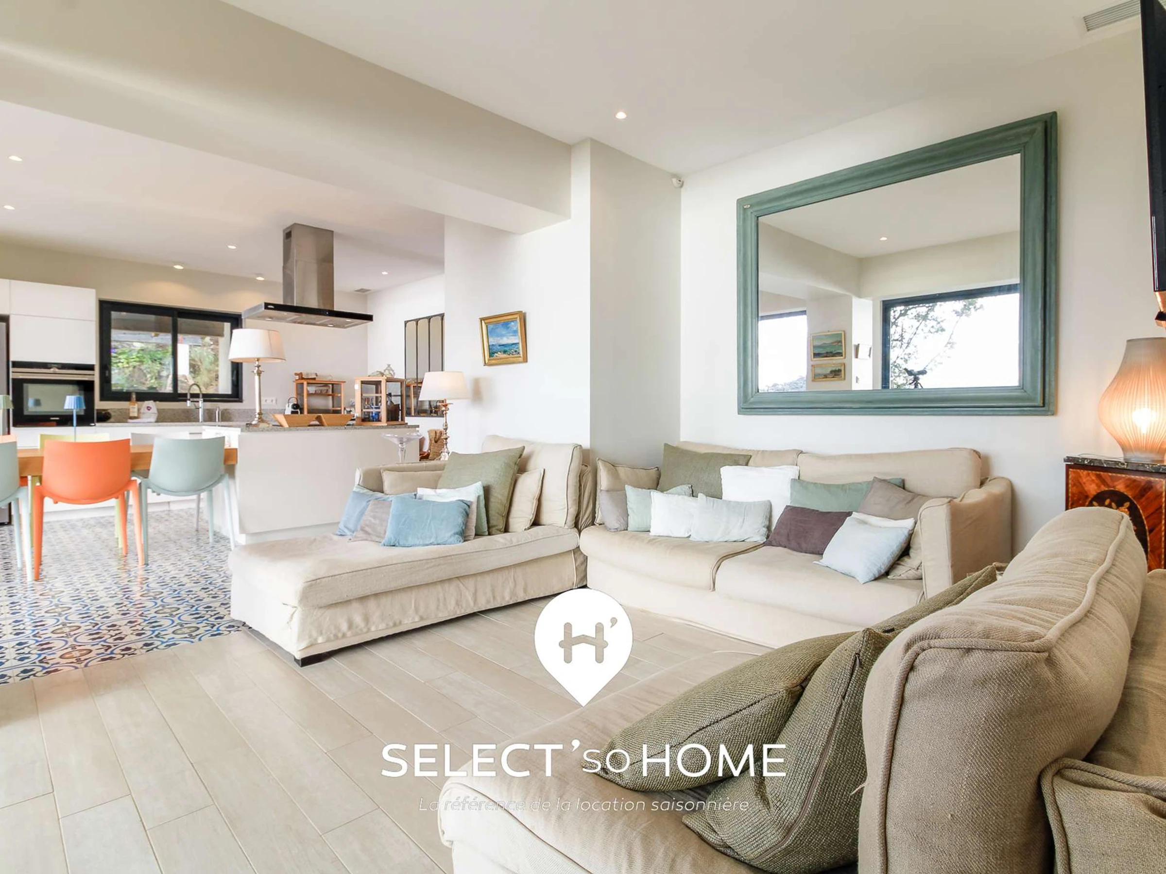 À l’intérieur, la lumière se glisse partout et transforme la grande pièce de vie en scène ouverte sur l’été. Cuisine généreuse, grande table conviviale, salon qui regarde la mer droit dans les yeux : tout circule, tout respire. On cuisine en discutant, on dîne en admirant le ciel qui s’embrase, on prolonge les soirées sans jamais se sentir à l’étroit. La déco mêle élégance douce et accents méditerranéens, créant une ambiance qui fait oublier que l’on est simplement en vacances, et non chez soi dans une version sublimée.