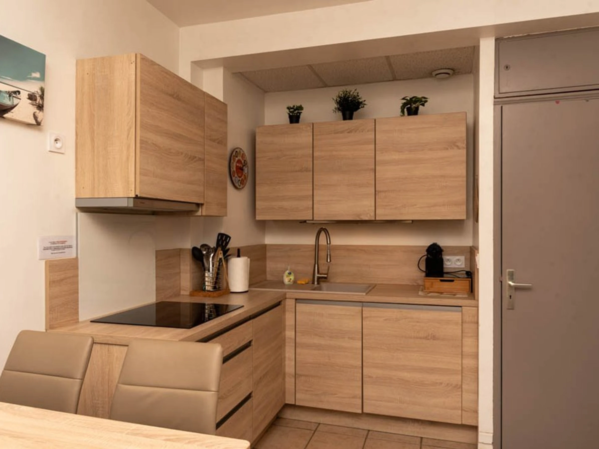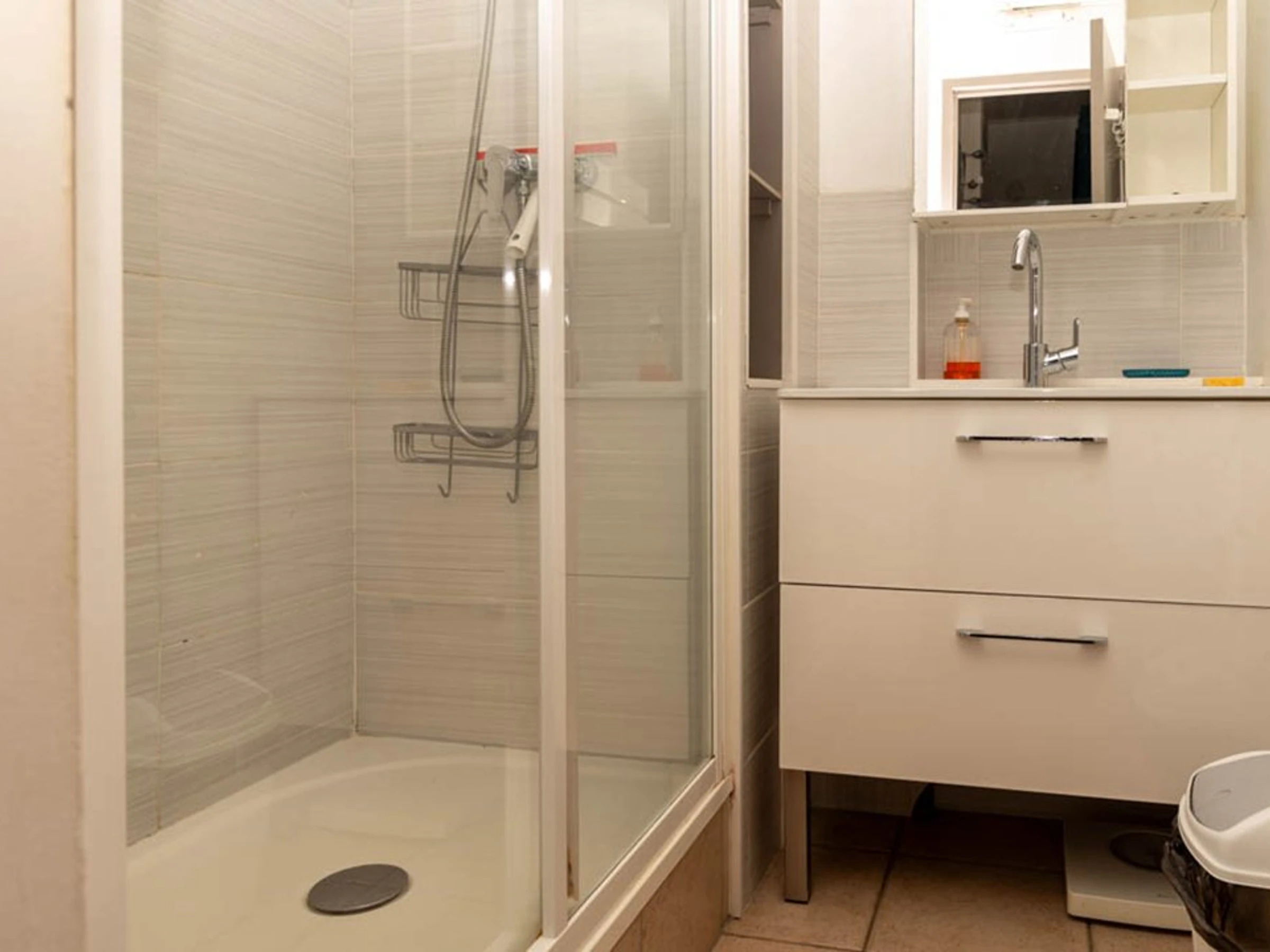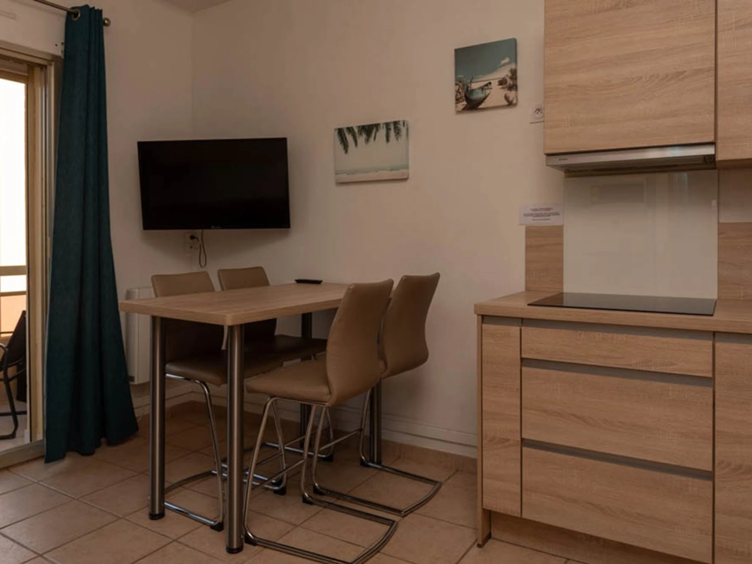 T2 Cabine de 33 m² pour 4 pers au 1er étage par ascenseur, balcon aperçu mer et le port. Entrée, salle d'eau, wc indépendant, chambre climatisée avec 1 lit de 160 cm penderie et placard, coin nuit avec 2 lits superposés de 80 cm. Séjour, TV, kitchenette équipée (plaques électriques, réfrigérateur congélateur, LV,LL, MO). Parking n°41 Taxe de séjour 2* en sus 1.44€/jours/pers