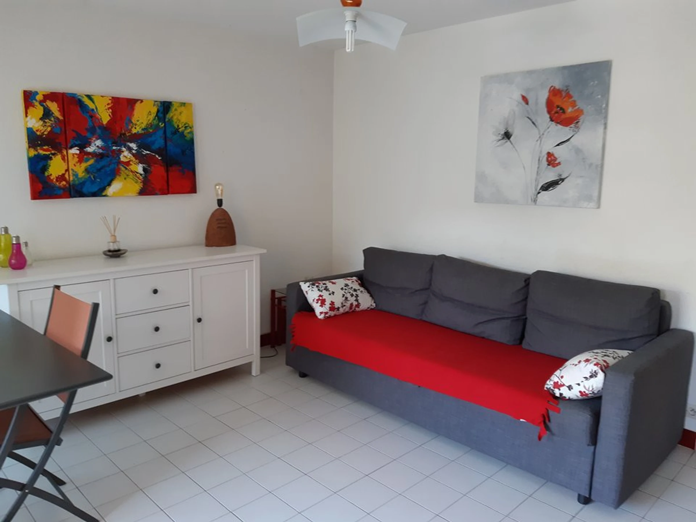 Entrée, placard + penderie, séjour ouvert sur terrasse équipée de 6m² vue rue, un canapé convertible 2 places; coin cuisine tout équipé (2 plaques vitrocéramiques, frigo+congélateur, four/MO, lave linge). Une chambre avec lit de 140x190 cm, un coin nuit avec 2 lits superposés de 90x190 cm, une salle d'eau + wc . TV, climatisation Parking privé n°249. Piscine collective ouverte de juin à septembre. barbecues et planchas interdits