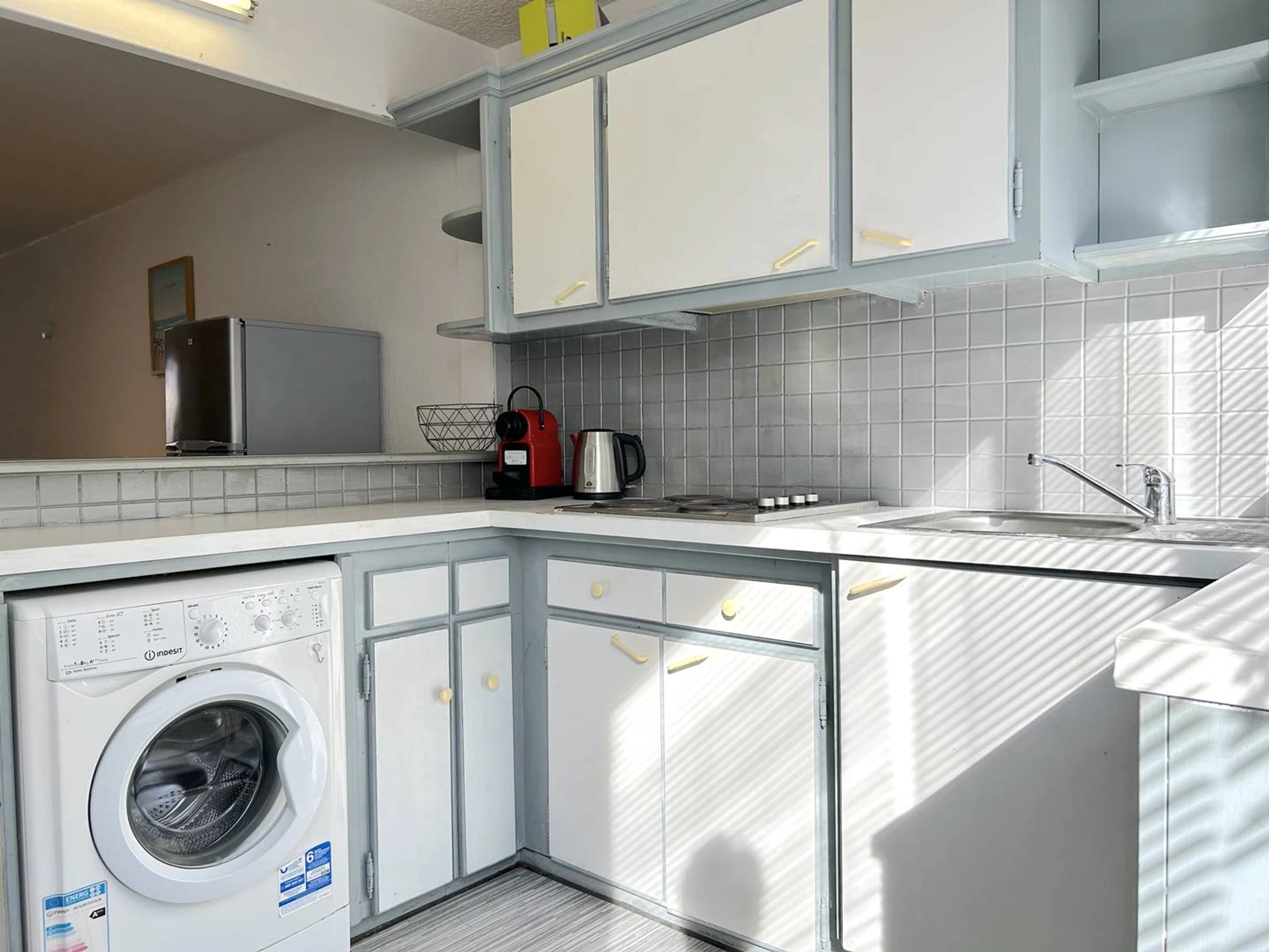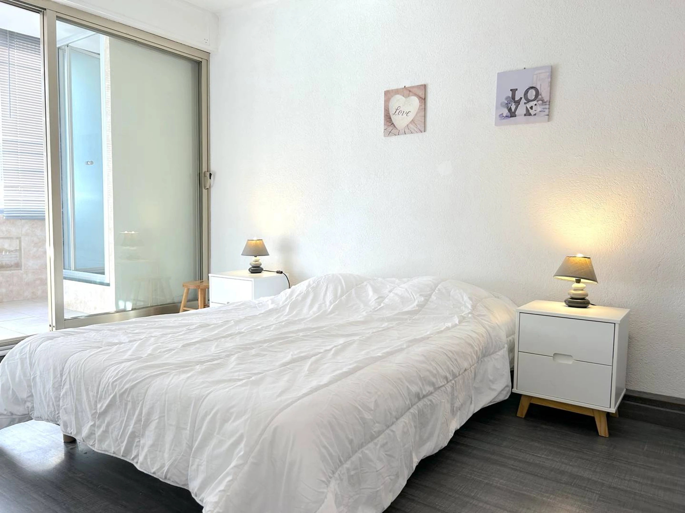Cet appartement de type T2 cabine climatisé d'environ 70 m² situé au premier étage des commerces, accès en rez de chaussée, exposé SUD est équipé d'un canapé clic-clac (140) deux personnes dans le séjour, d' une chambre avec un lit en 140 et sa salle d'eau, d'une cuisine équipée ouverte sur le séjour et un wc indépendant.