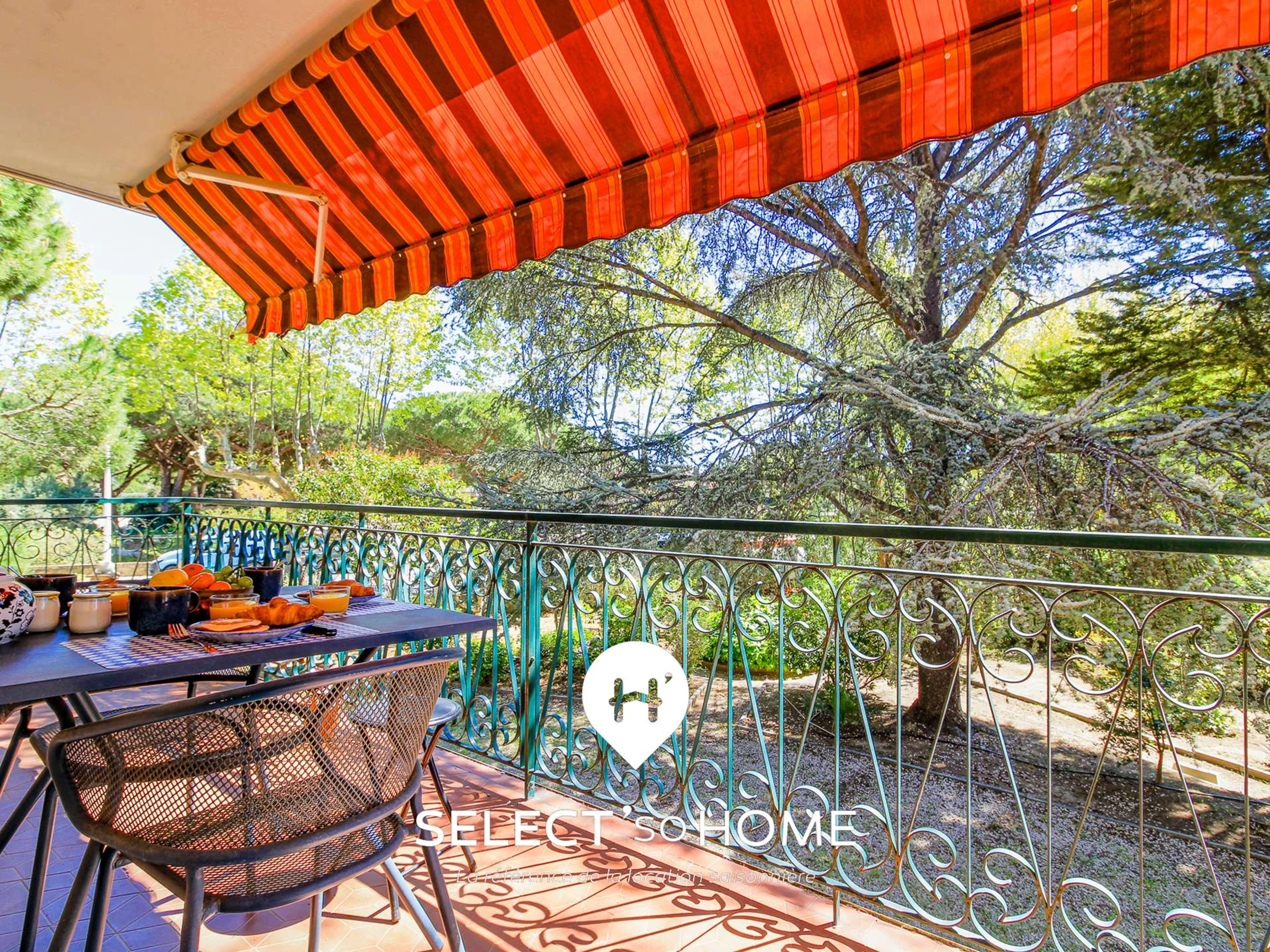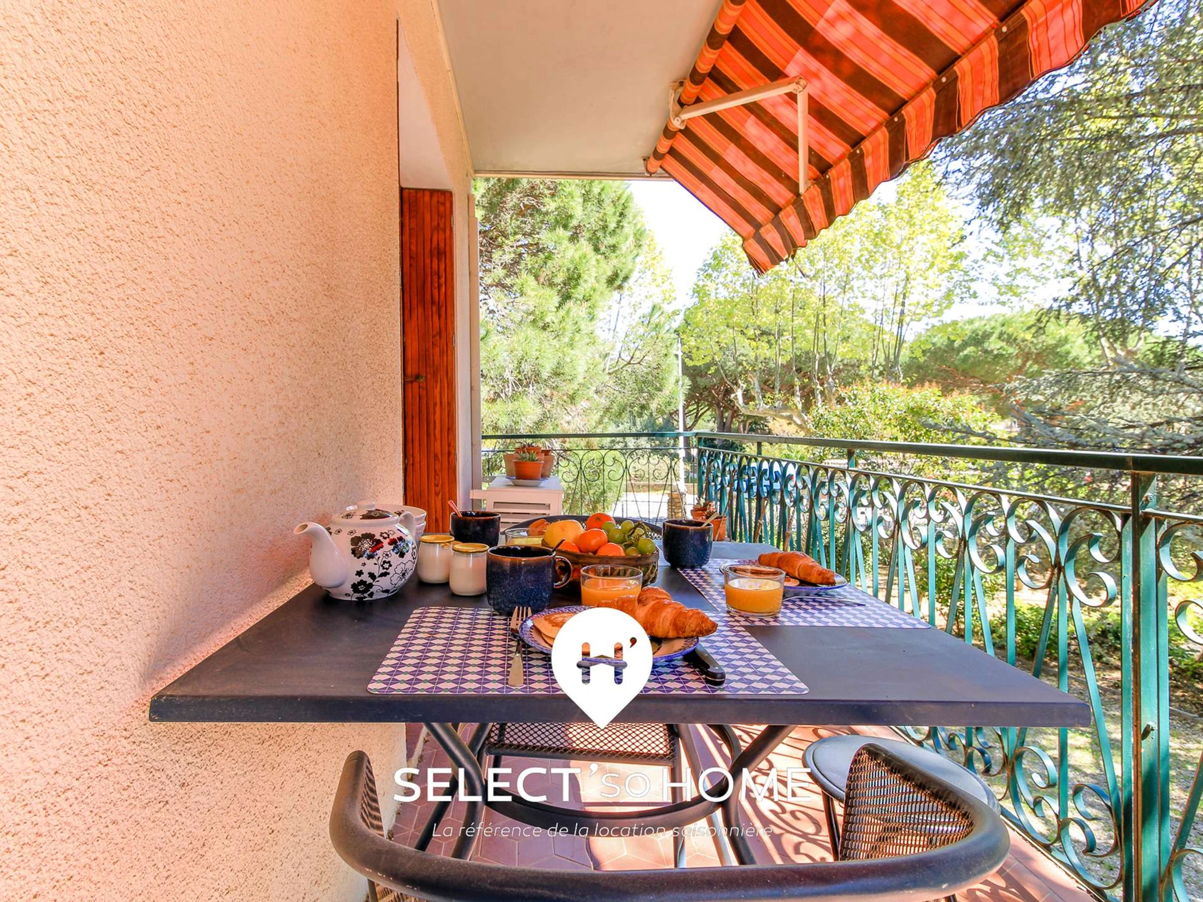 Le matin, le café se prend sur le balcon. C'est une règle non écrite qui s'impose dès le premier jour, parce que ce balcon filant face aux pins parasols et au ciel bleu du Midi a quelque chose d'irrésistible à l'heure où tout est encore calme. On s'y installe pour cinq minutes, on y reste une heure. L'auvent rayé tamise le soleil sans le bloquer, les cigales font leur travail, et la journée commence avec ce rythme lent qui est la vraie définition du Sud.