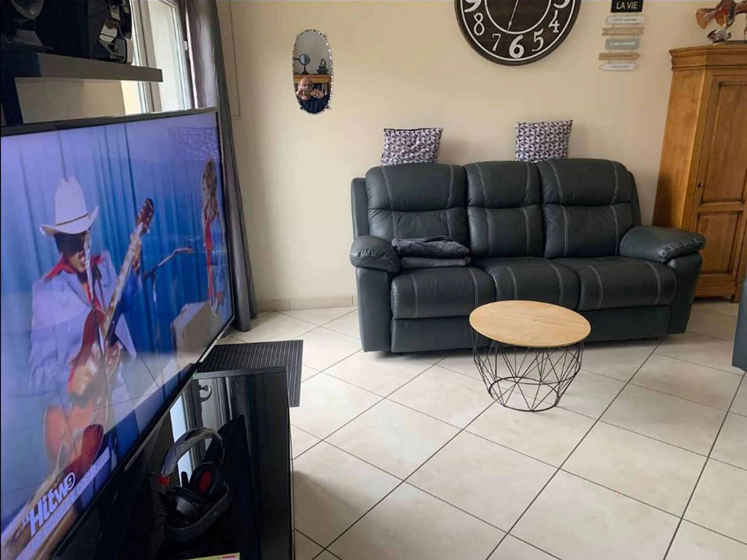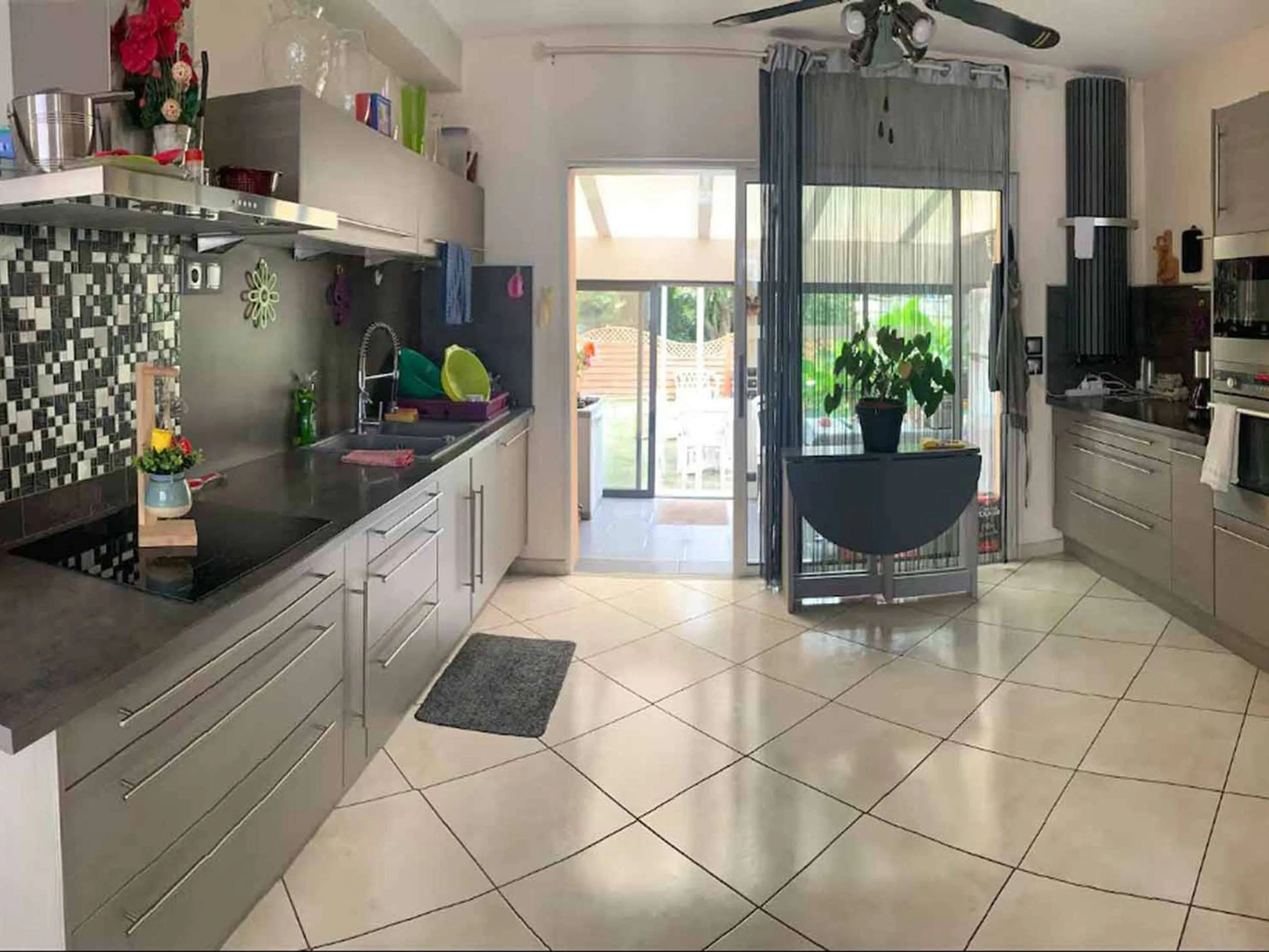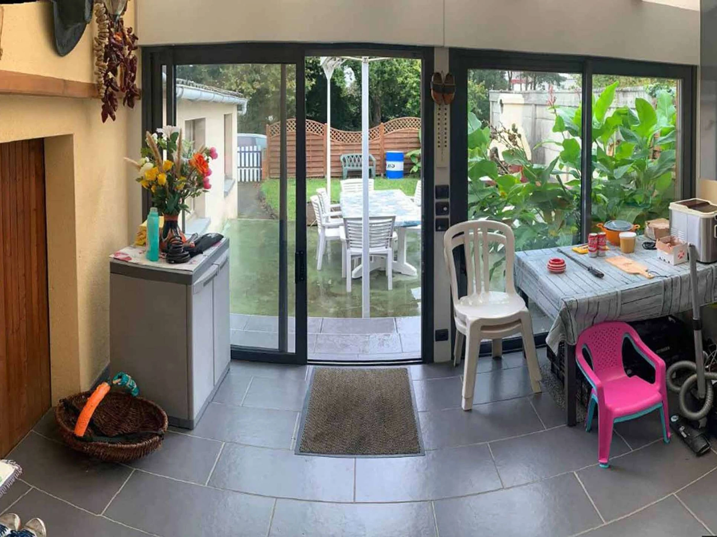 Une entrée avec une grande pièce de vie avec un espace salle à manger et un espace salon avec un canapé relax et un fauteuil relax, table basse, télévision, wifi, une cuisine aménagée et équipée (plaque de cuisson, four, micro-onde, frigidaire, congélateur, petit électroménagers), , un wc séparé, une veranda donnant sur une terrasse de 25 m2 avec store banne, barbecue fixe, salon de jardin 6 personnes.