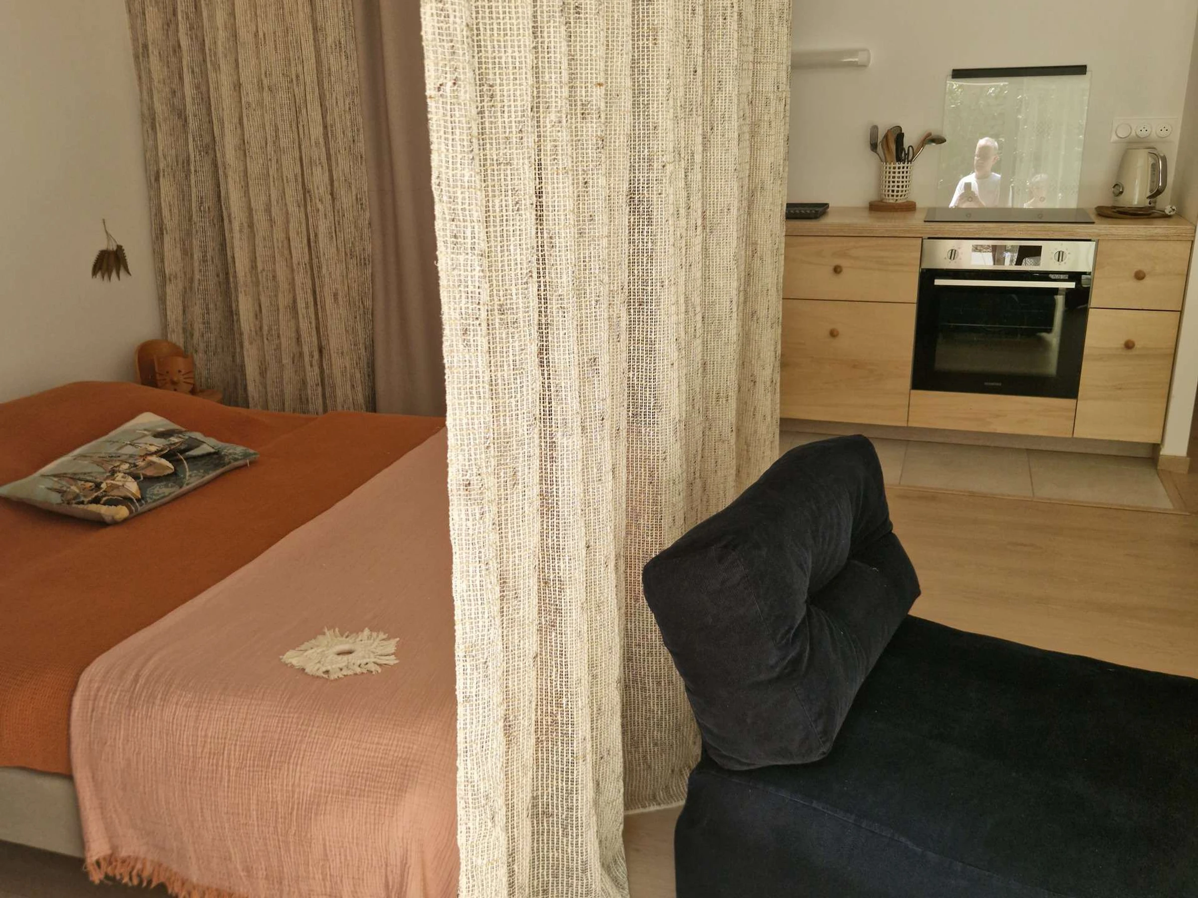 - Côté salon, un lit 160x200cm (séparable par un rideaux), un canapé, table et chaises, wifi.