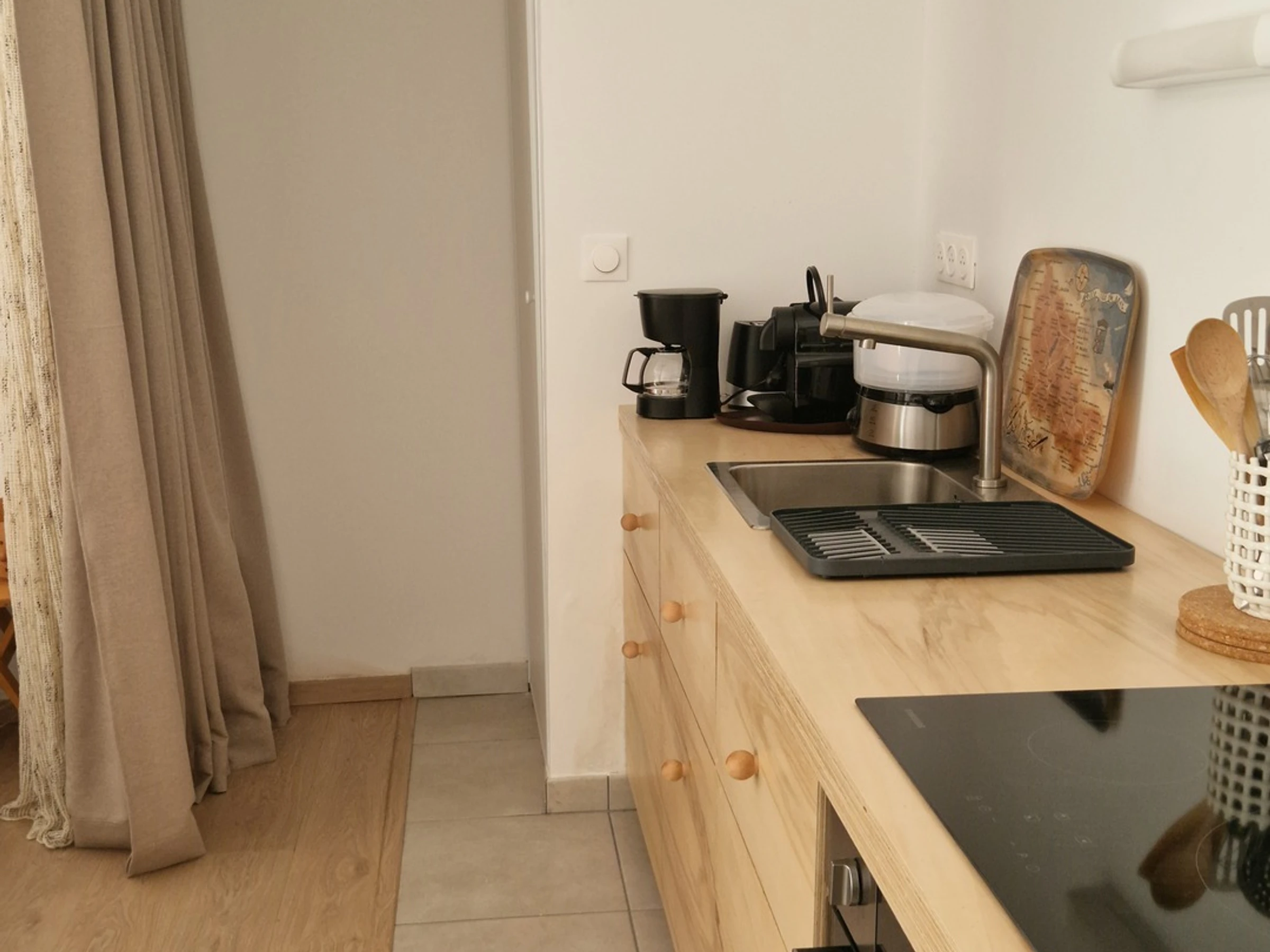 - Cuisine aménagée, équipée d'une plaque à induction, un four traditionnel, un réfrigérateur avec compartiment freezer, cafetière filtre et Nespresso, grille pain, bouilloire, cuit vapeur.