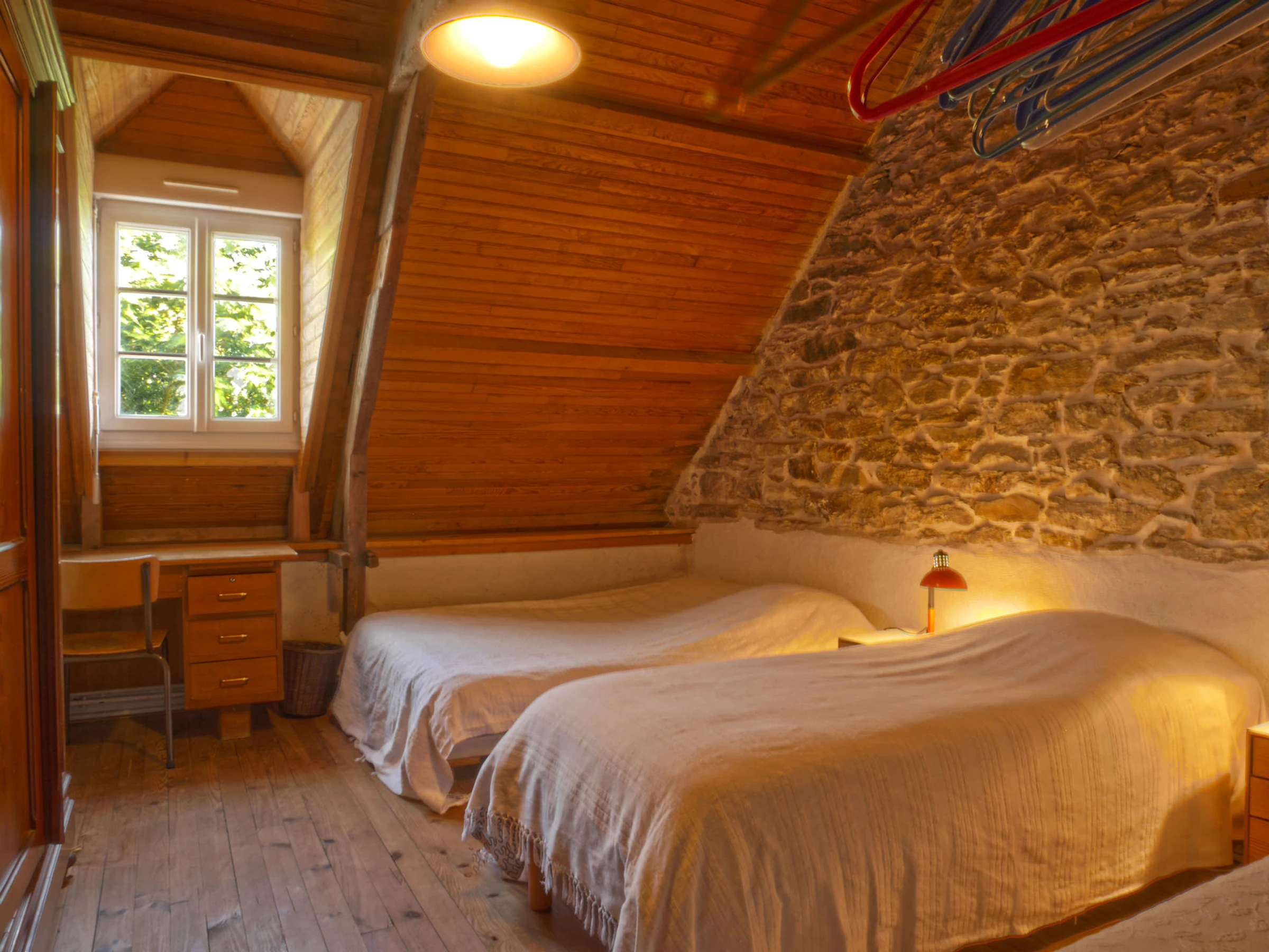 -Une mezzanine mansardée (11 M²) avec 2 lits de 90 x 190 cm accolés. (grande couette 240*220)