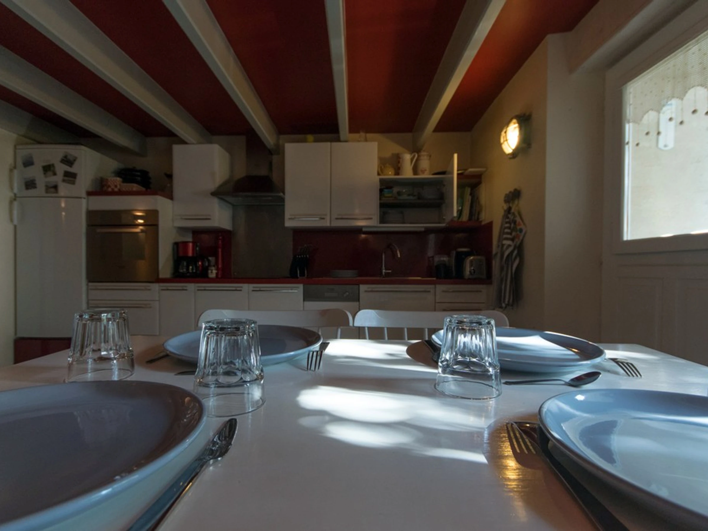 - Une cuisine indépendante (20m²) avec plaques inductions, réfrigérateur, partie congélateur, lave-vaisselle, table et chaises.