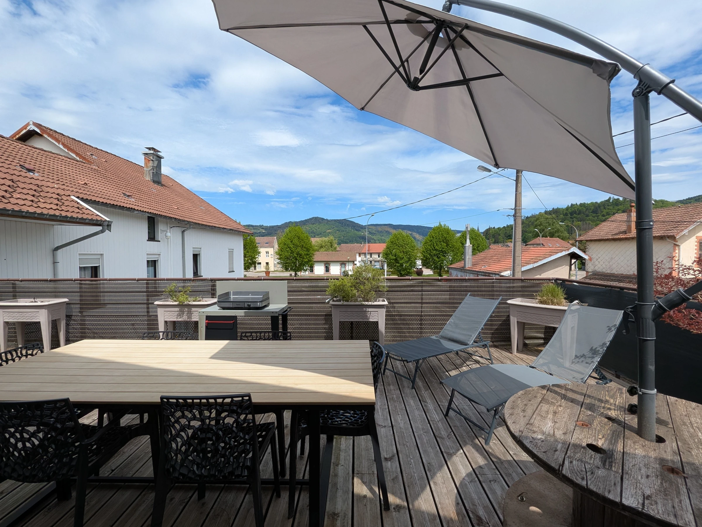 - Une grande terrasse bois avec salon de jardin et barbecue électrique.