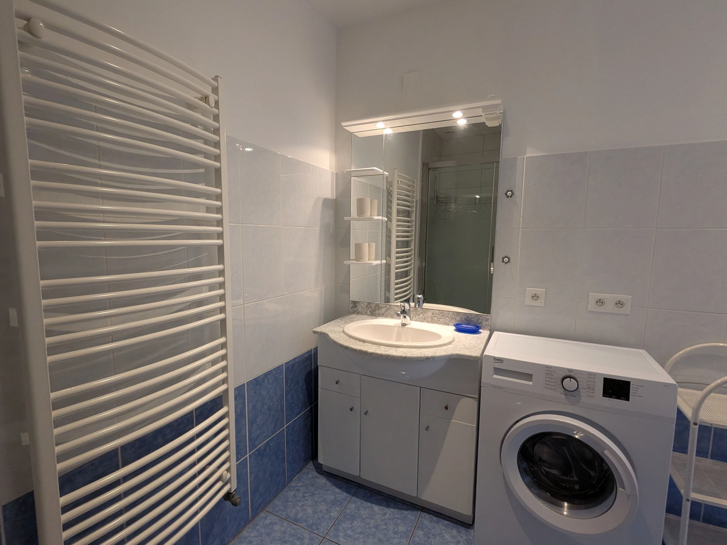 - D'une Salle d'eau avec grande douche, sèche serviette chauffant, sèche cheveux et lave linge.