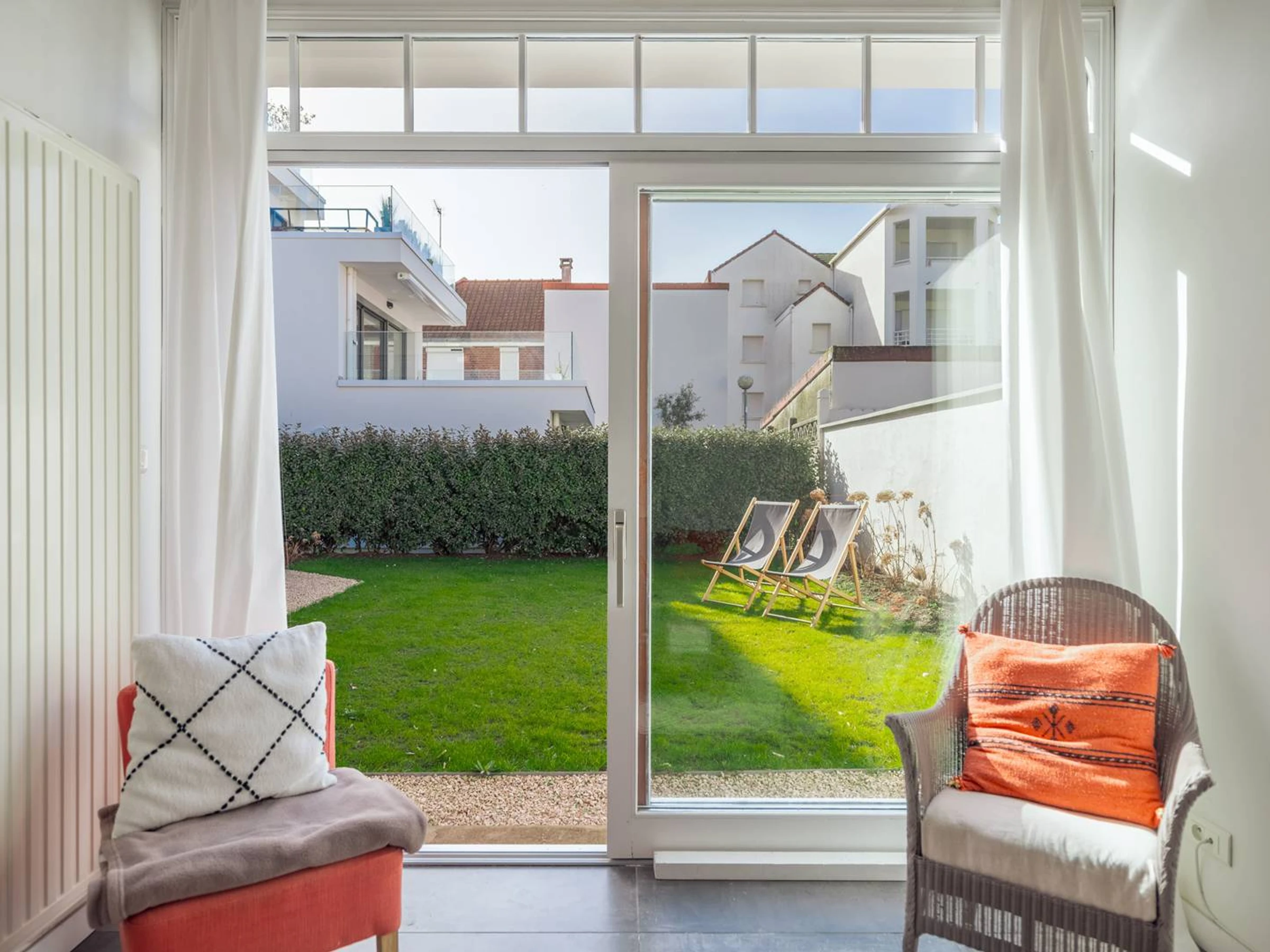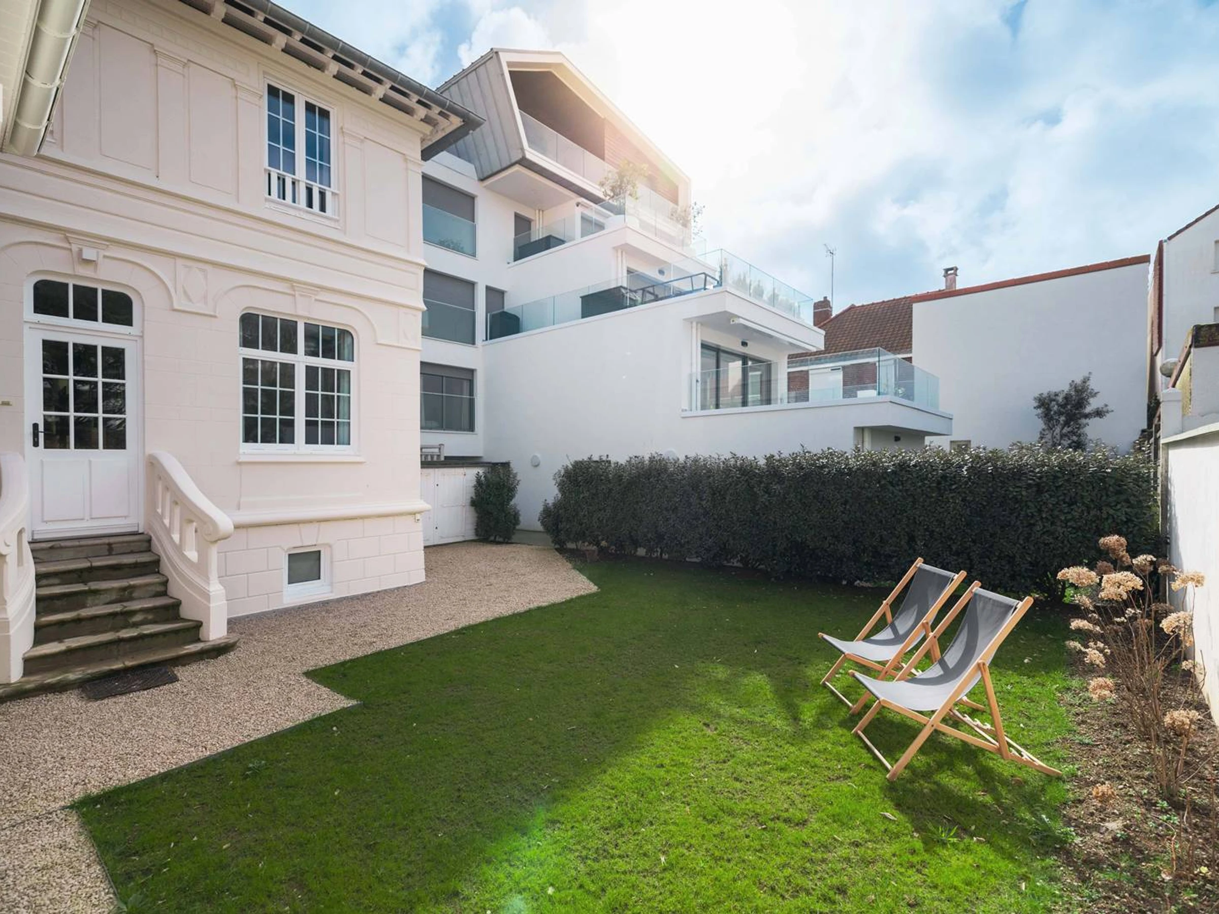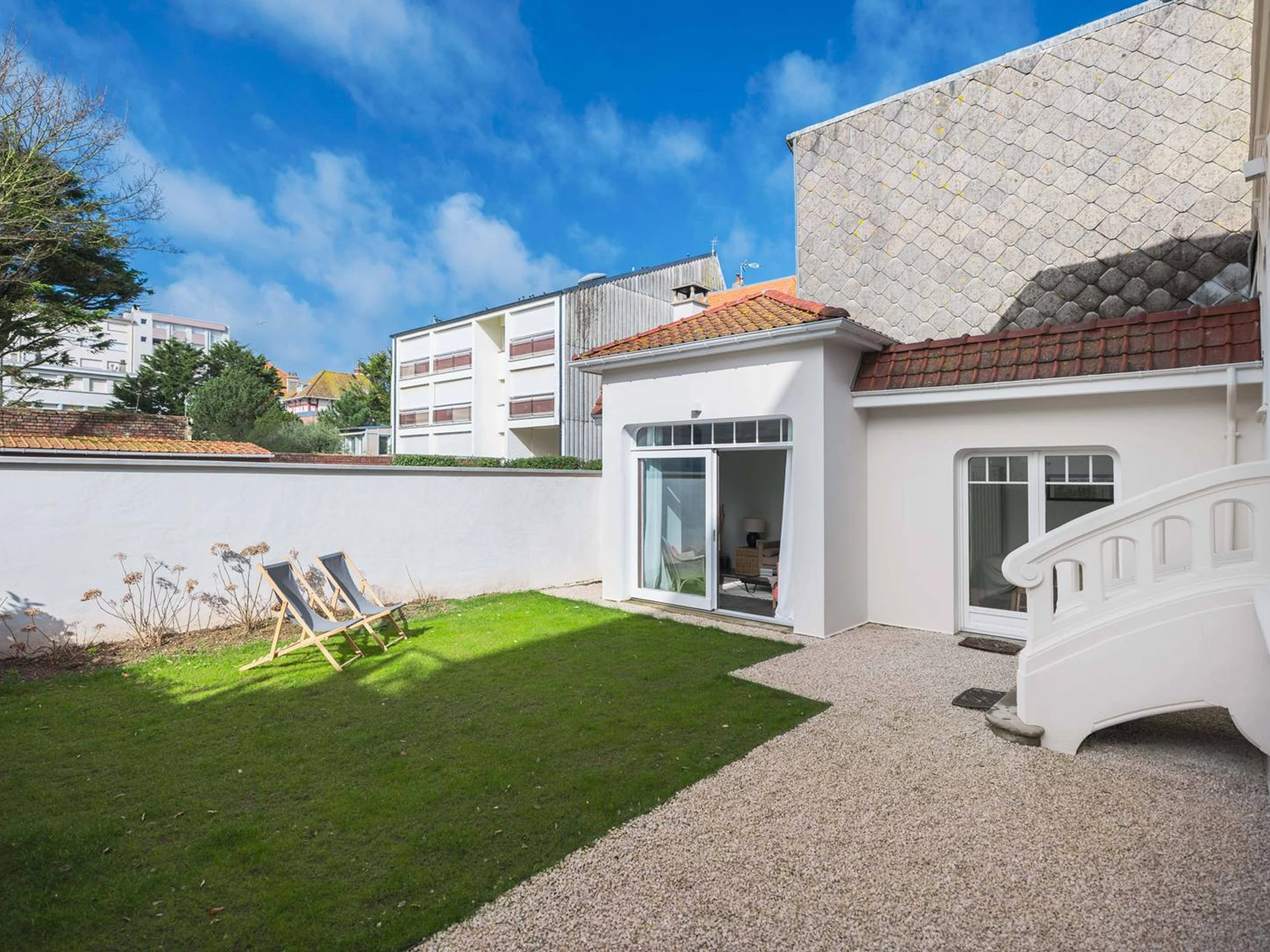 Jardin avec mobilier (chaises, tables, transats).