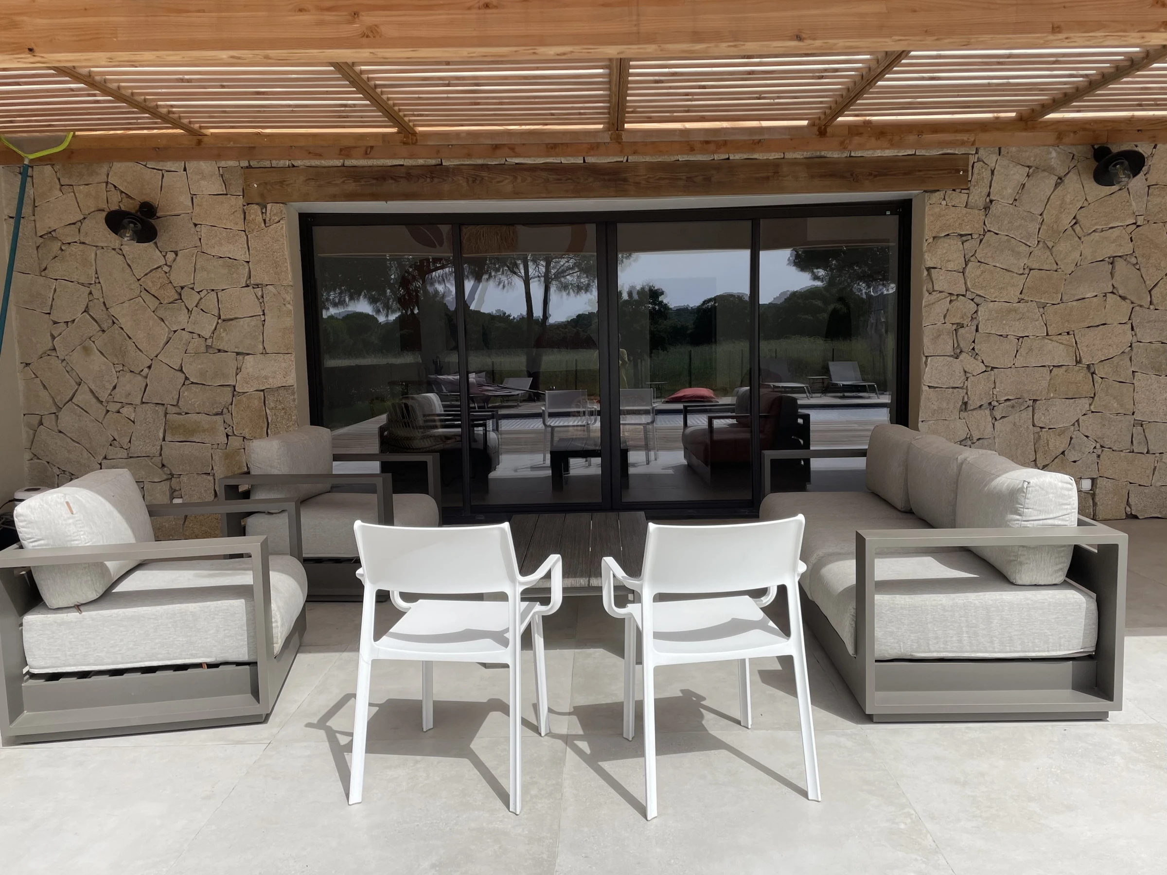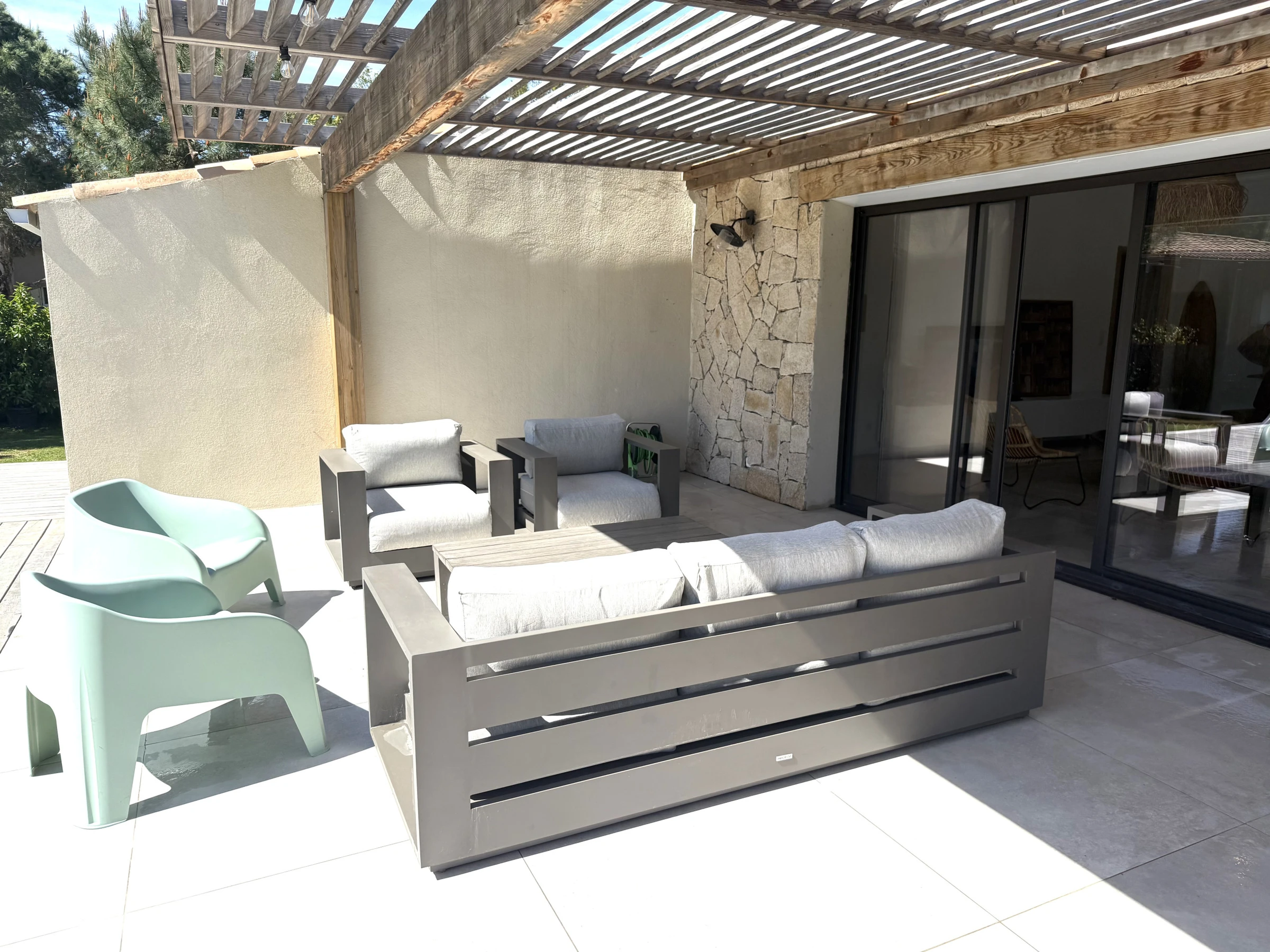 -Grande terrasse panoramique avec salon de jardin, pergola ombragée.