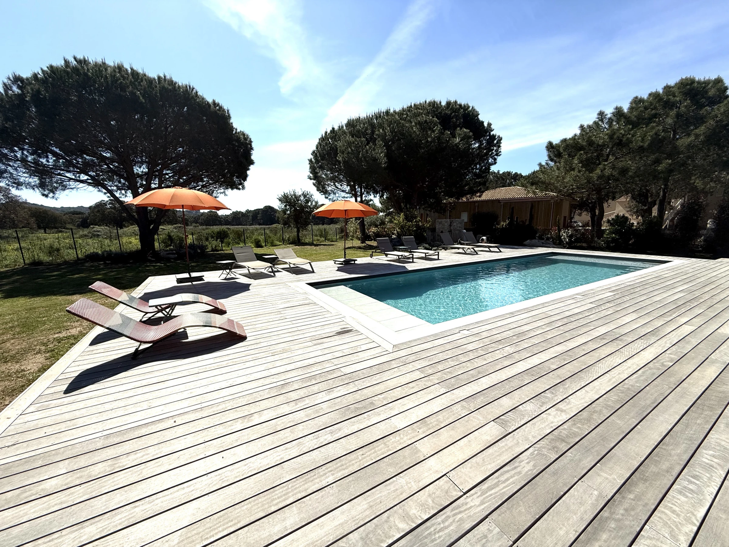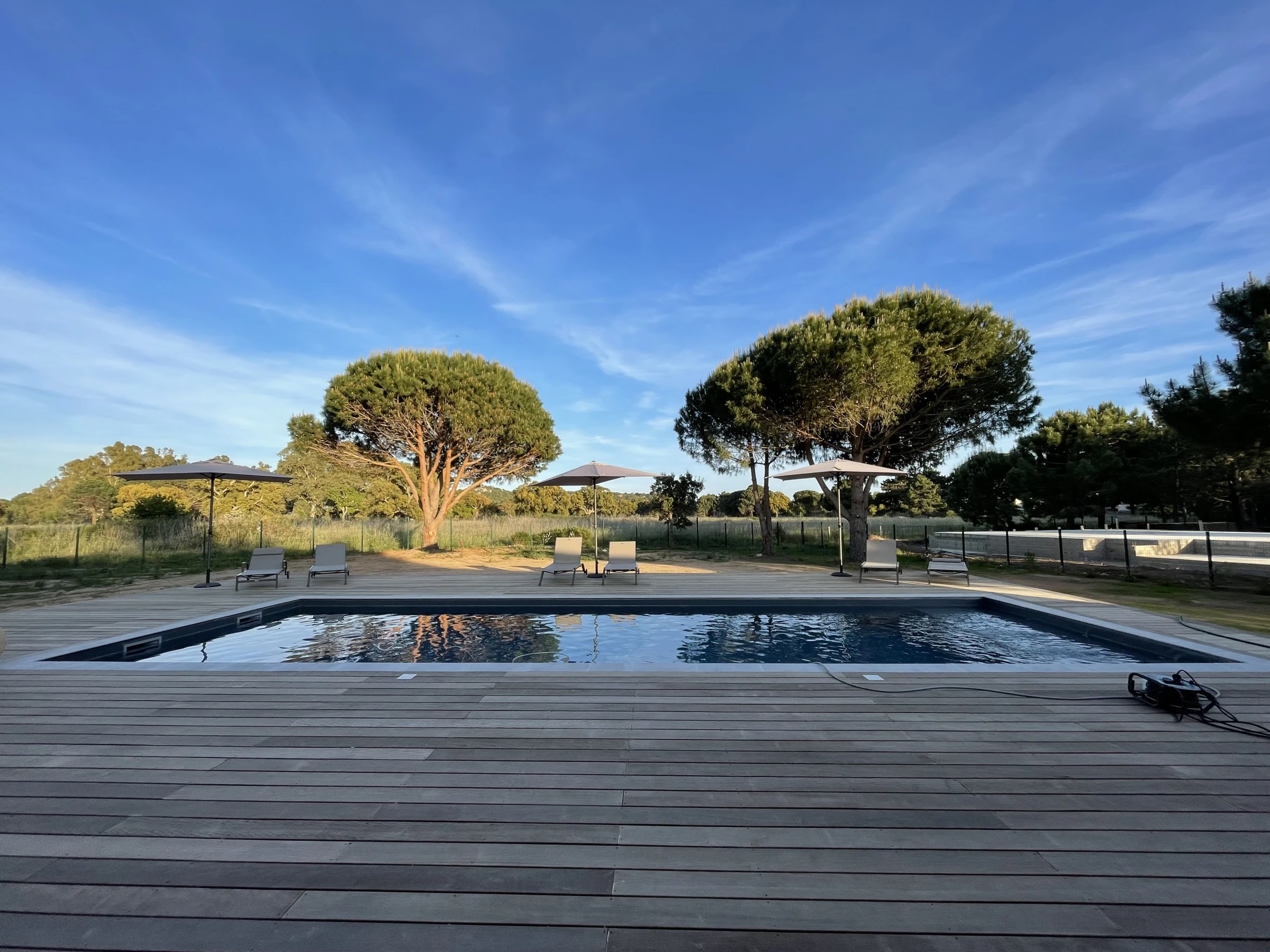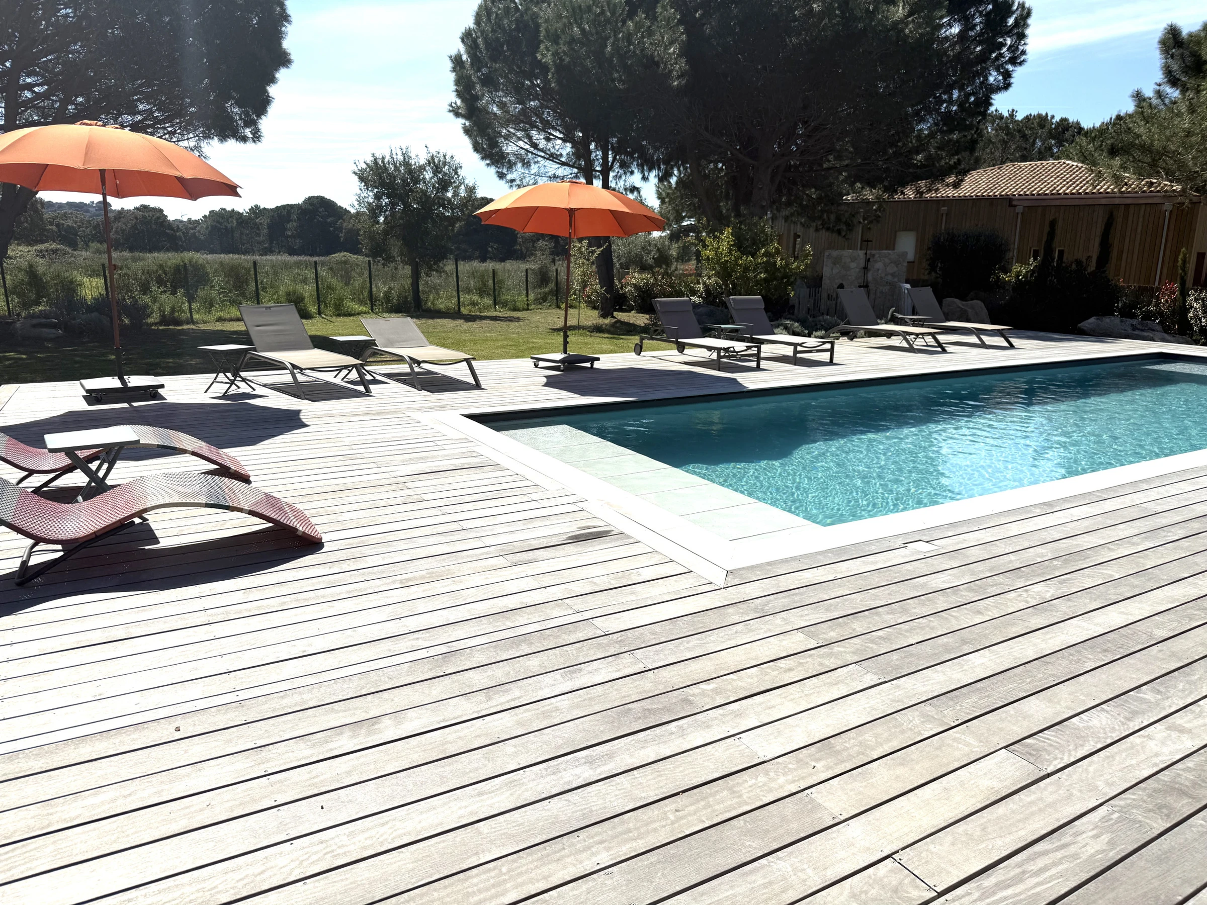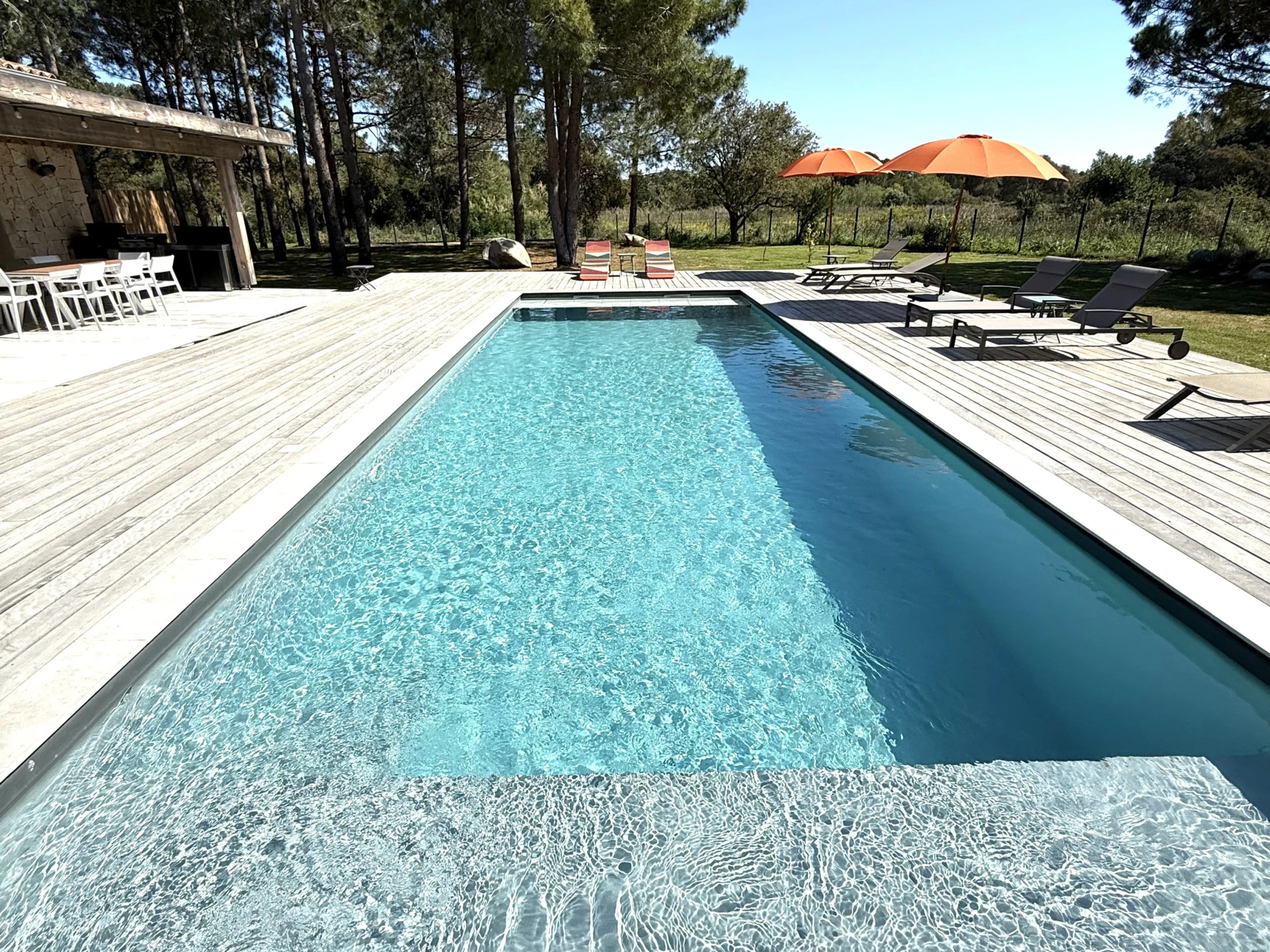 -piscine privée chauffée de belle dimension, avec transats et sécurité enfants.
