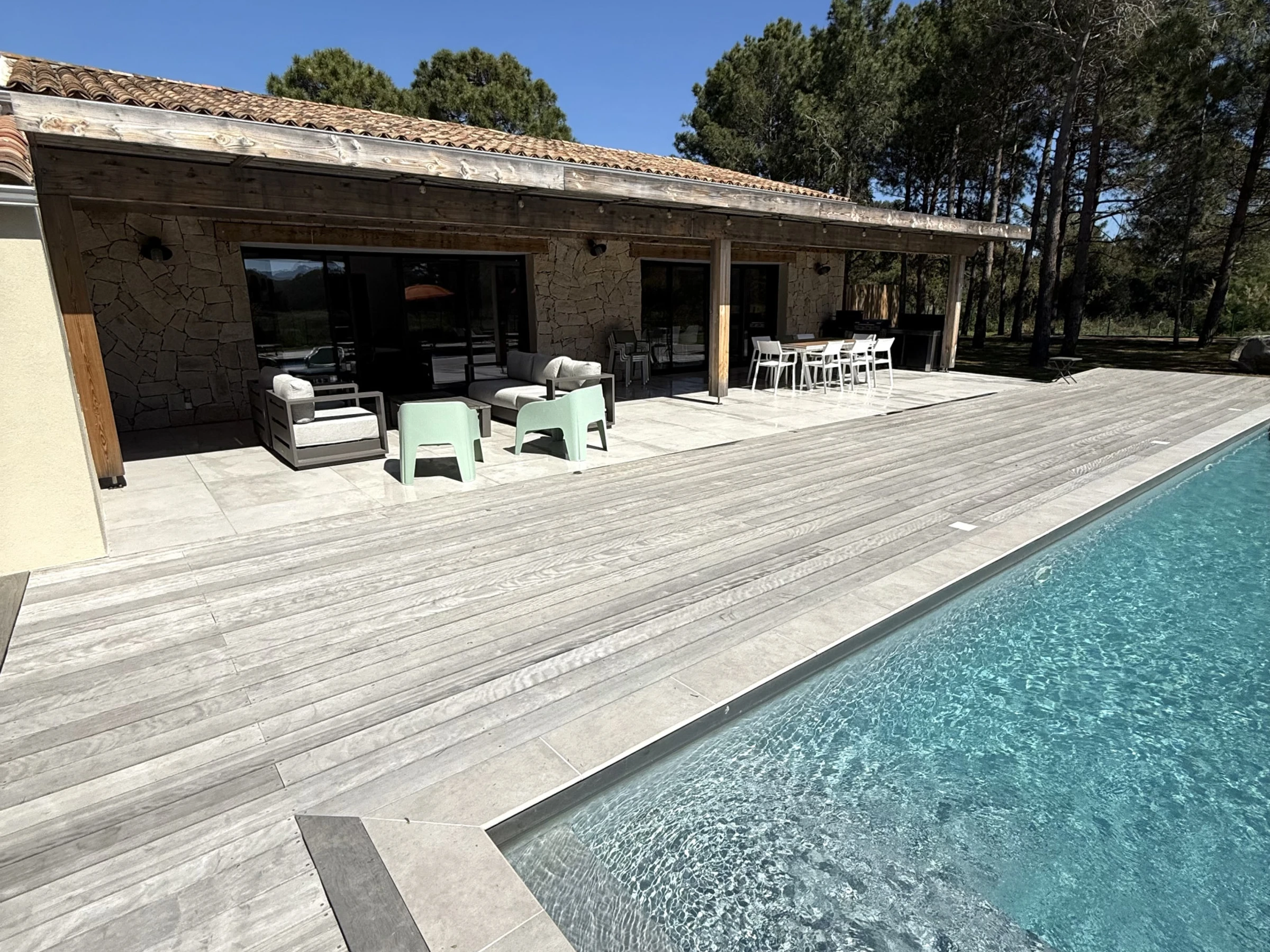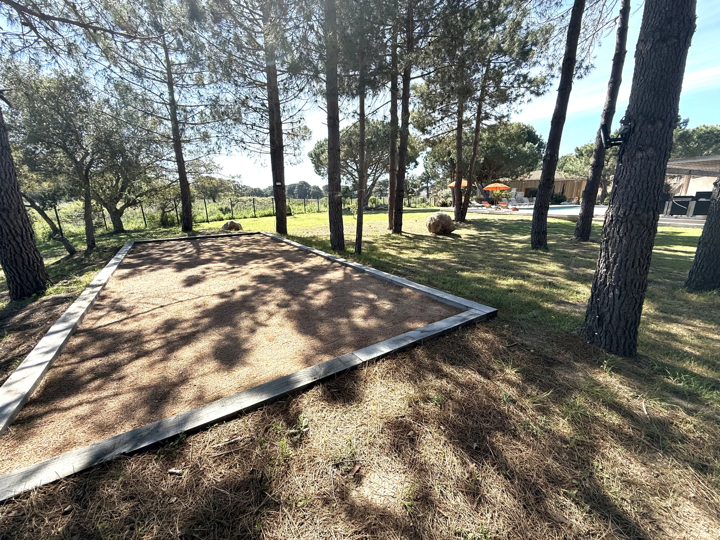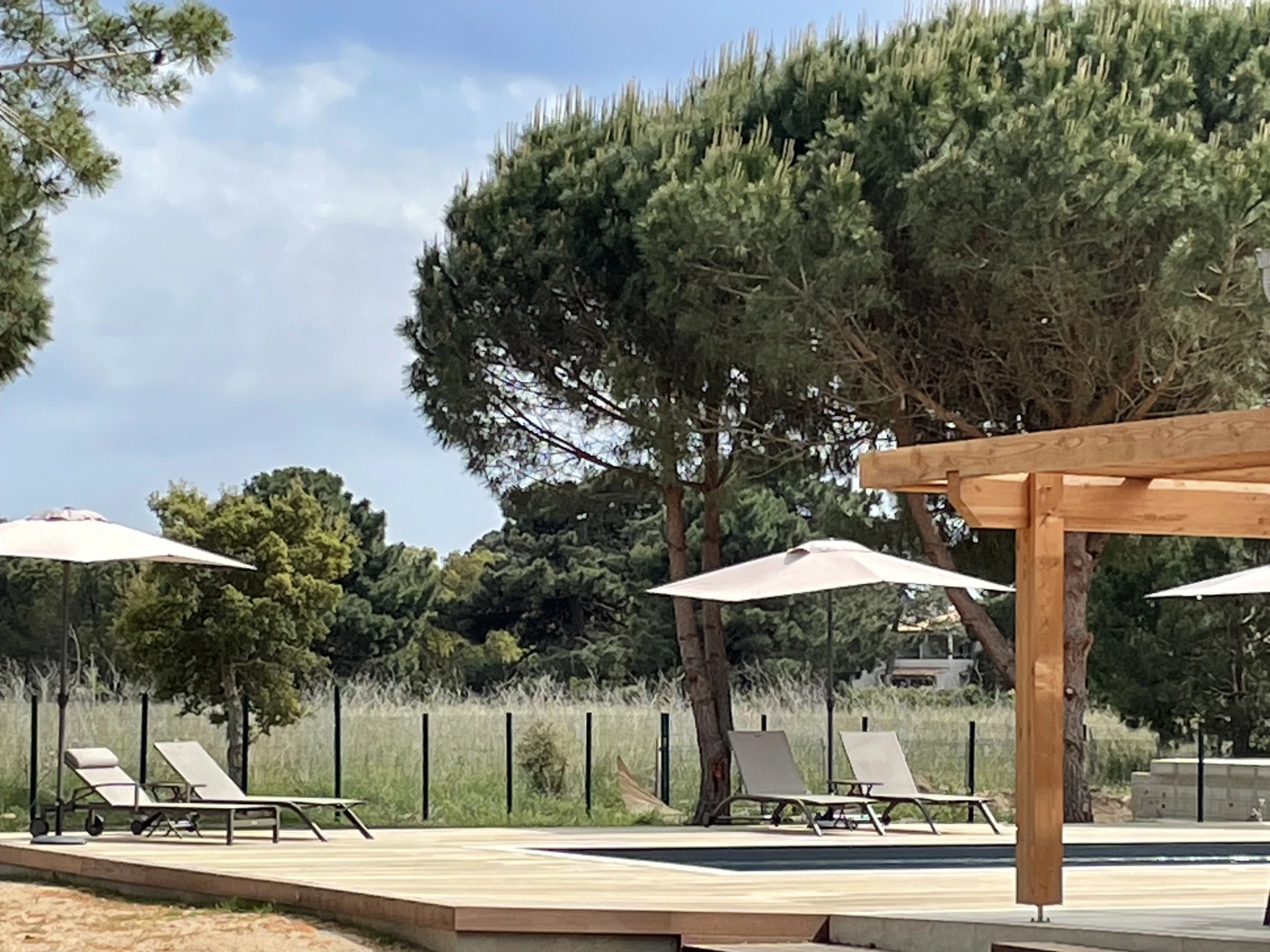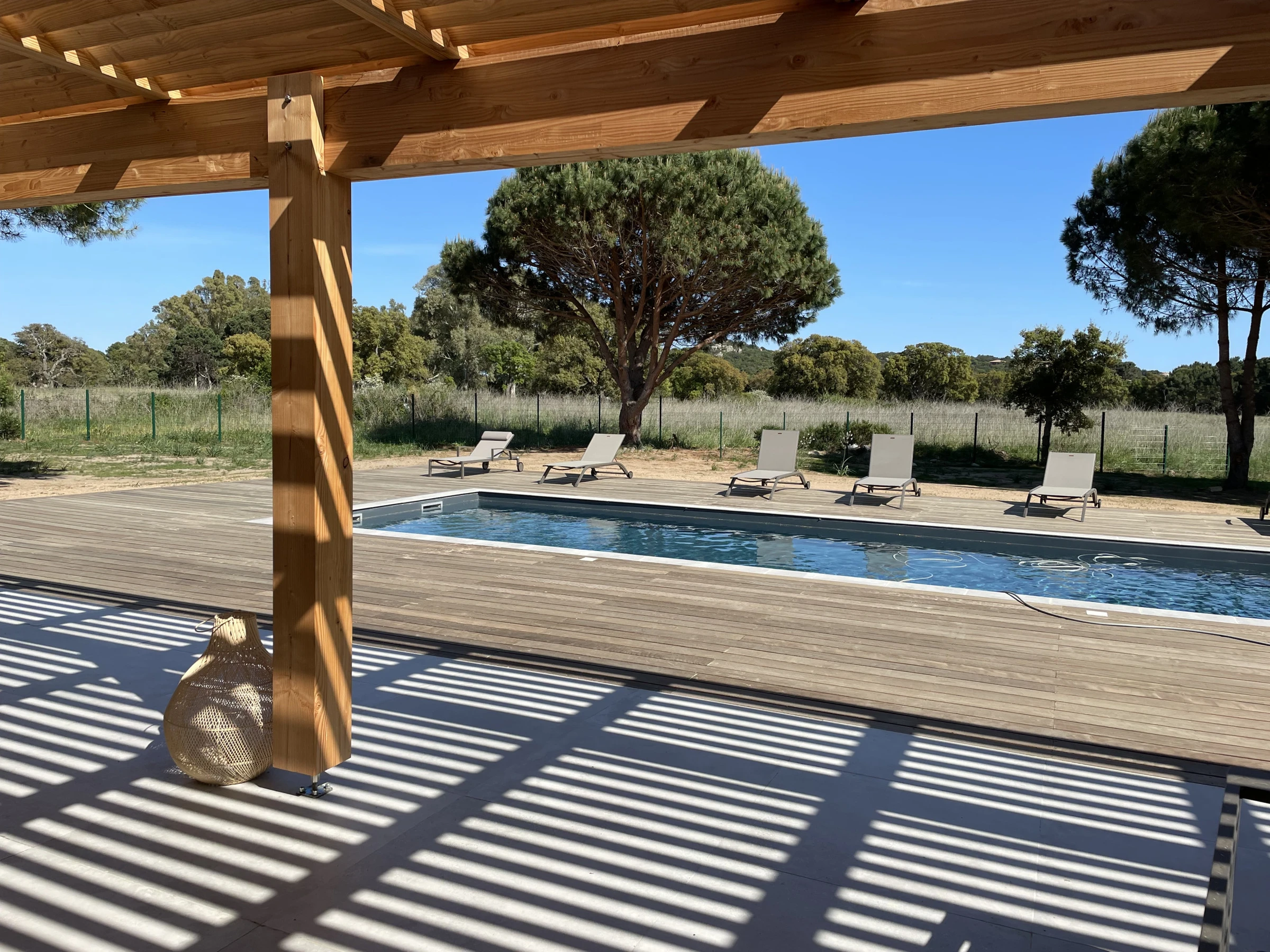 -piscine privée chauffée de belle dimension, avec transats et sécurité enfants.