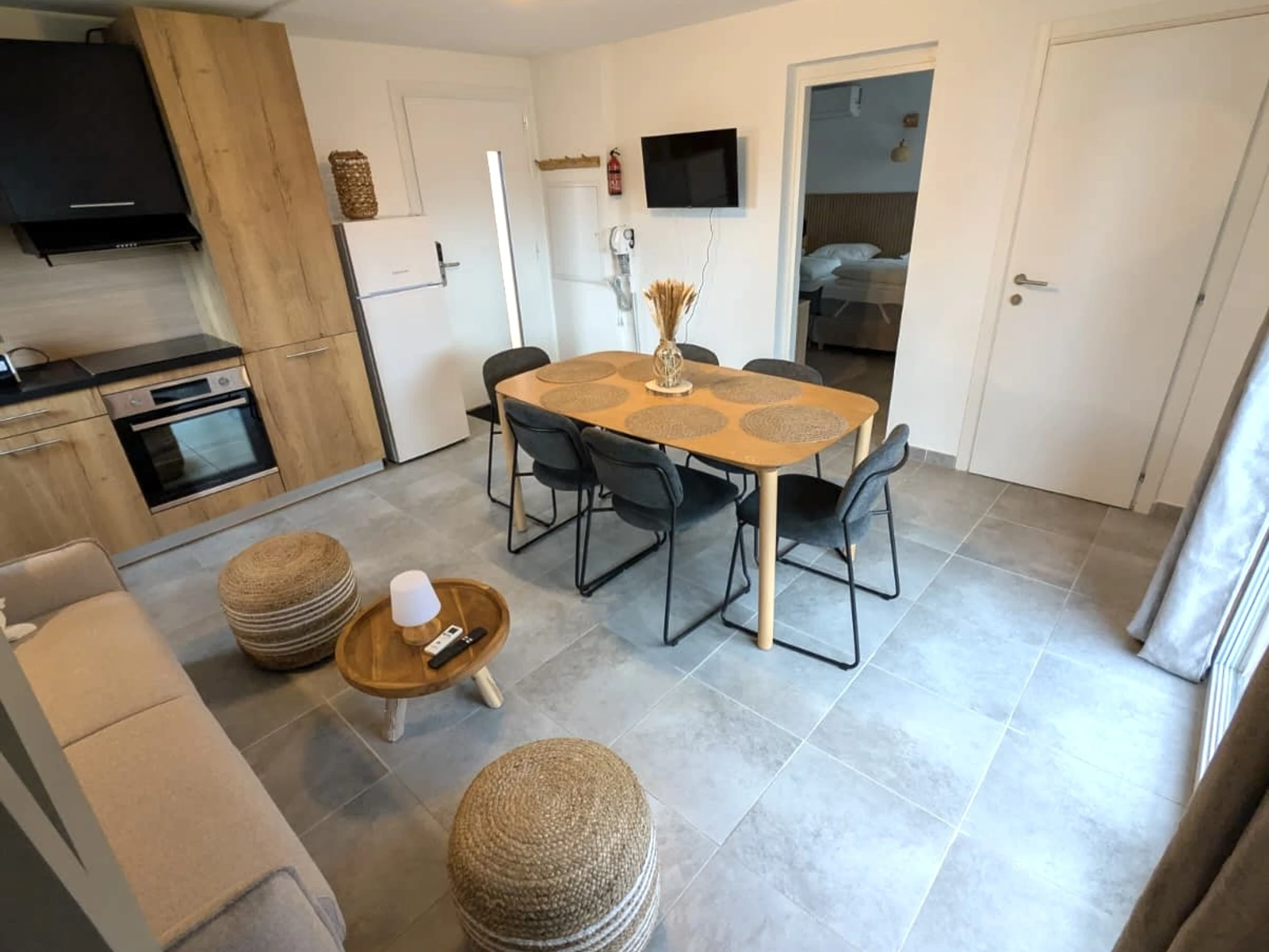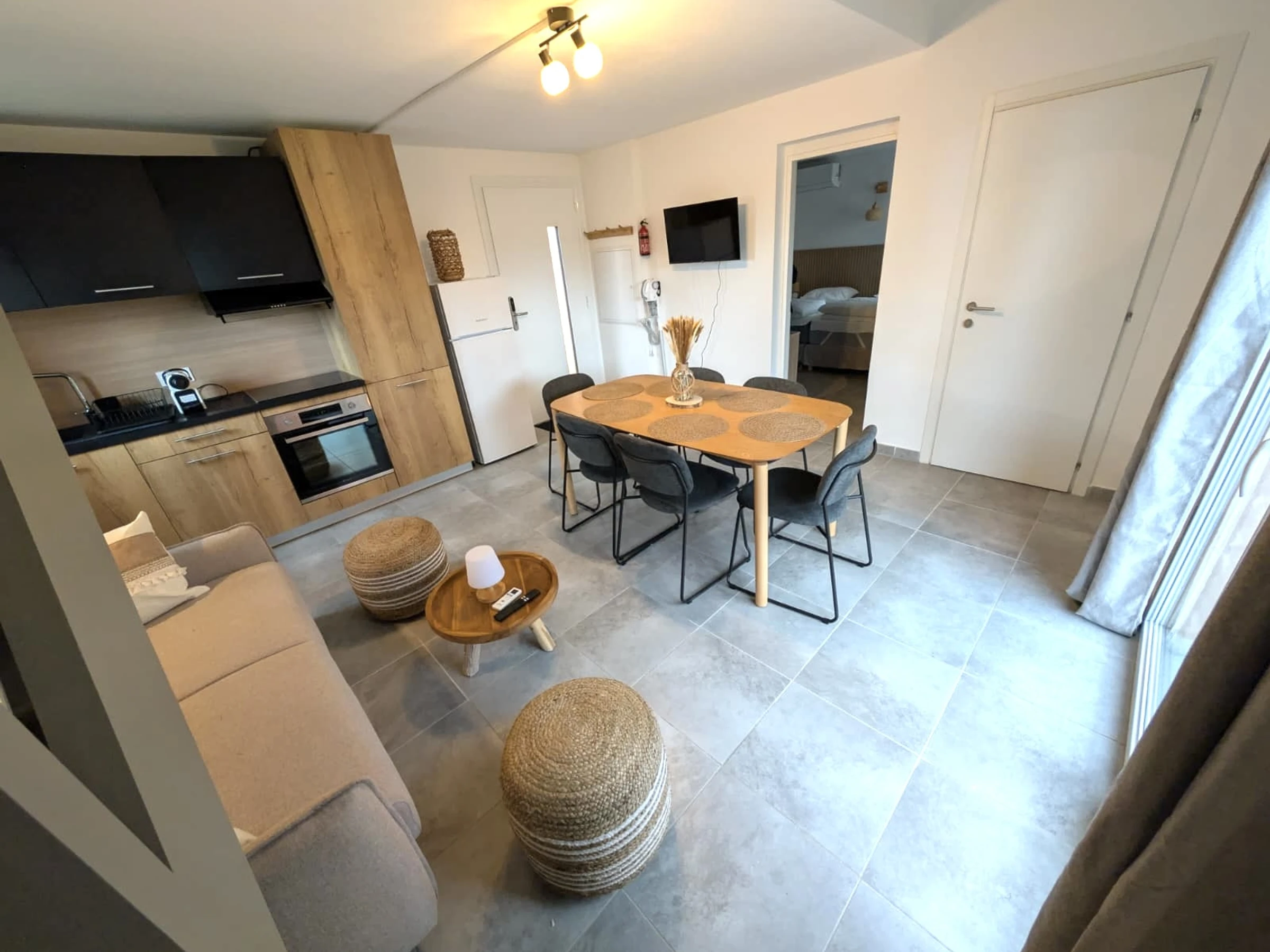 L'intérieur dispose de deux chambres confortables : l'une équipée d'un lit king size et l'autre d'un canapé-lit double, garantissant un repos optimal pour tous les occupants. La cuisine américaine entièrement équipée vous permettra de préparer de délicieux repas avec ses nombreux équipements : réfrigérateur, congélateur, four, micro-ondes, machine à café, et bien plus encore.