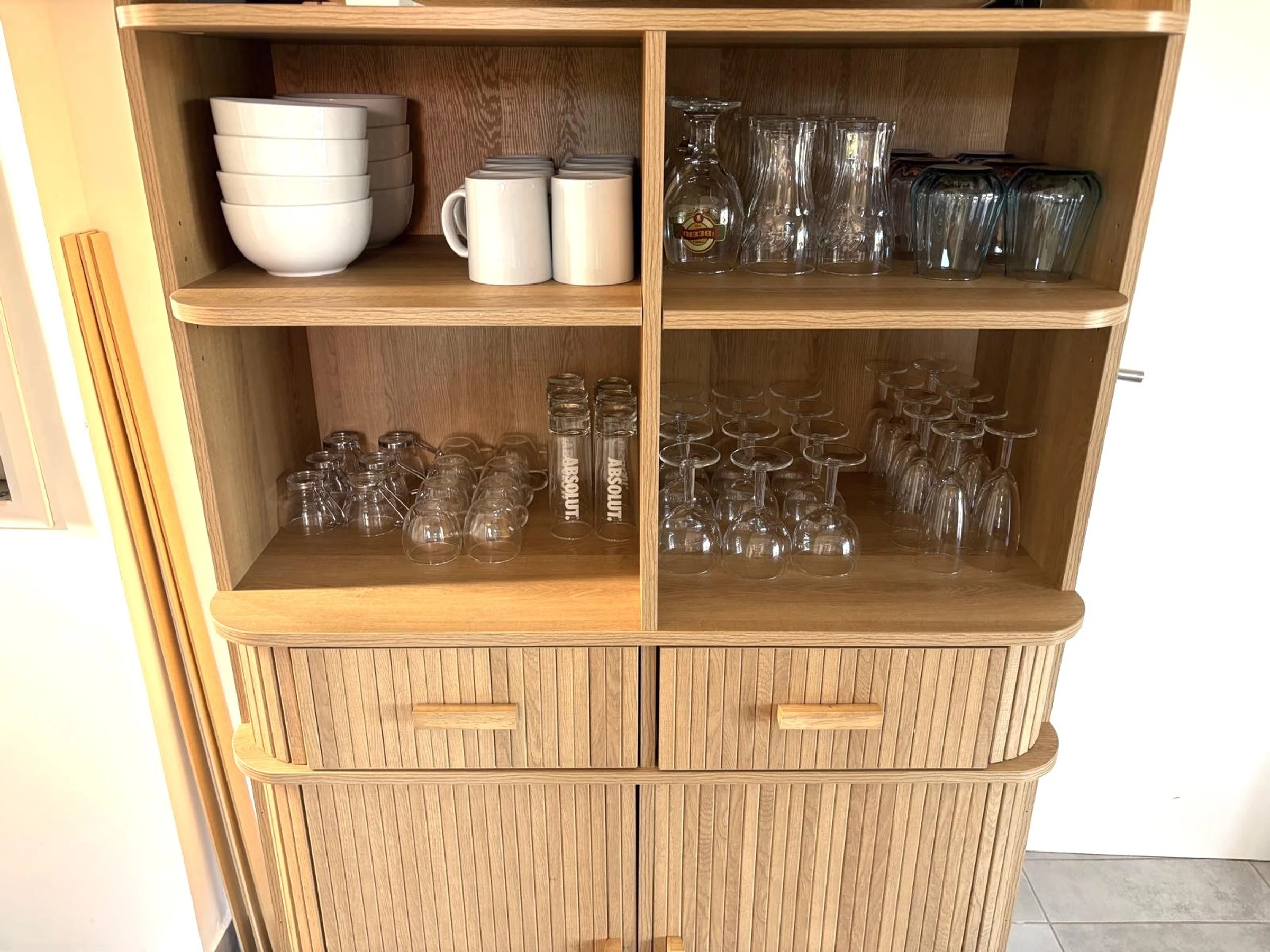 La cuisine américaine, à vitrocéramique, est équipée avec réfrigérateur, micro-ondes, four, congélateur, un lave vaiseille,vaisselle/couverts, ustensiles/cuisine et cafetière Nespresso , grille pain et bouilloire.Télévision.