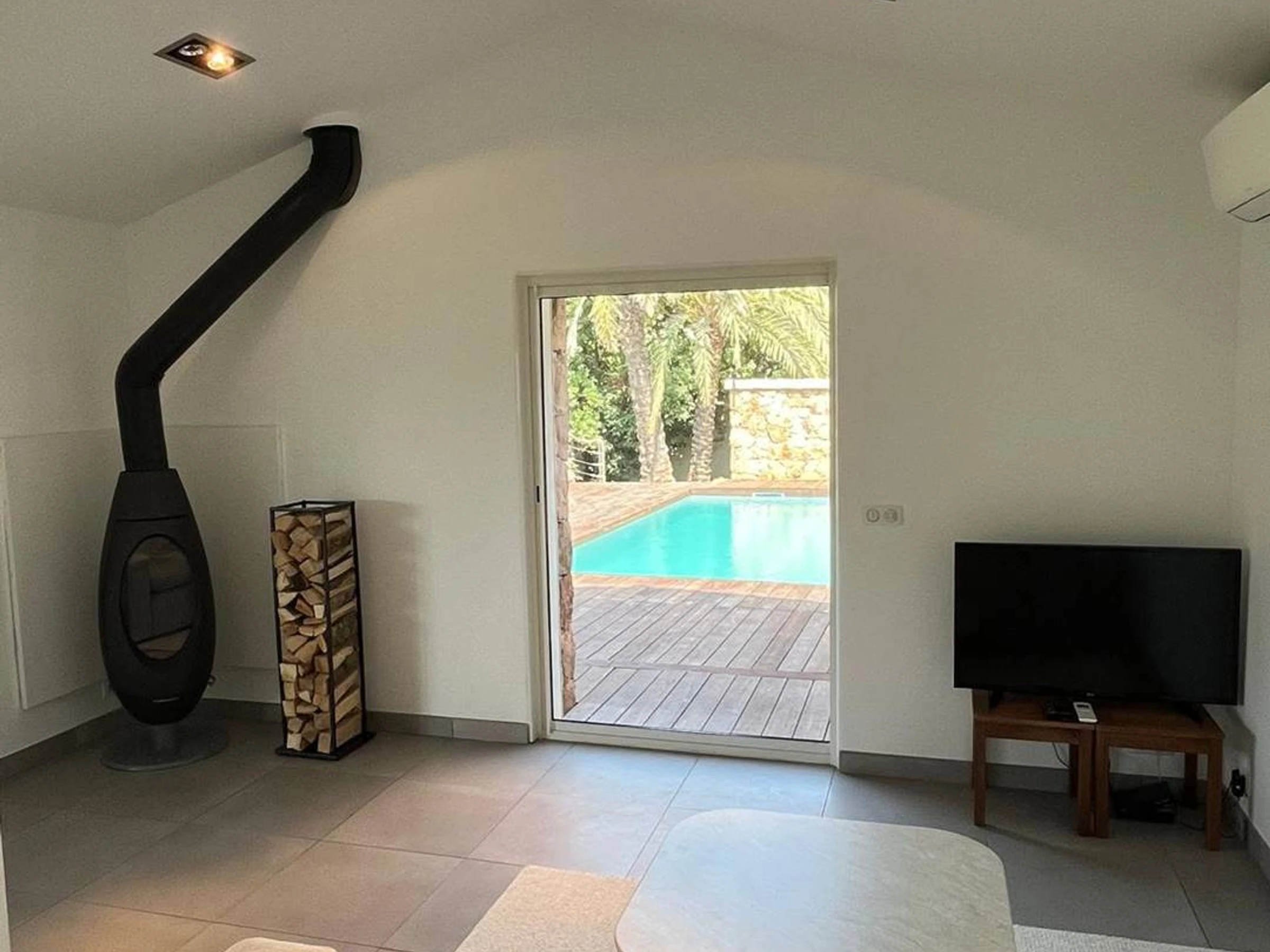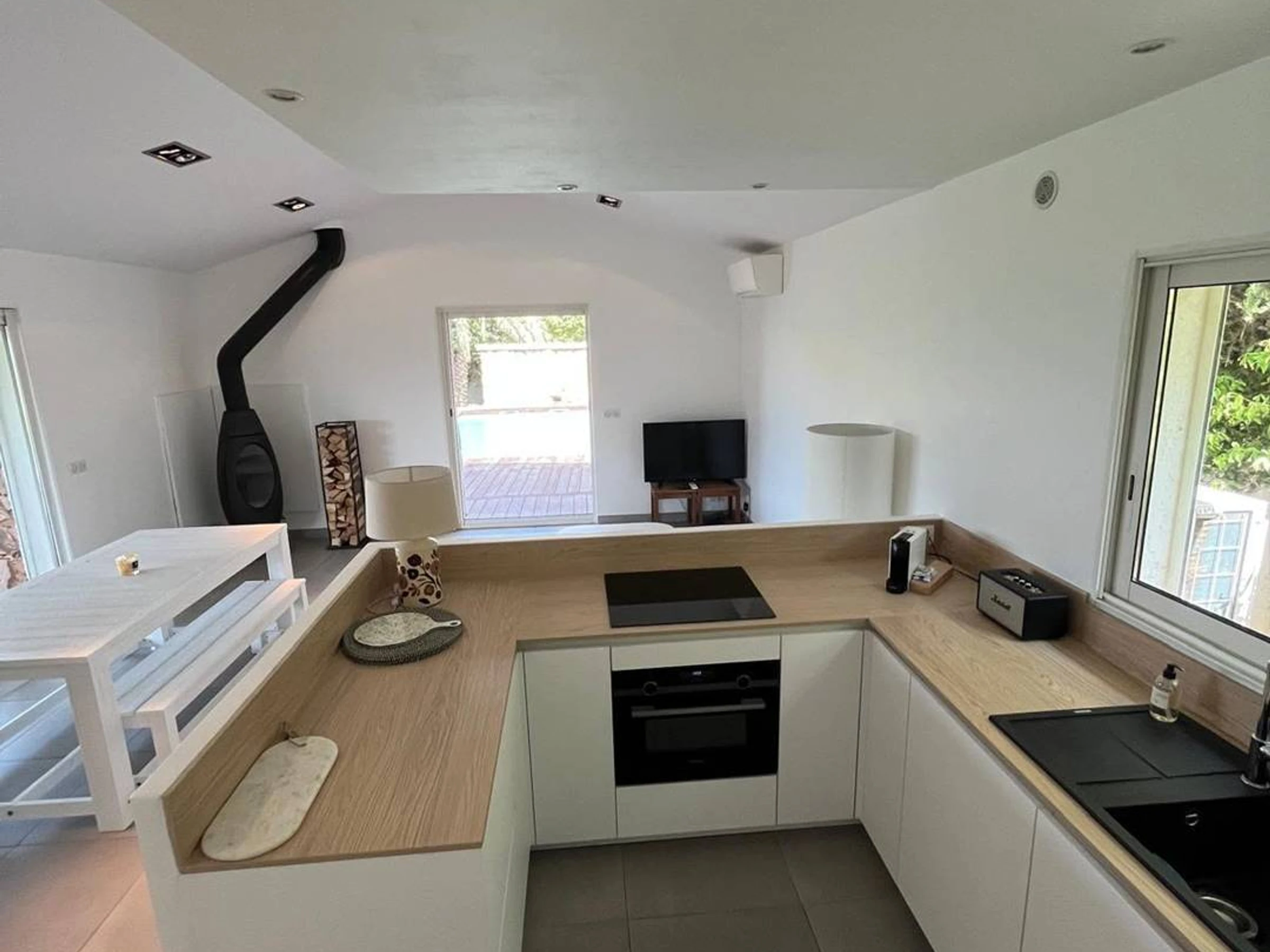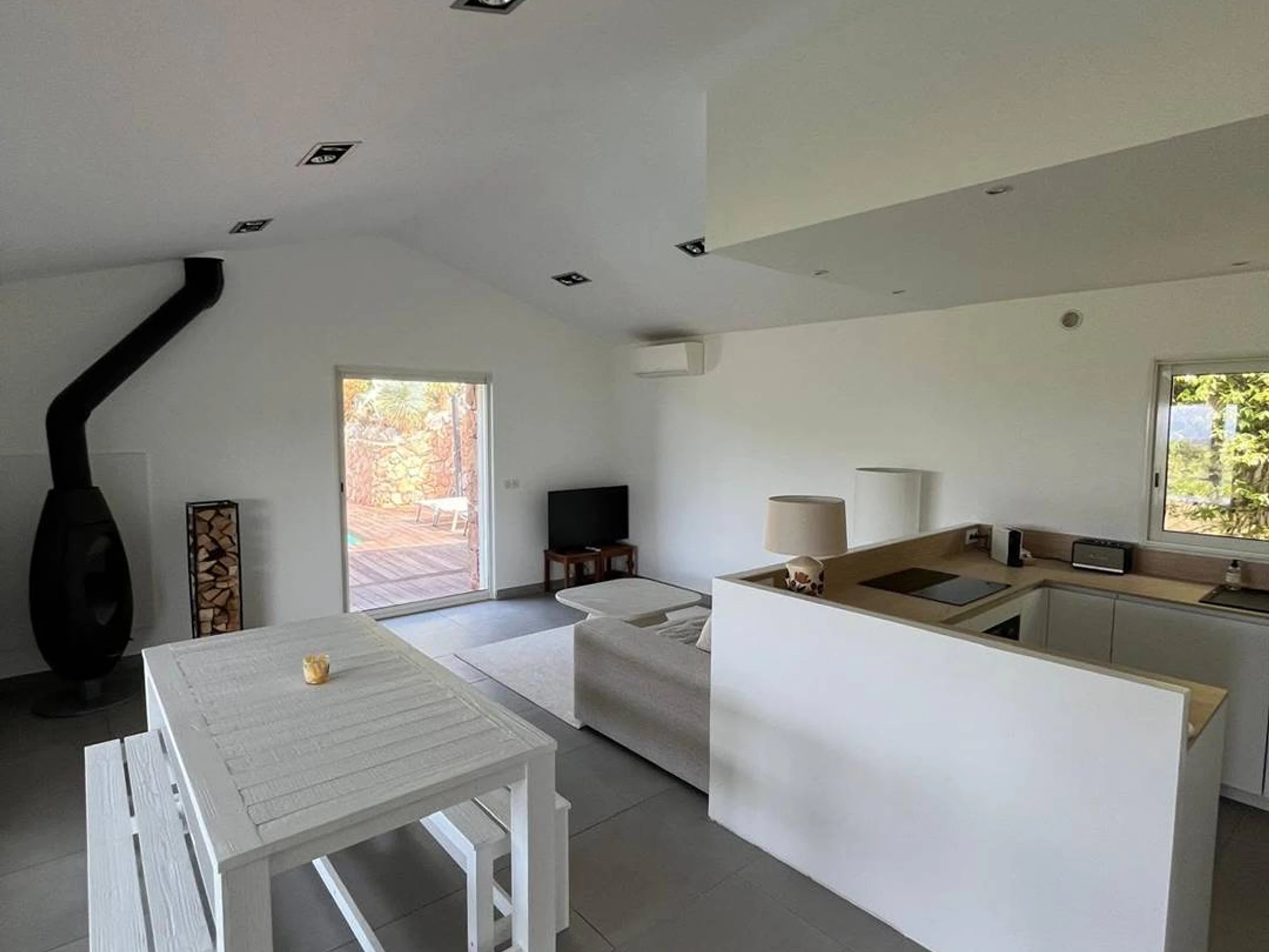 Séjour - salon - cuisine américaine : baies vitrées - accès terrasse face à la vallée et ses vignobles - accès autre terrasse et piscine - climatisation réversible (chauf/froid) : canapé, télévision (française, TNT), .... réfrigérateur, plaque de cuisson (vitrocéramique), four (électrique) + micro-onde, hotte aspirante, lave-vaisselle, cafetière, .... aspirateur, table et fer à repasser.