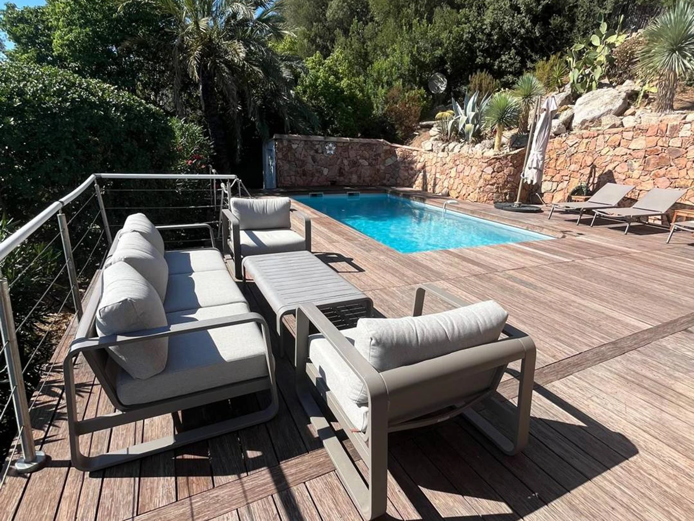Terrasse 2 - côté piscine : salon de jardin, bains de soleil