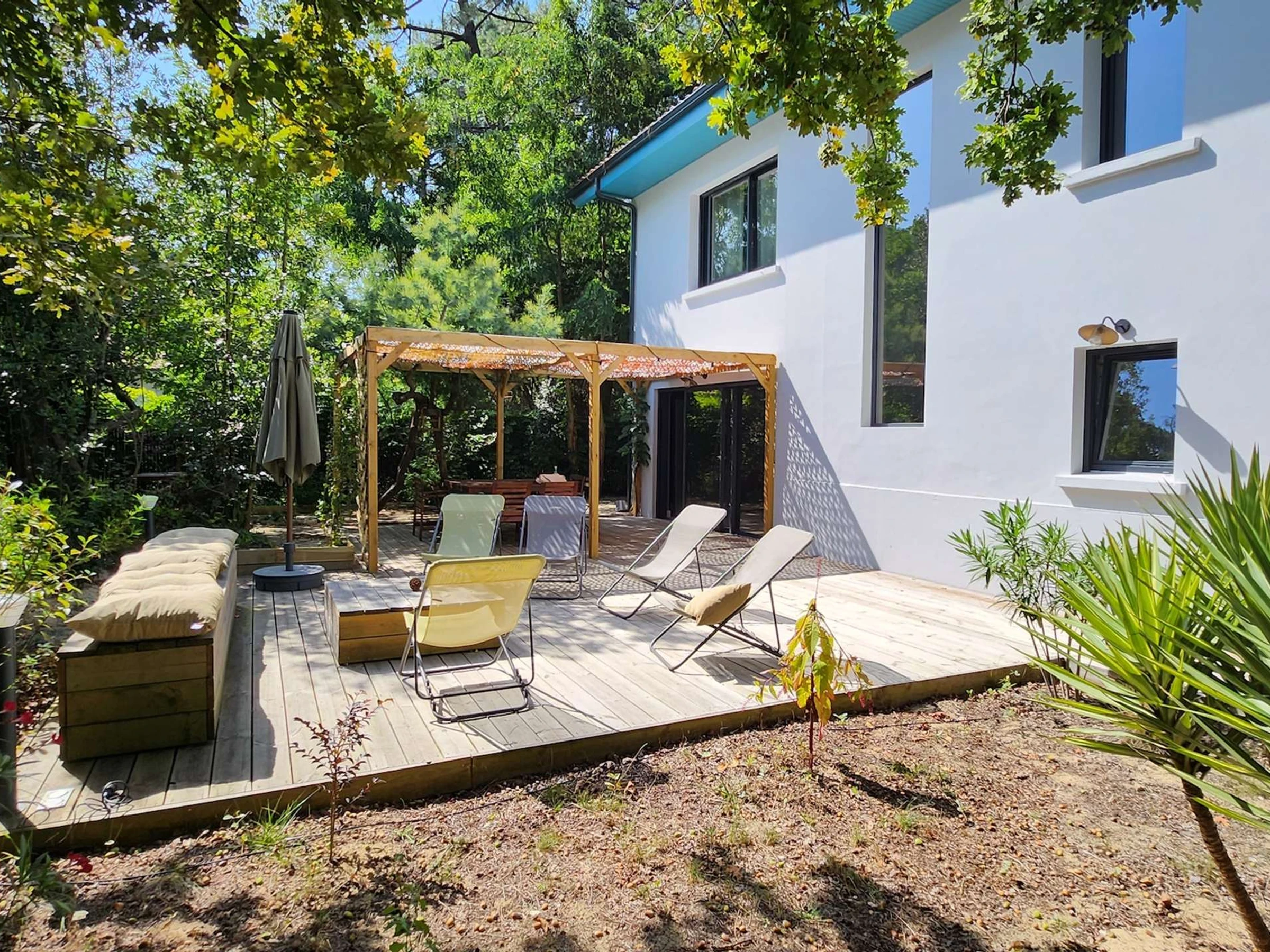 Elle est entourée d'un superbe jardin clos et arboré de 800 m², comprenant une agréable terrasse aménagée, une pergola, une plancha/barbecue WEBER au gaz, ainsi qu'une douche extérieure avec eau chaude et froide idéale pour le retour de plage.